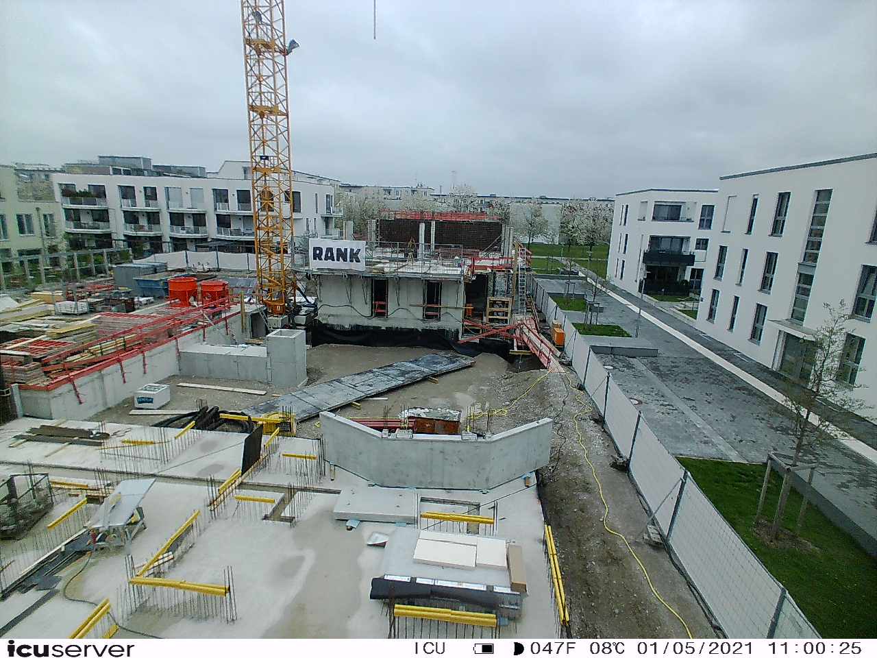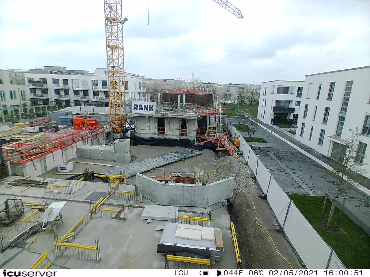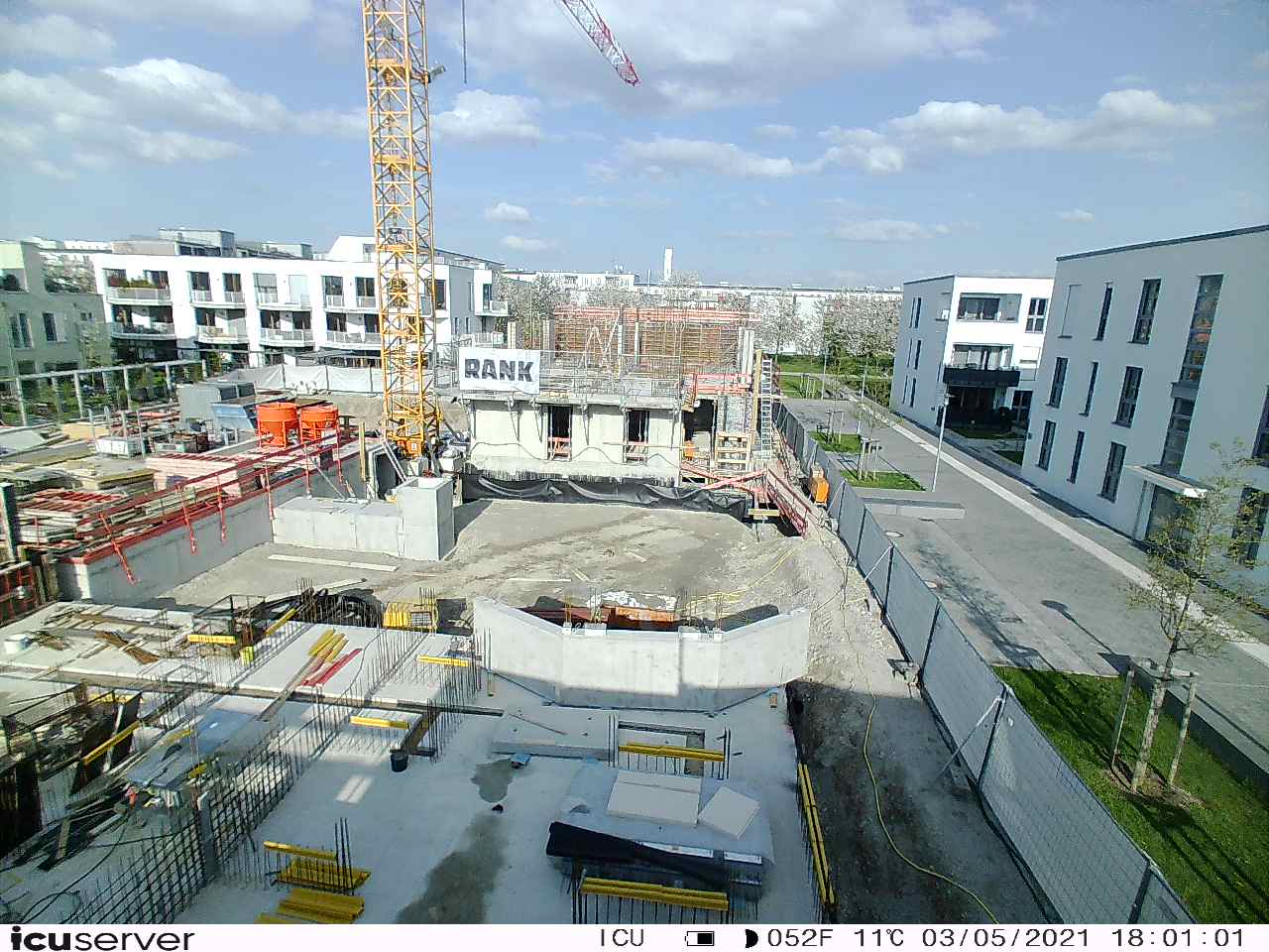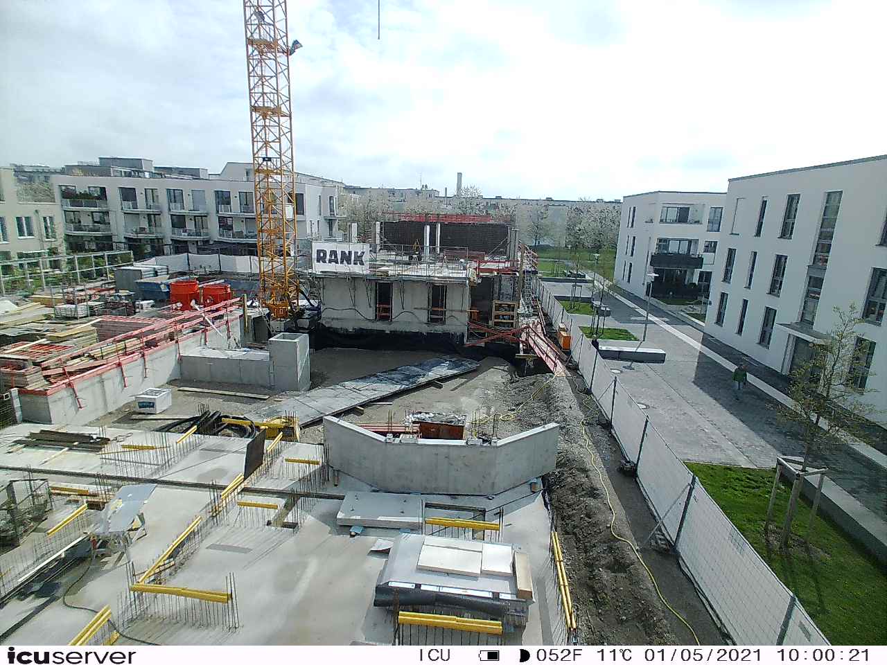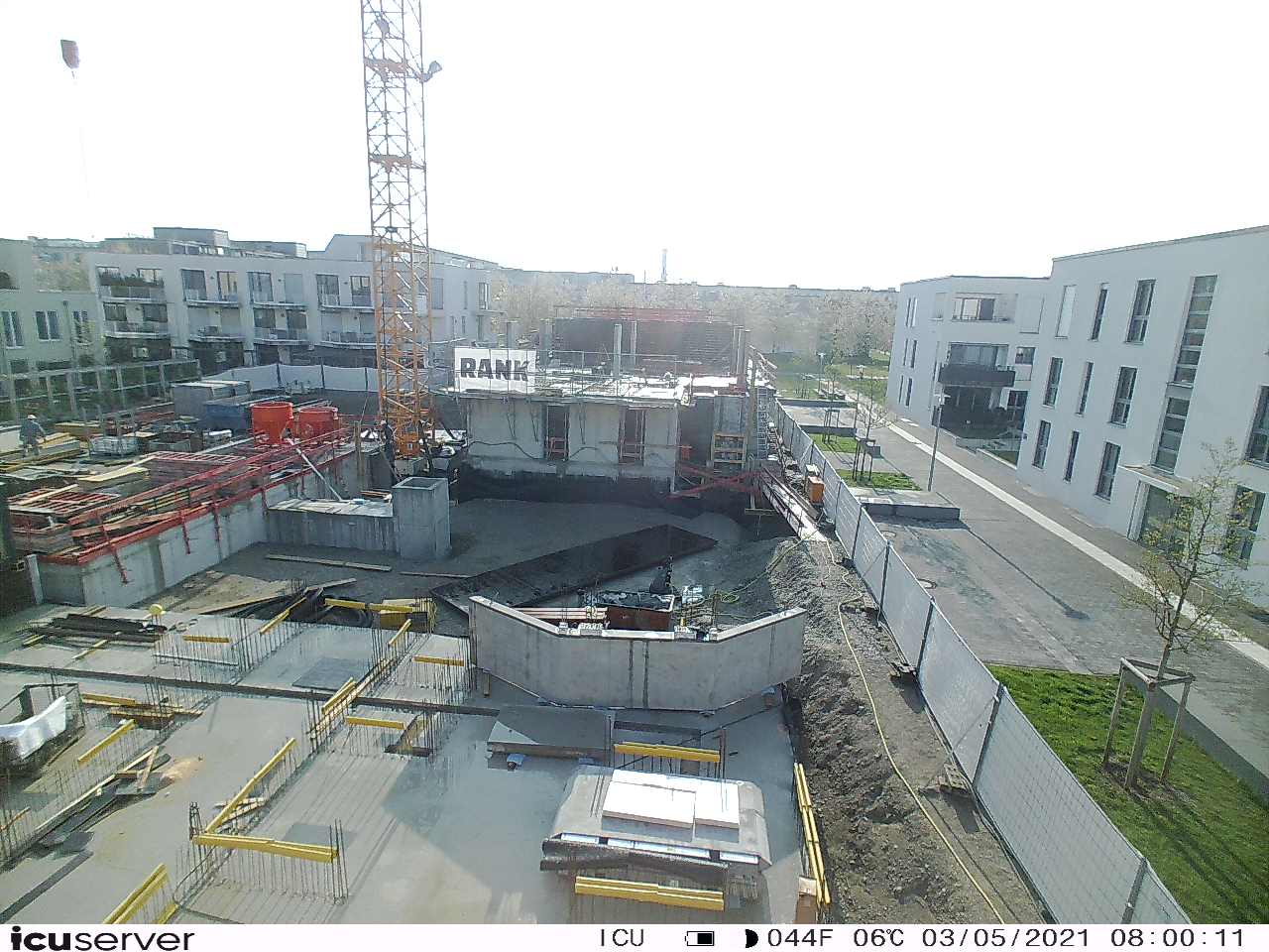 Die Kamera steht am westlichen Ende der Baustelle. Sie blickt nach Osten. Bilder: 26. Februar - 13. August 2021.