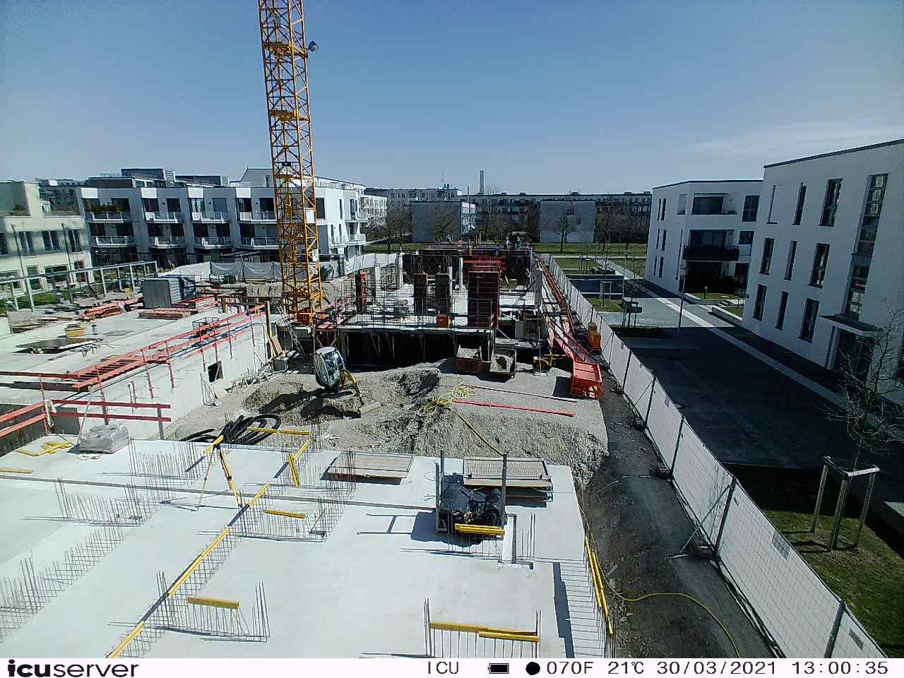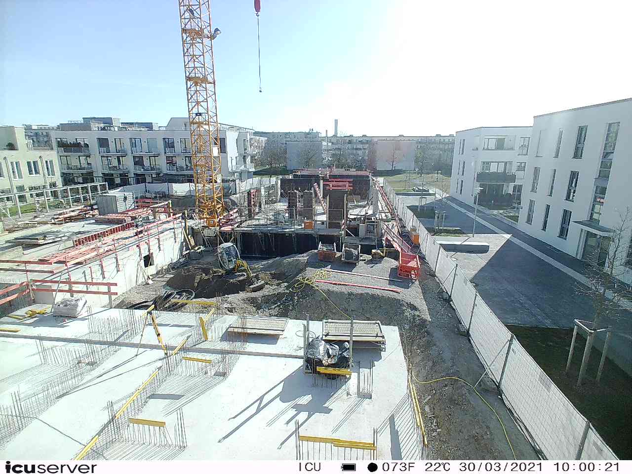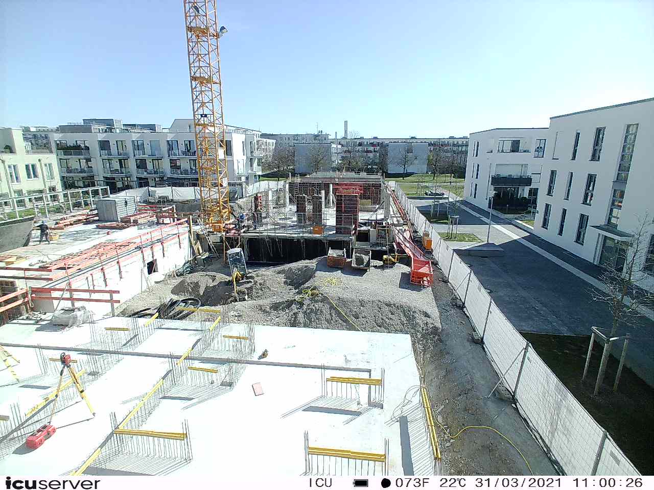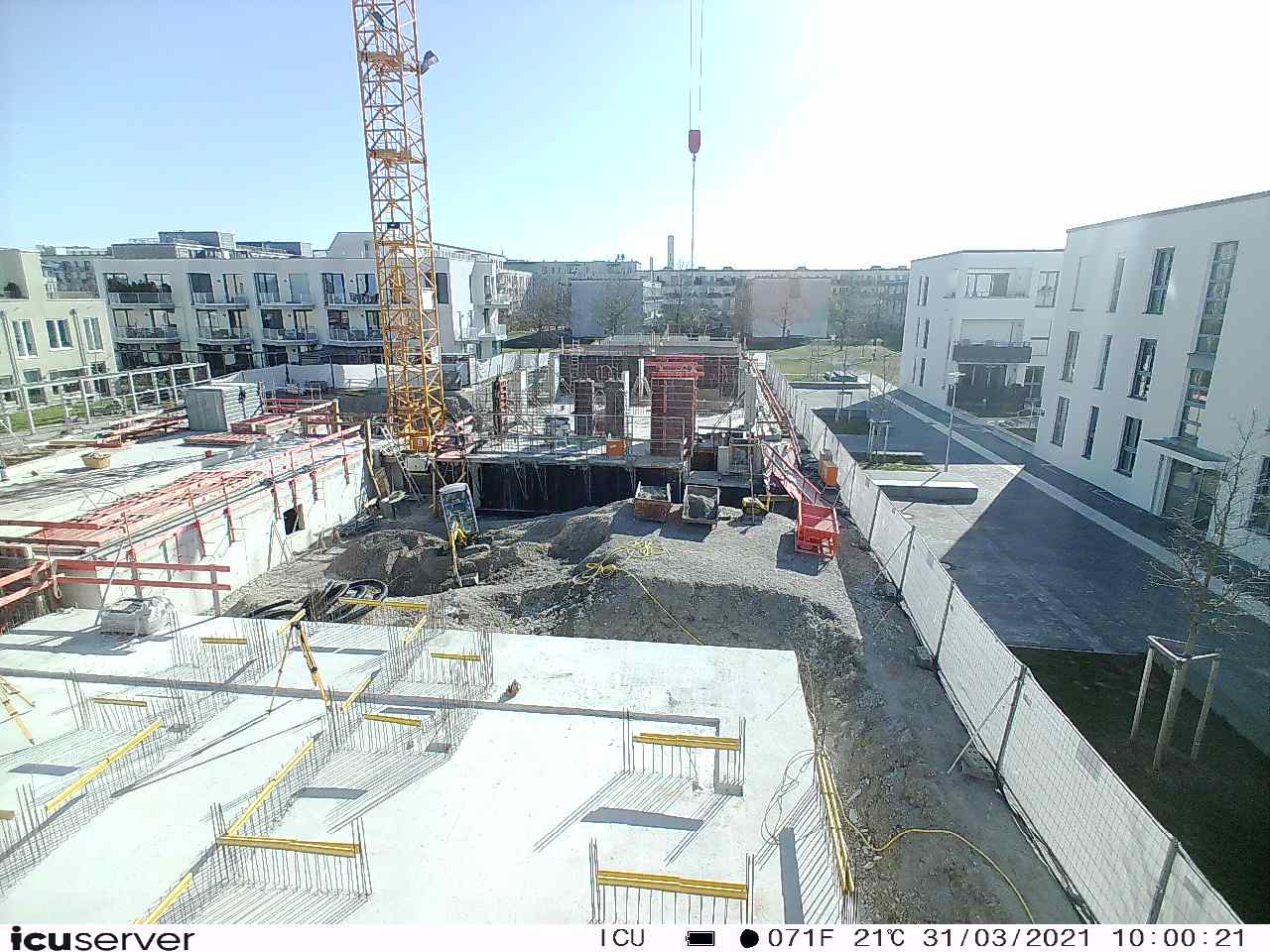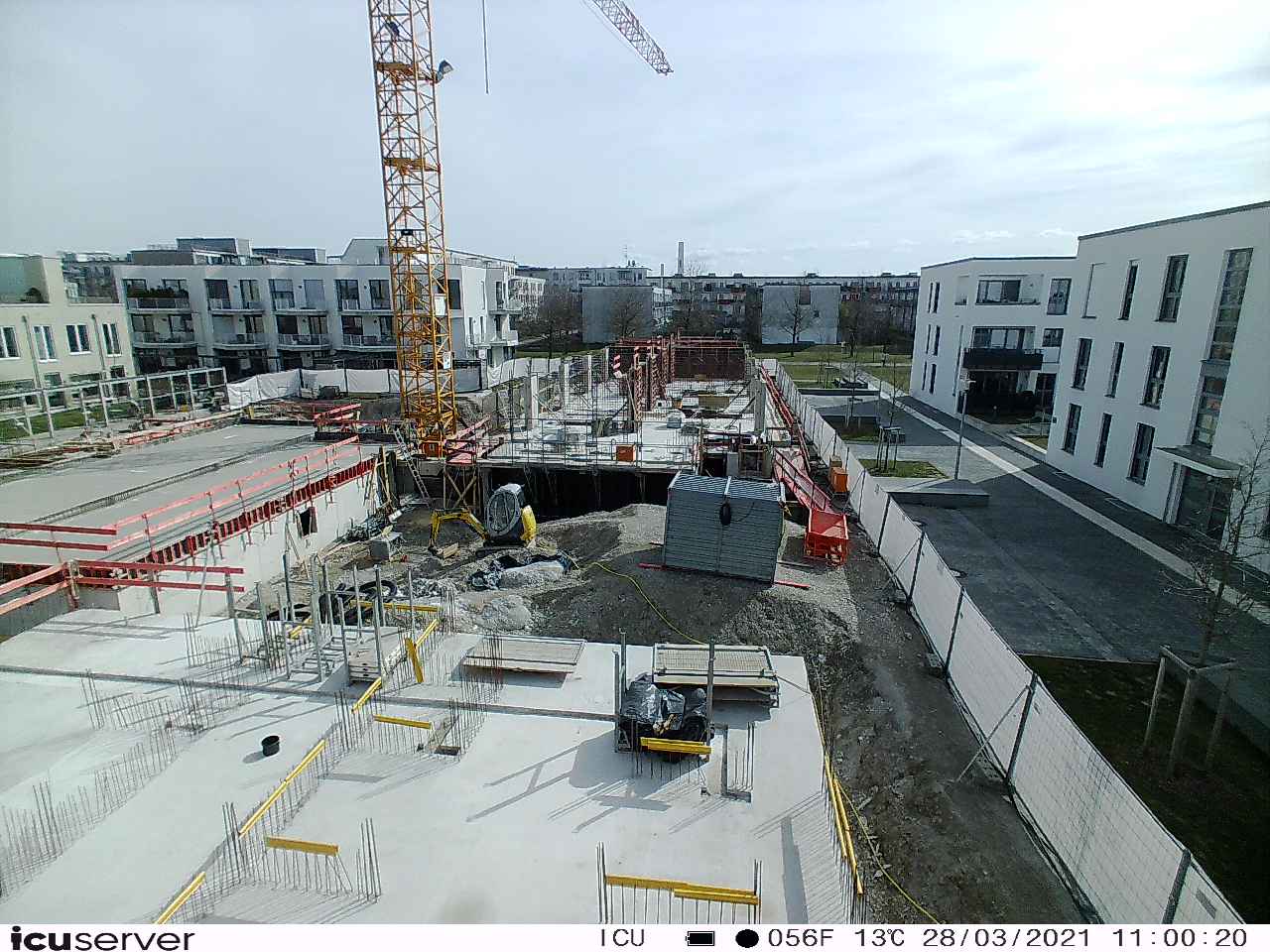 Die Kamera steht am westlichen Ende der Baustelle. Sie blickt nach Osten. Bilder: 26. Februar - 13. August 2021.
