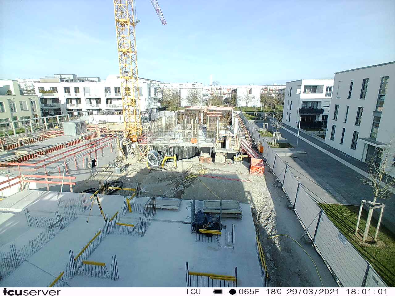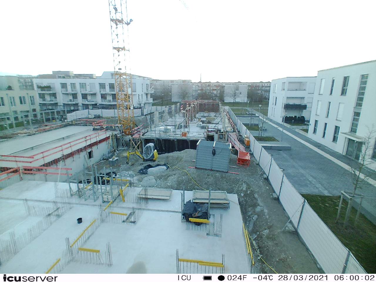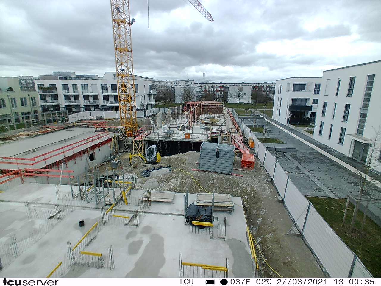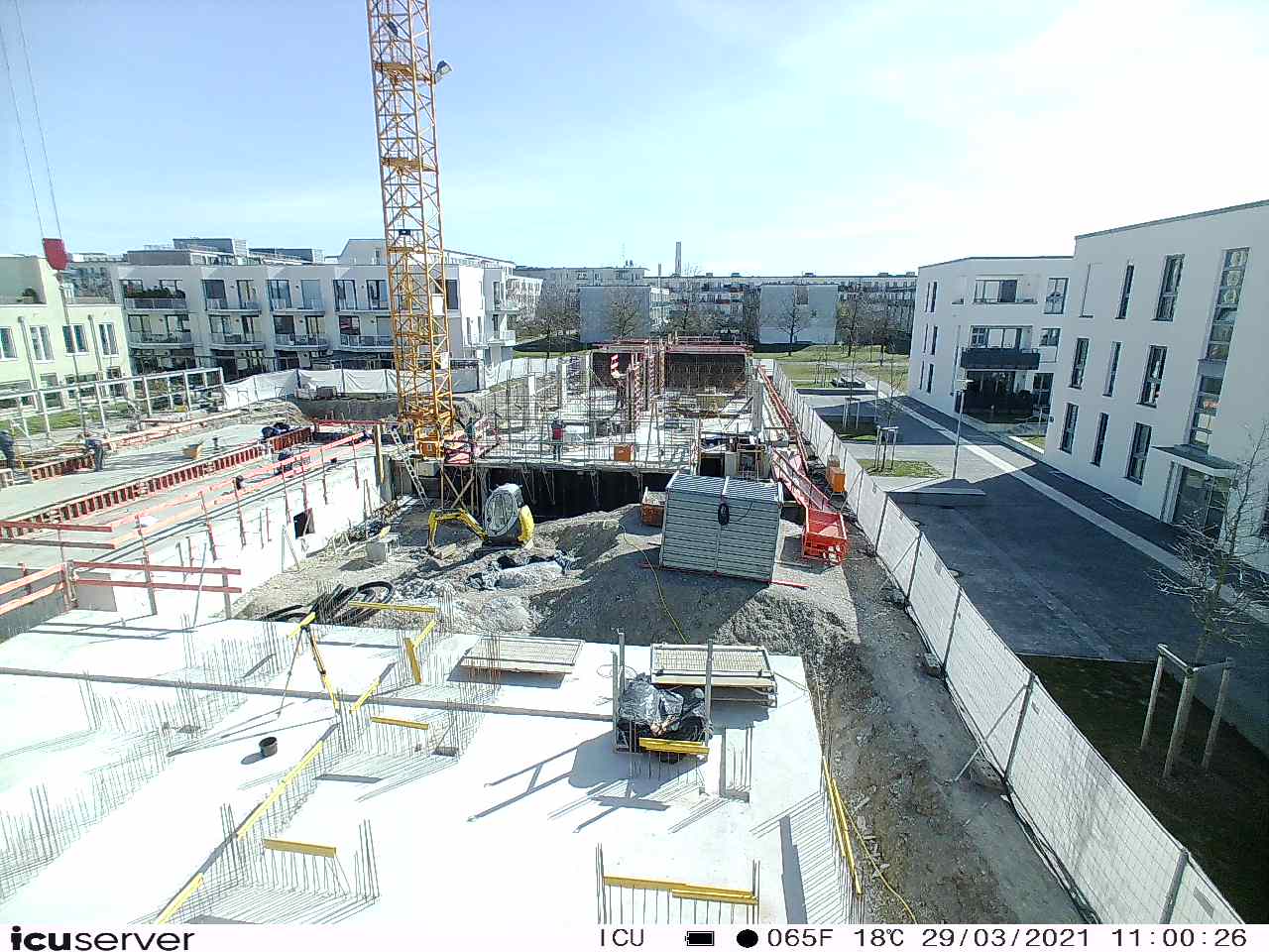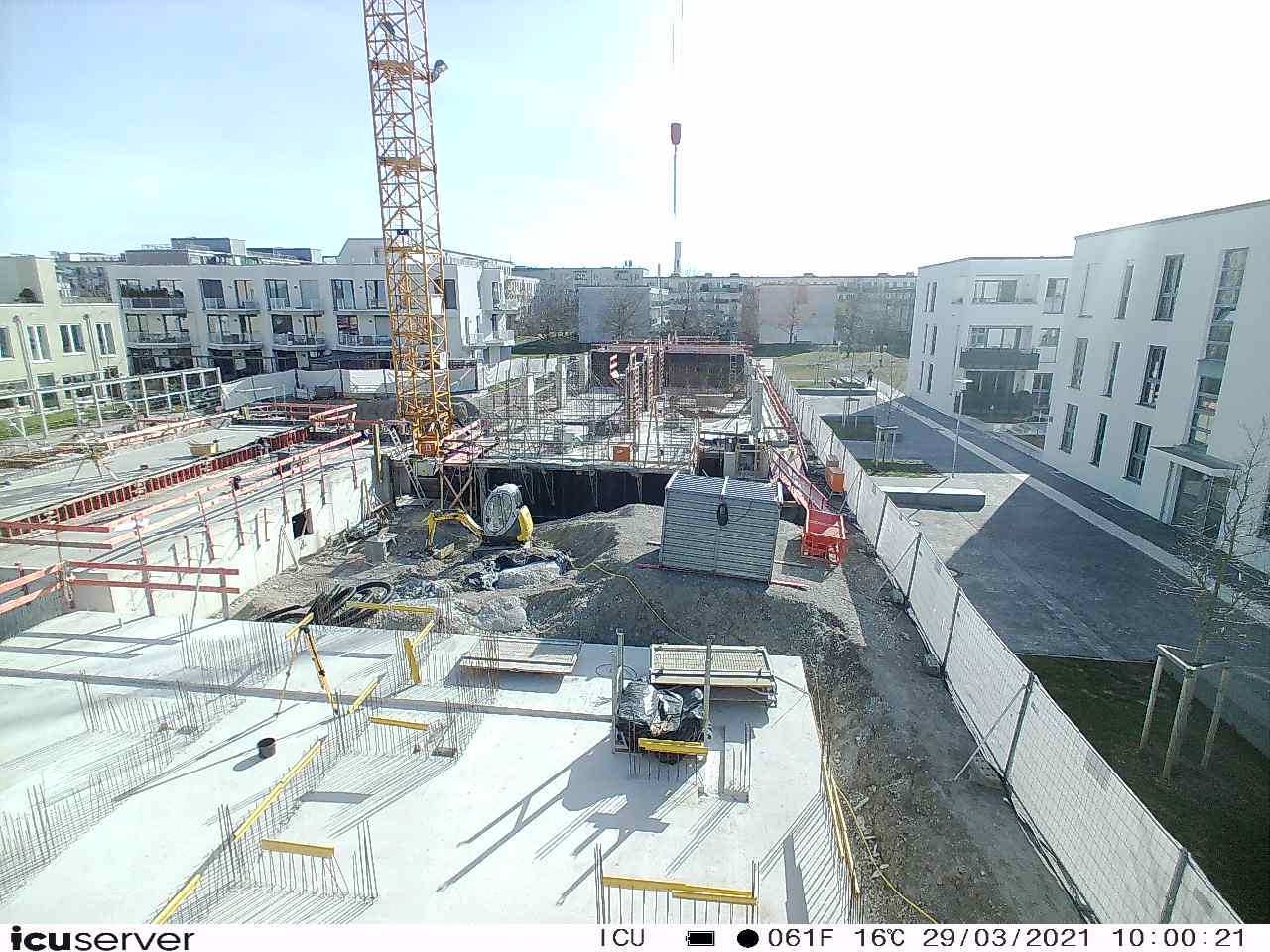 Die Kamera steht am westlichen Ende der Baustelle. Sie blickt nach Osten. Bilder: 26. Februar - 13. August 2021.