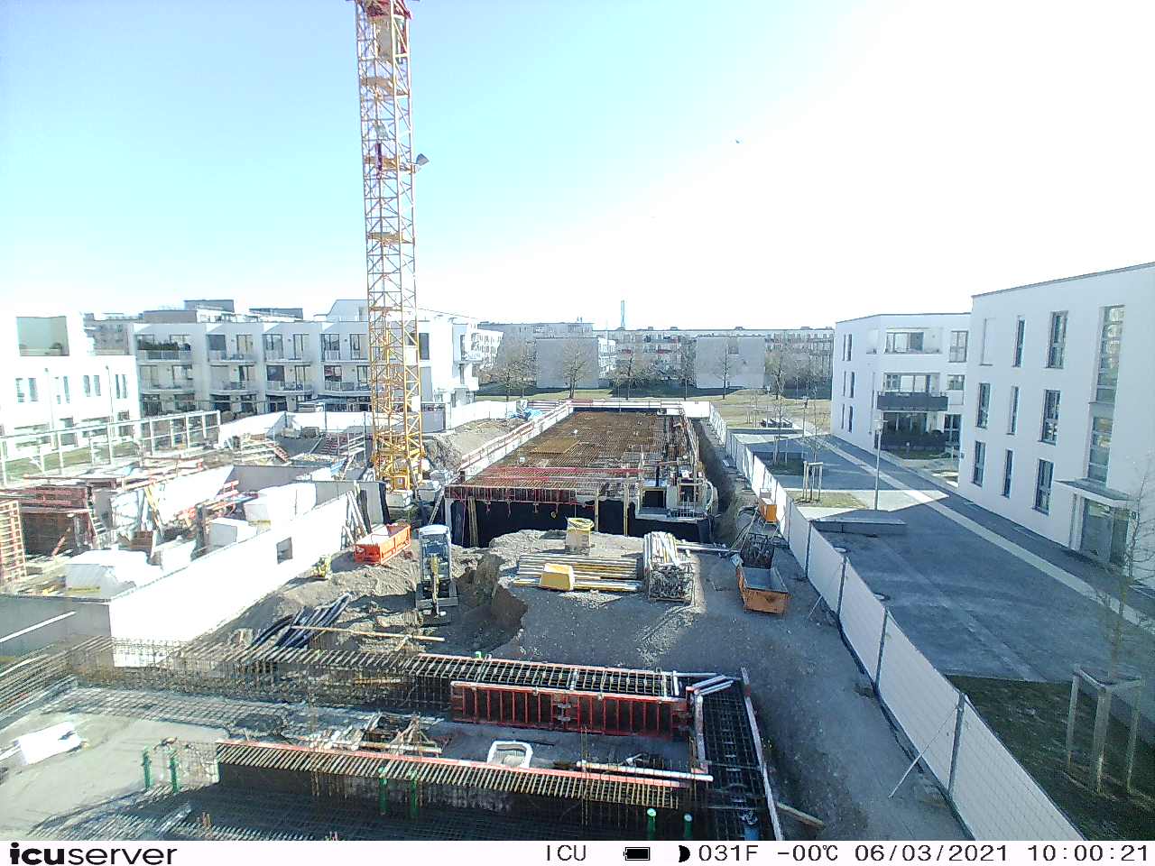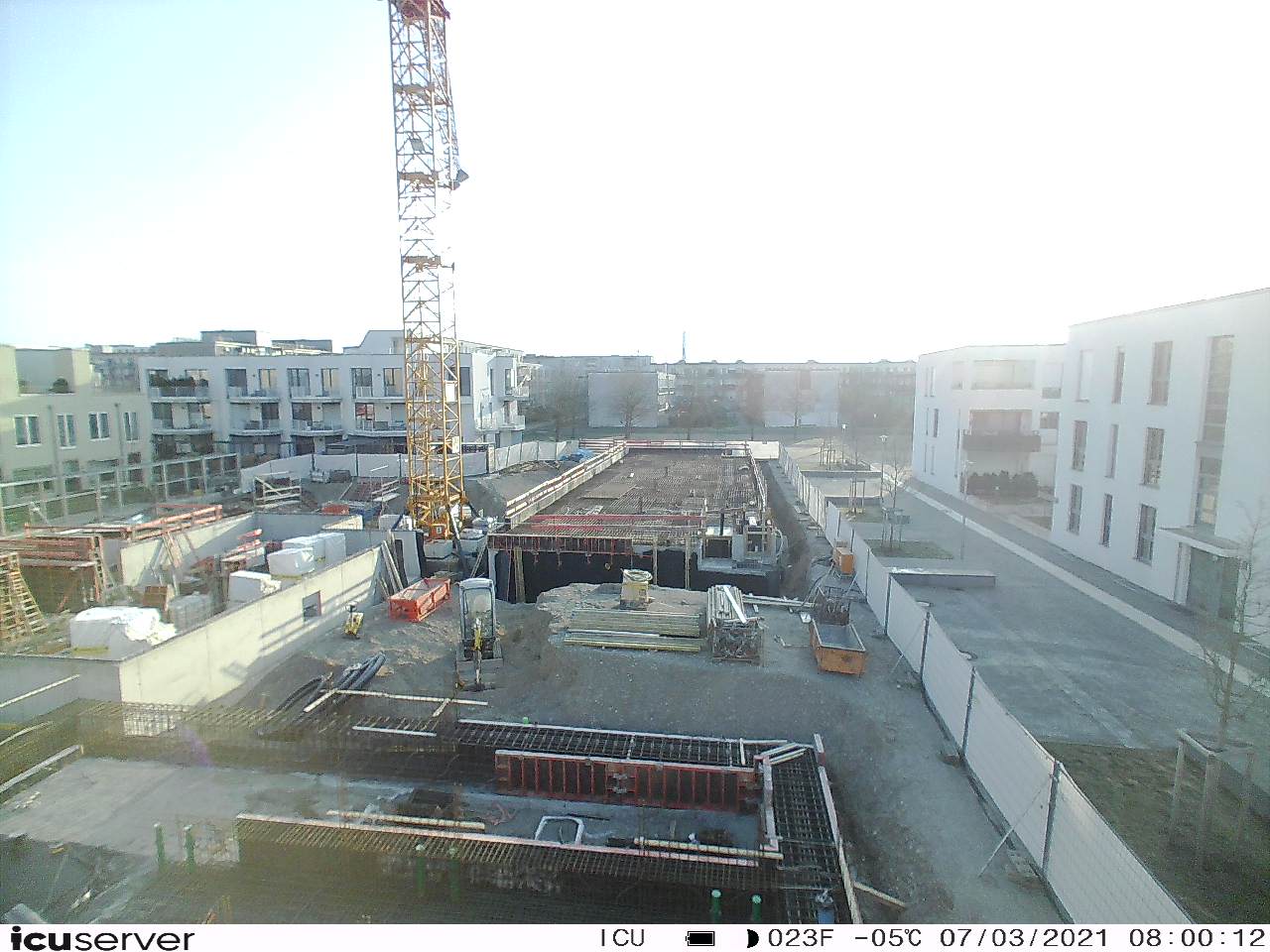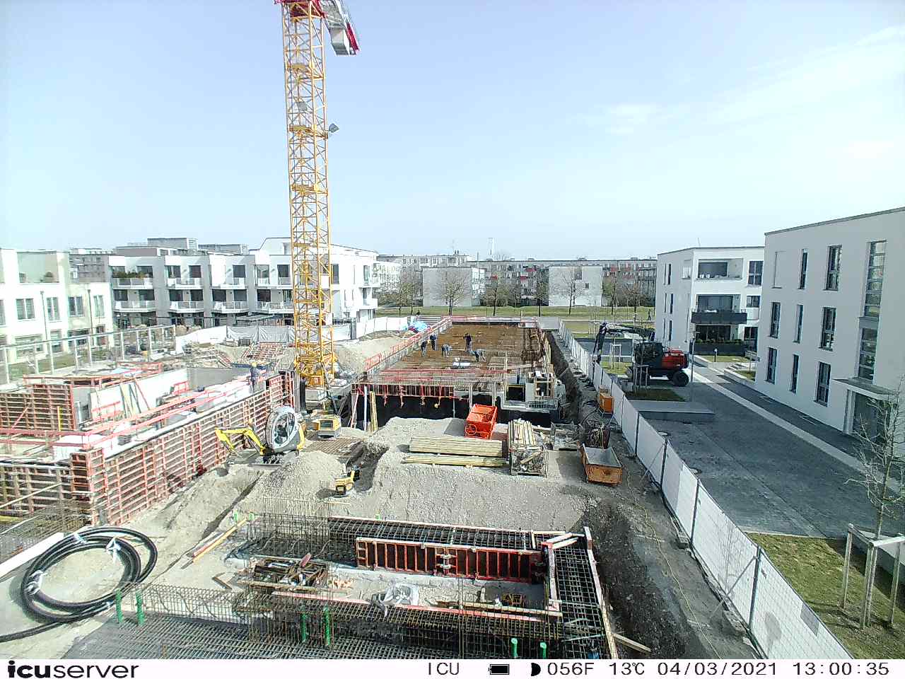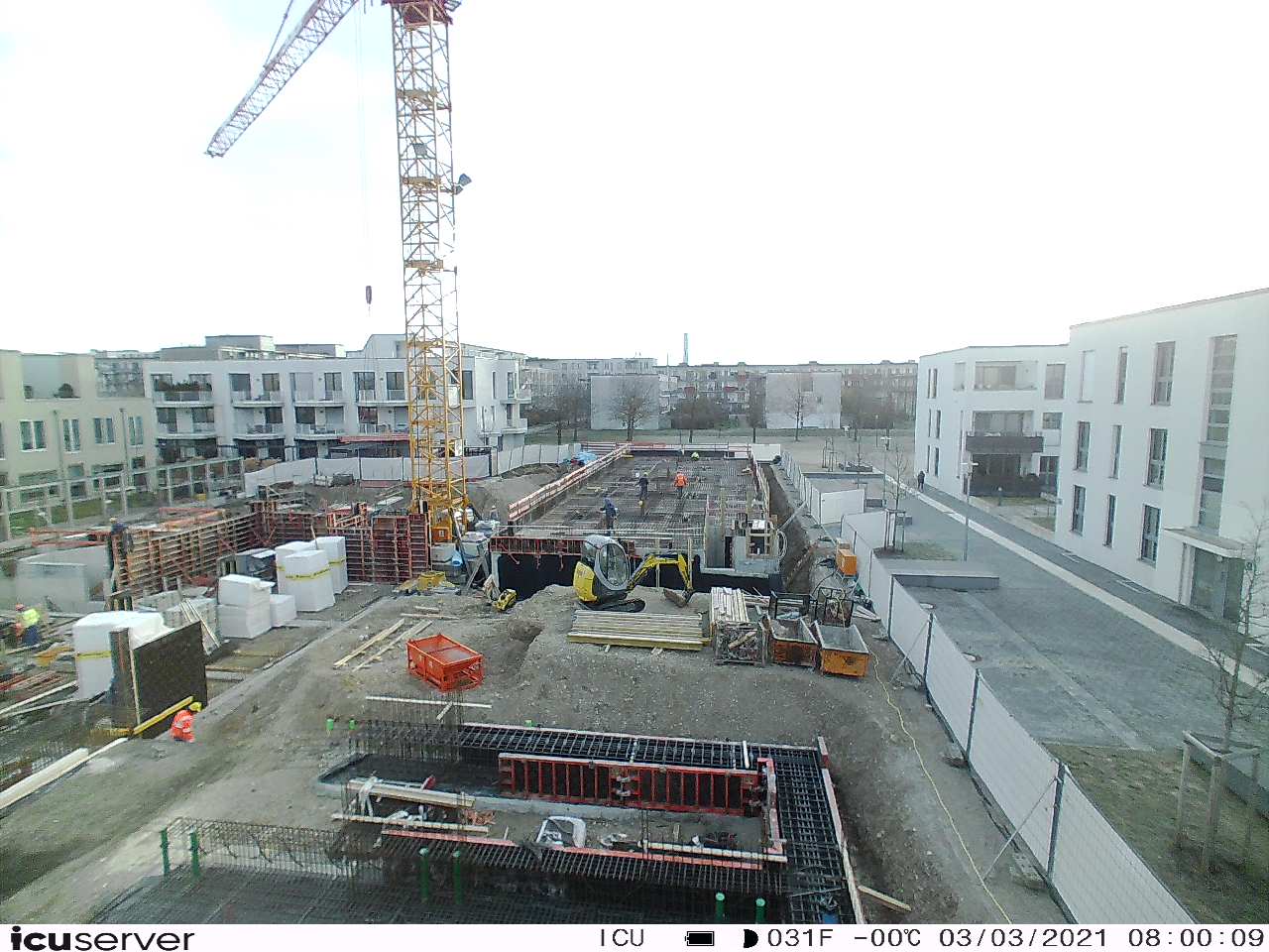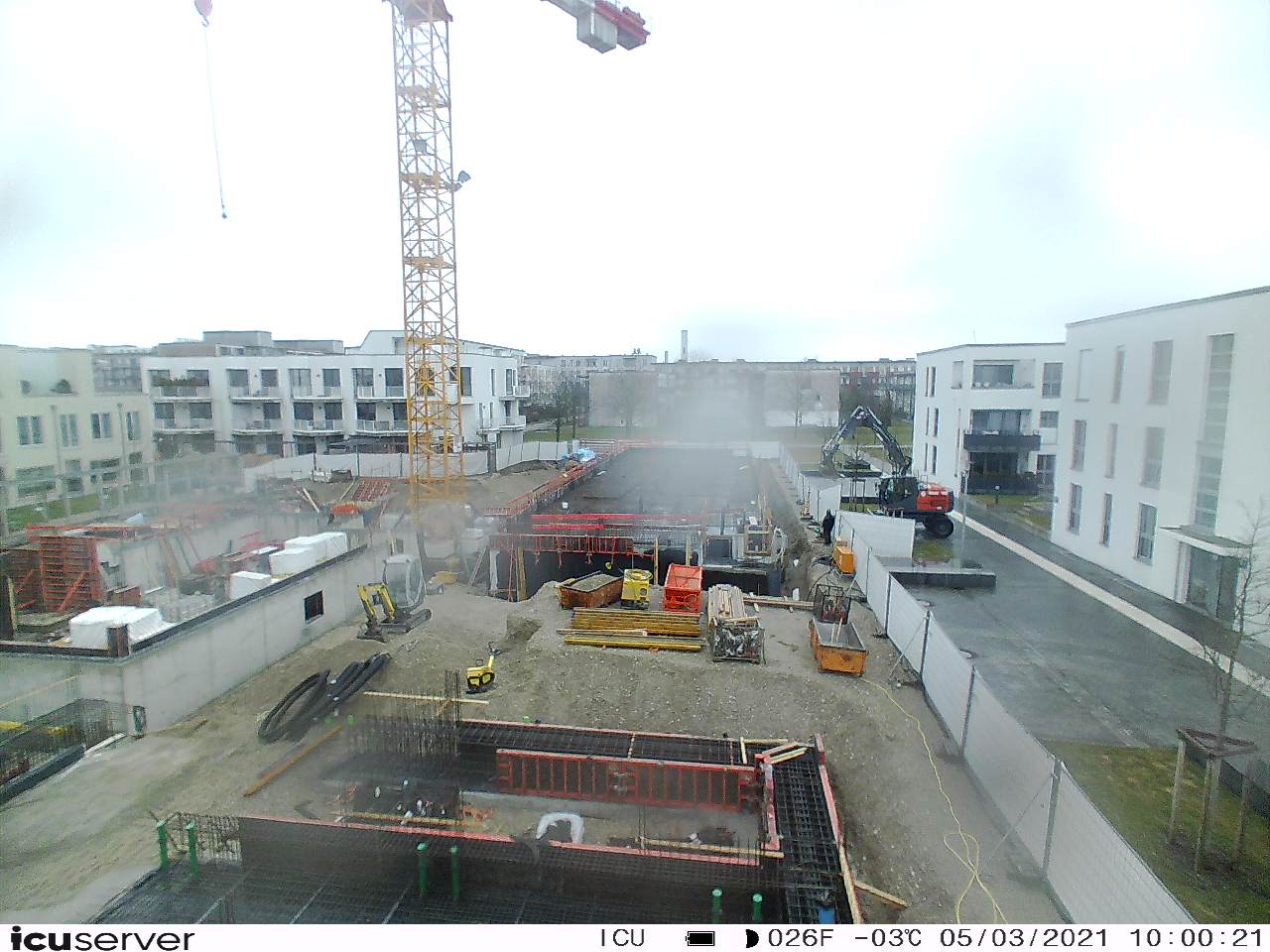 Die Kamera steht am westlichen Ende der Baustelle. Sie blickt nach Osten. Bilder: 26. Februar - 13. August 2021.