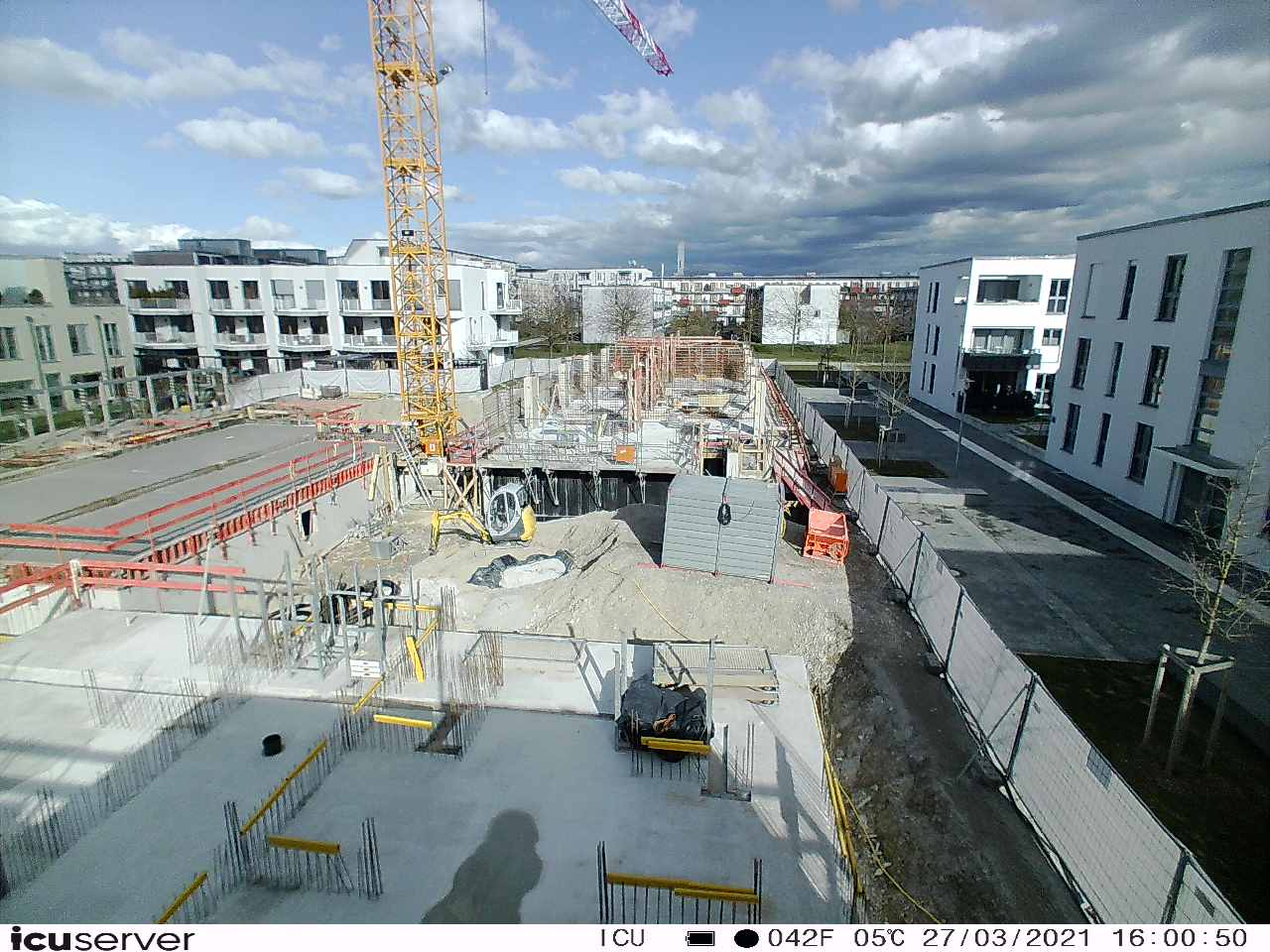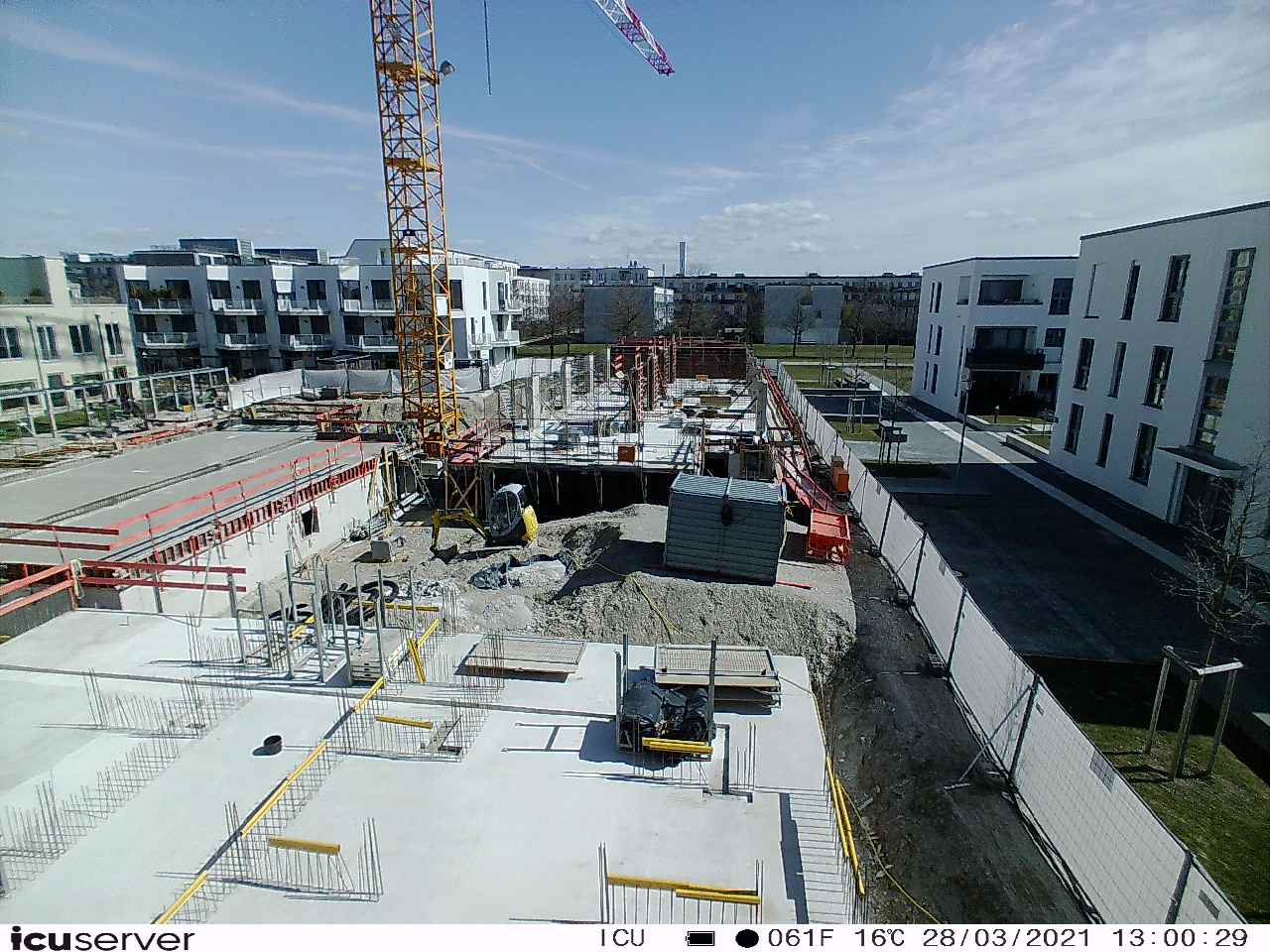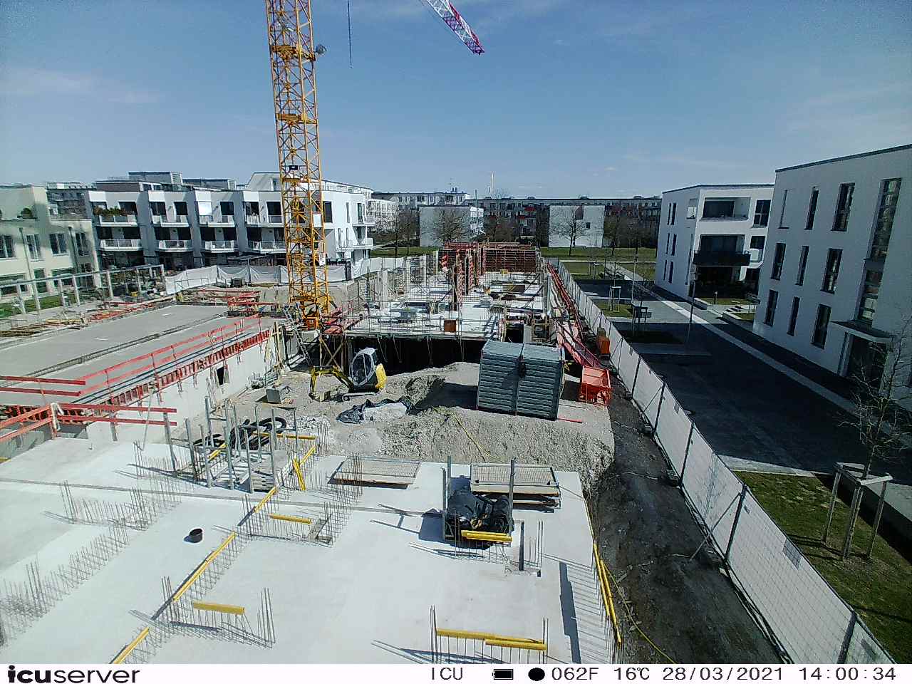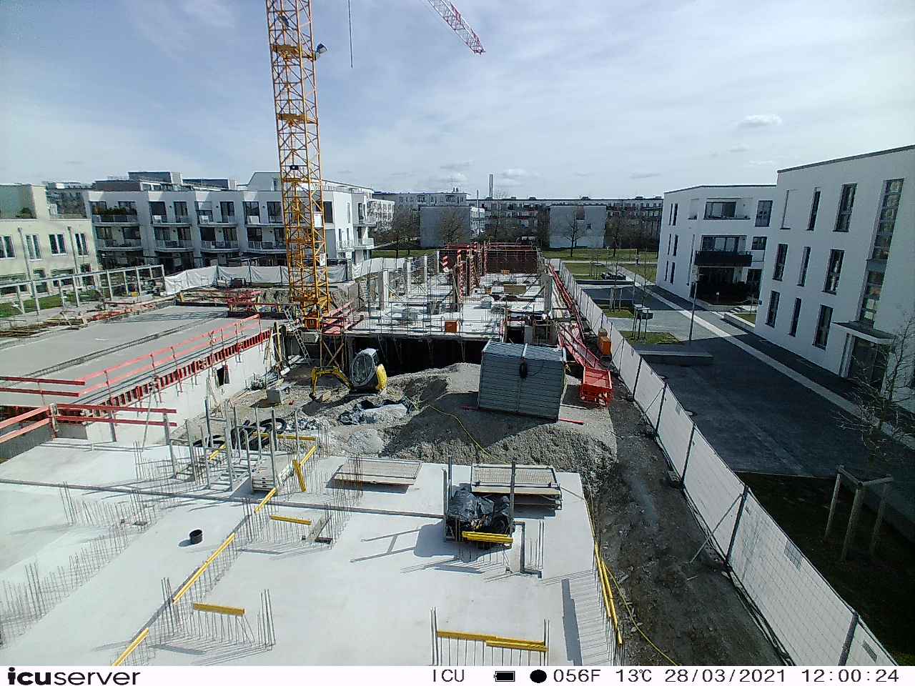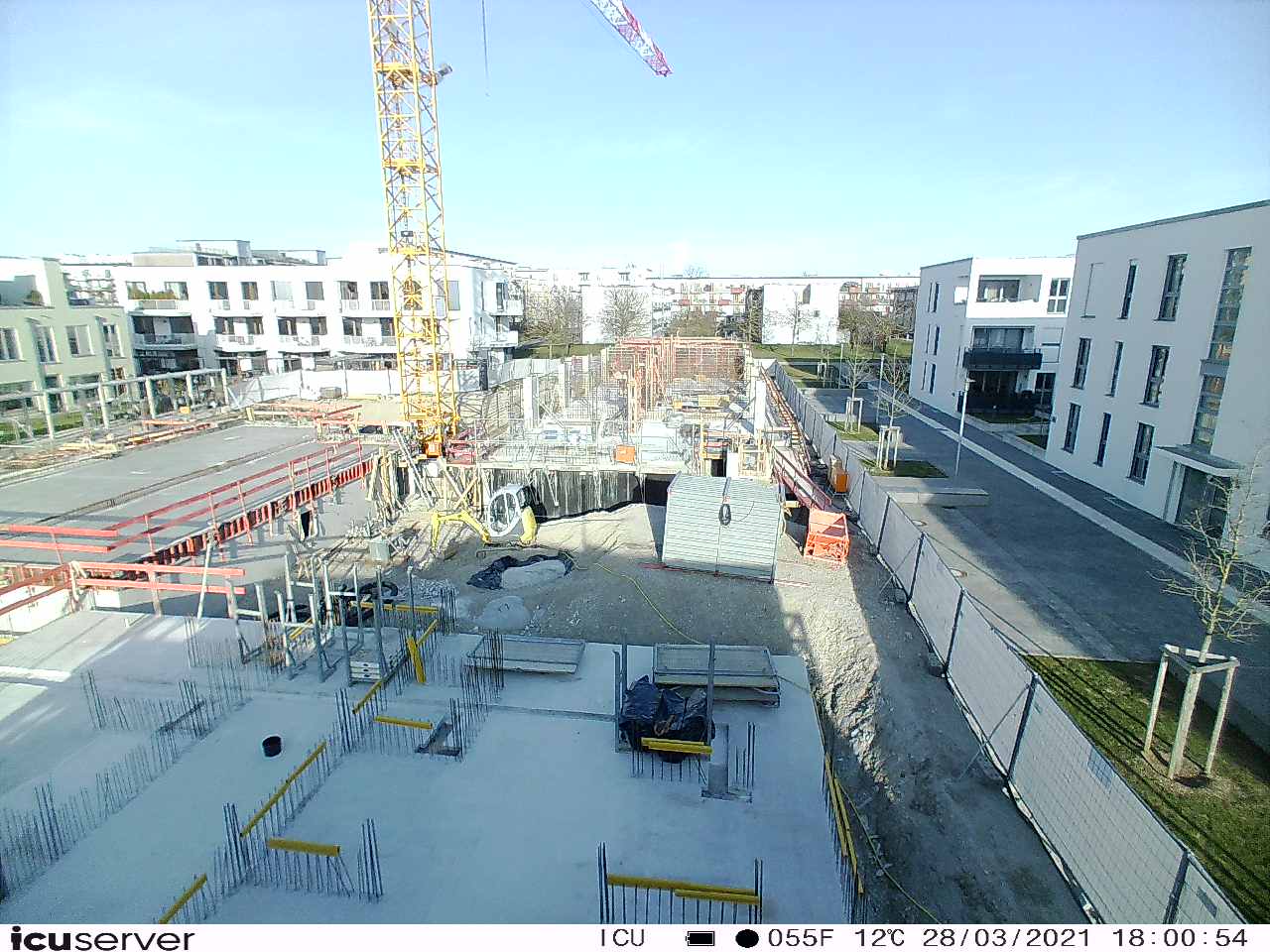 Die Kamera steht am westlichen Ende der Baustelle. Sie blickt nach Osten. Bilder: 26. Februar - 13. August 2021.