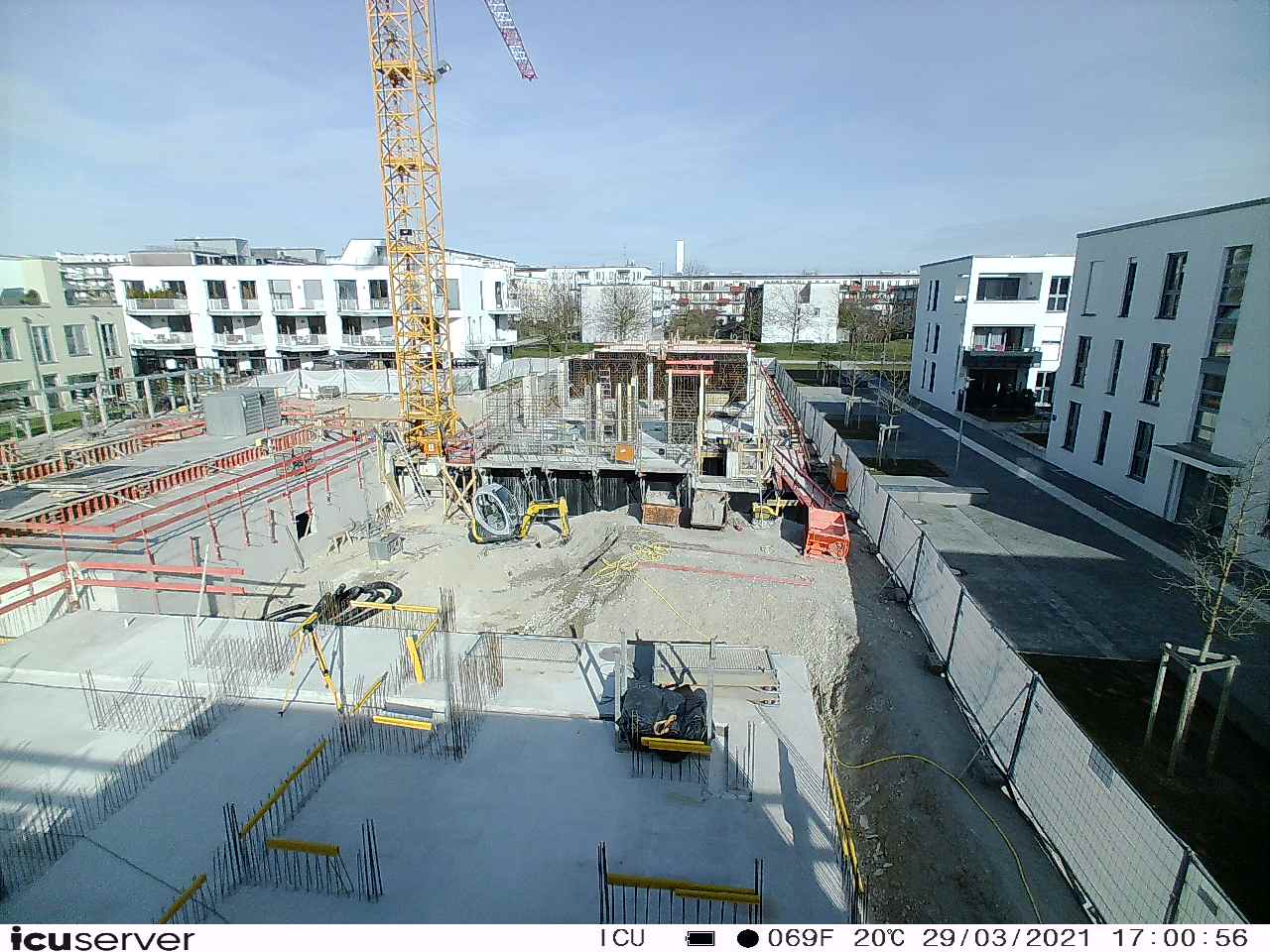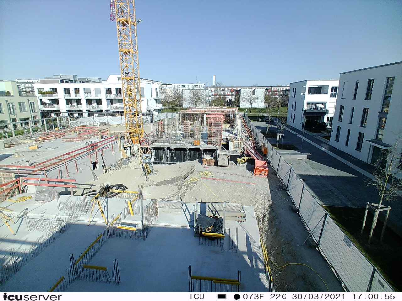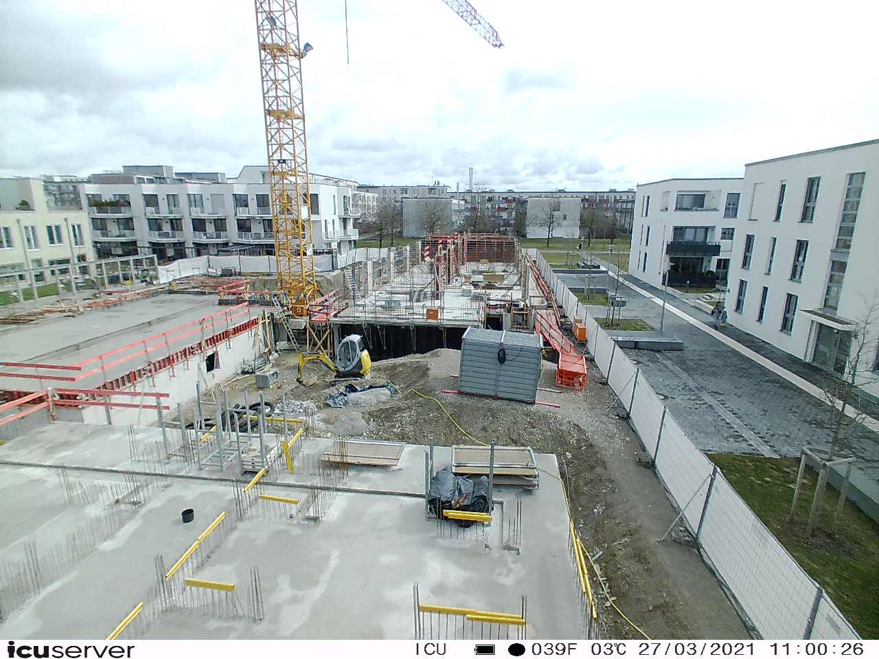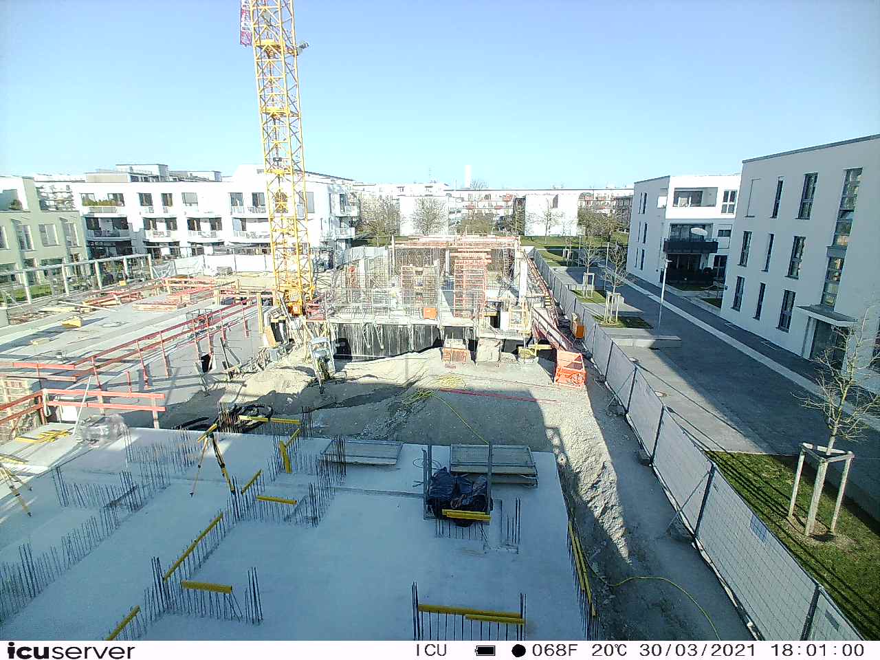 Die Kamera steht am westlichen Ende der Baustelle. Sie blickt nach Osten. Bilder: 26. Februar - 13. August 2021.