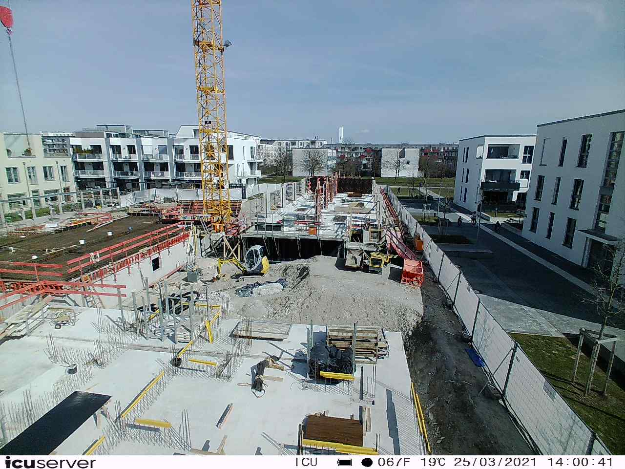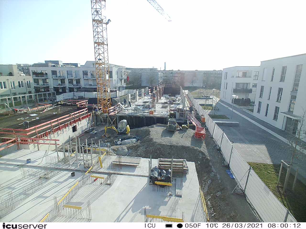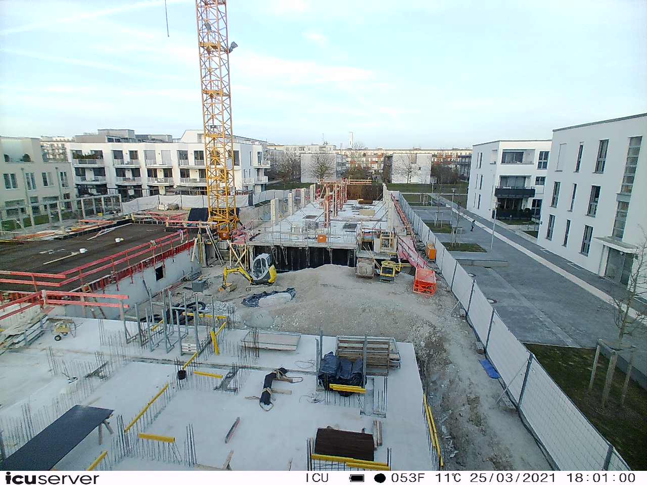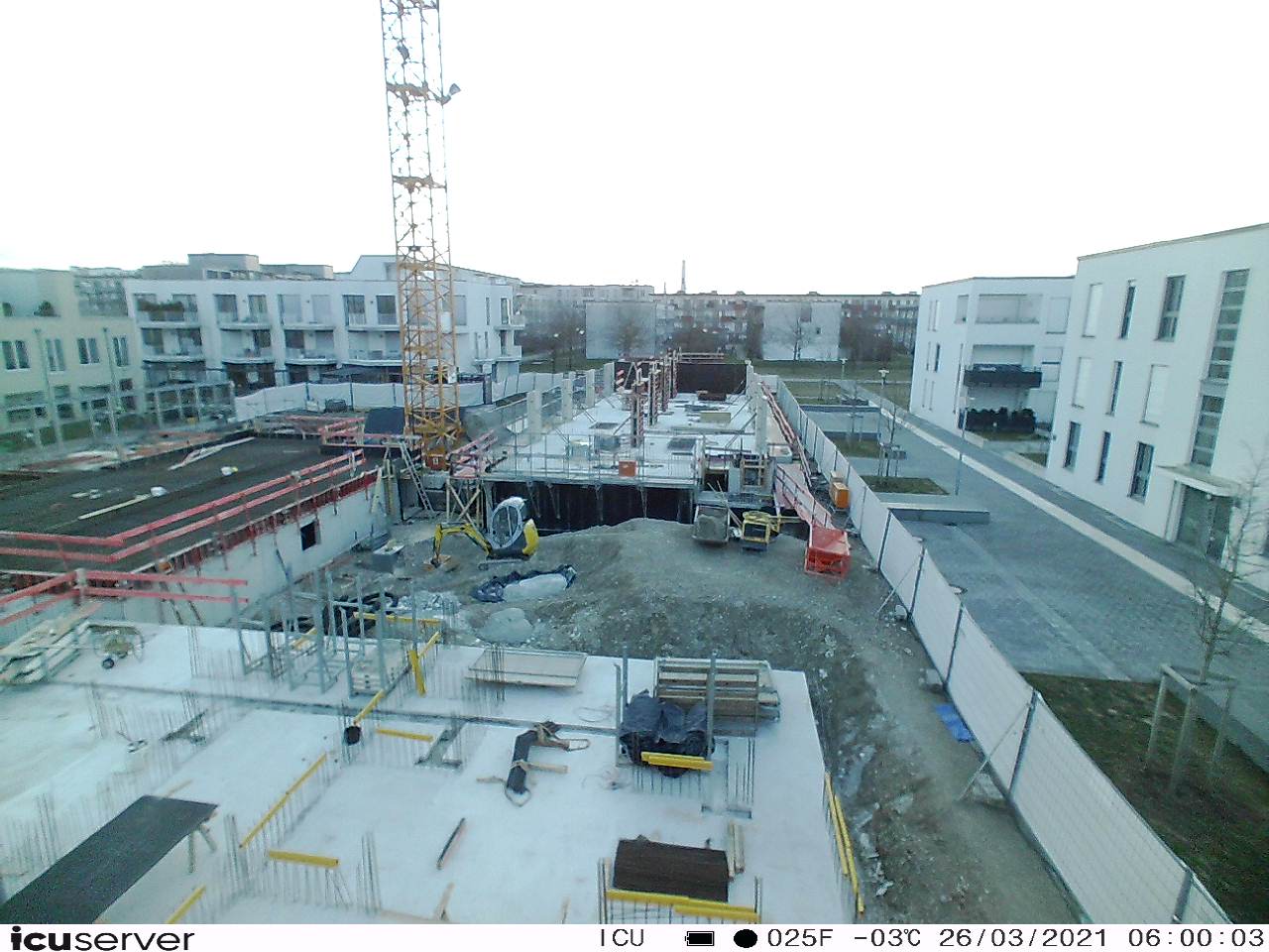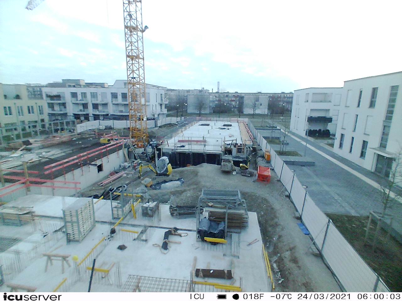 Die Kamera steht am westlichen Ende der Baustelle. Sie blickt nach Osten. Bilder: 26. Februar - 13. August 2021.