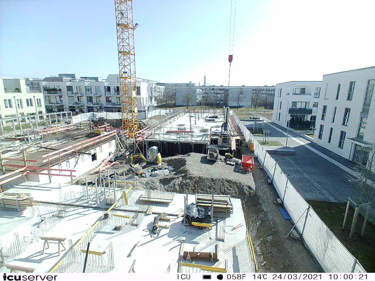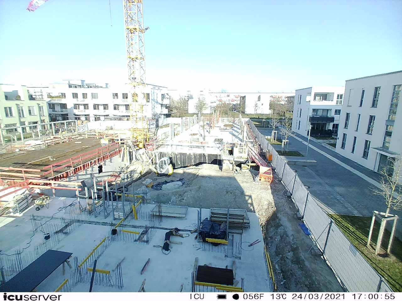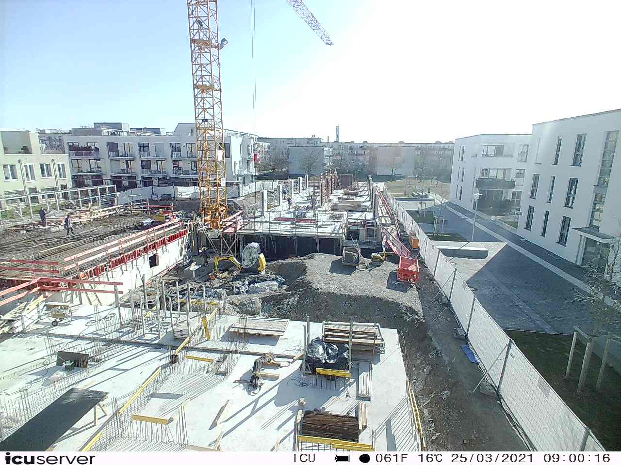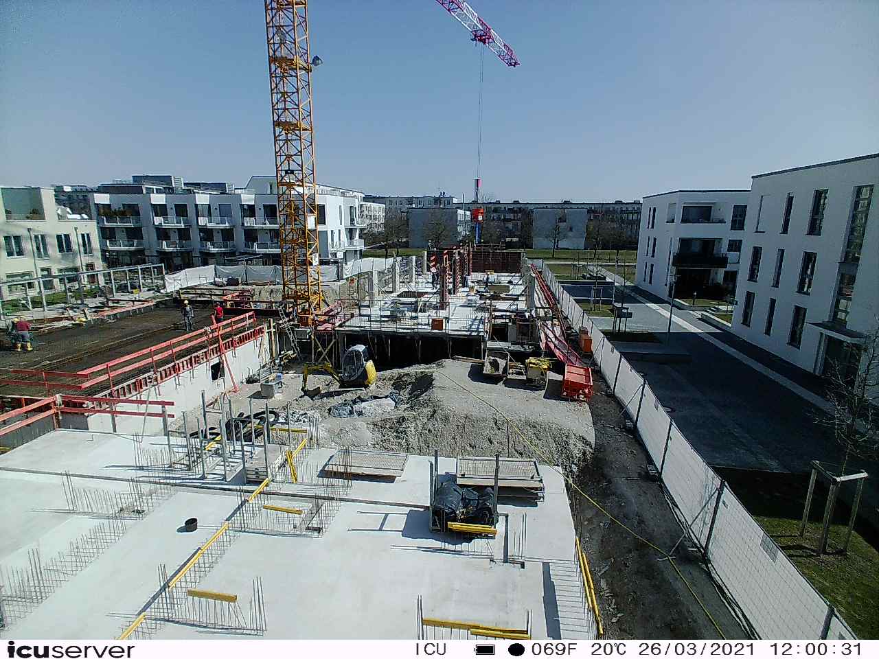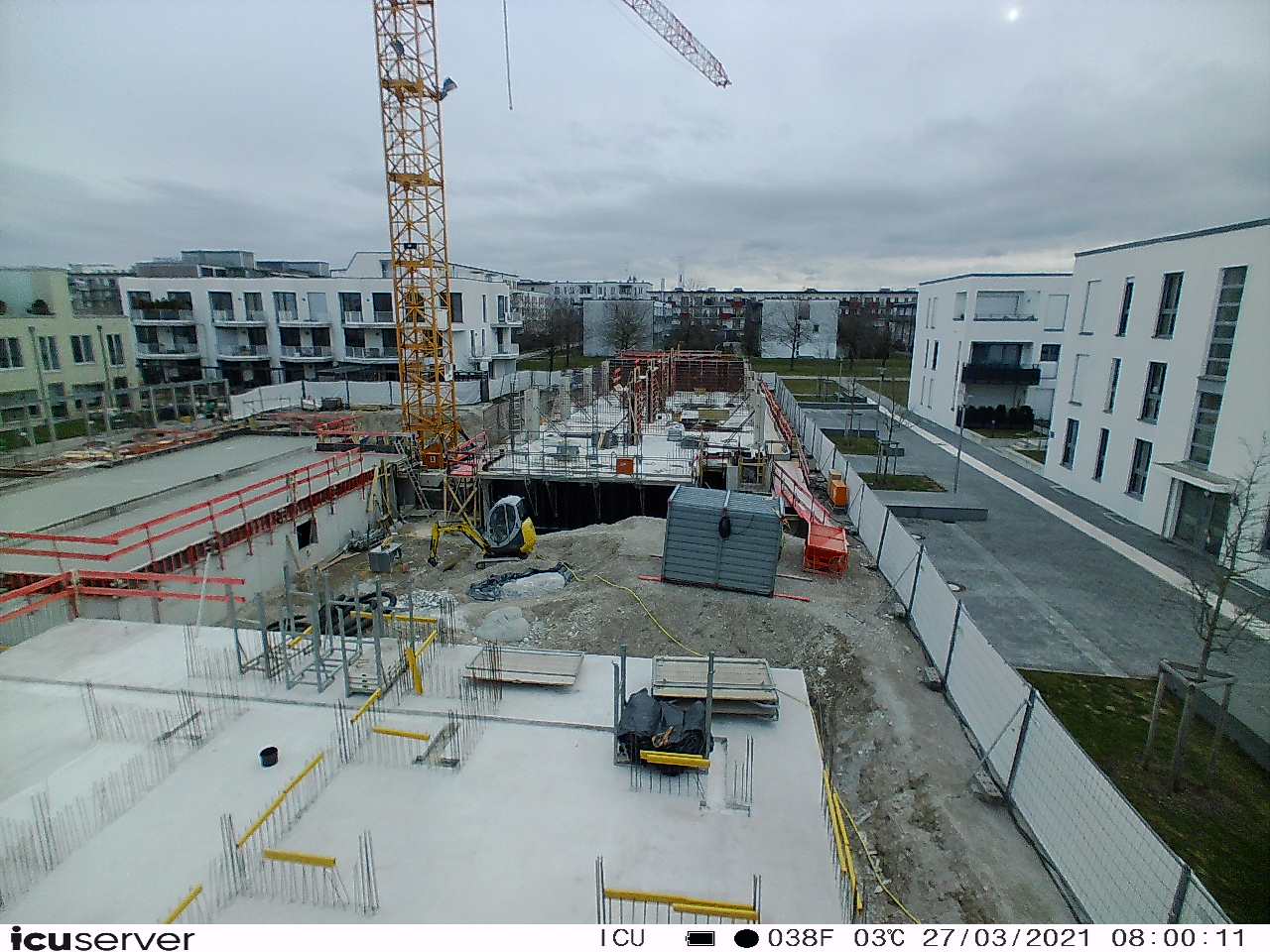 Die Kamera steht am westlichen Ende der Baustelle. Sie blickt nach Osten. Bilder: 26. Februar - 13. August 2021.