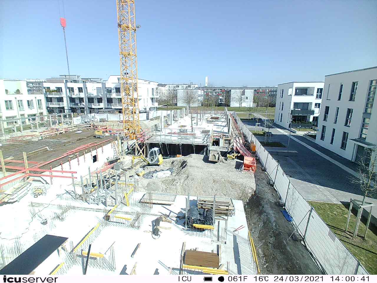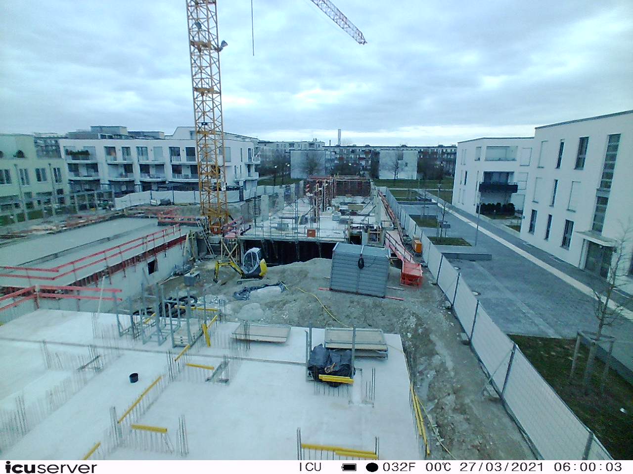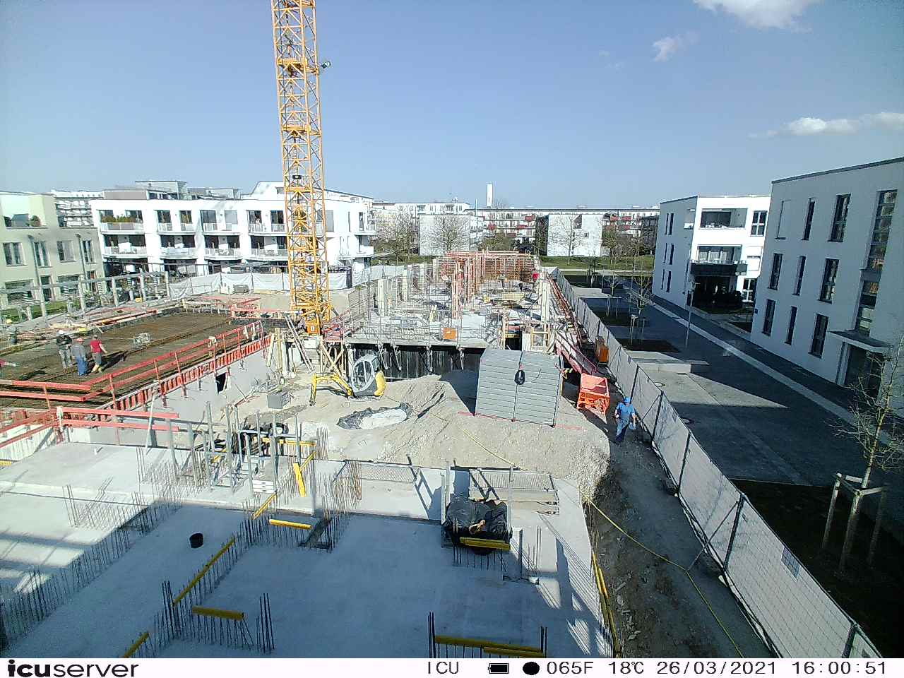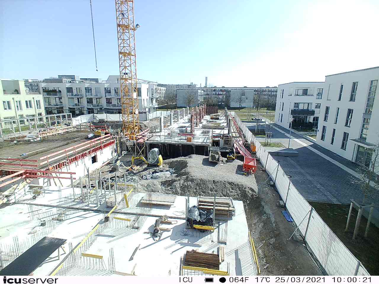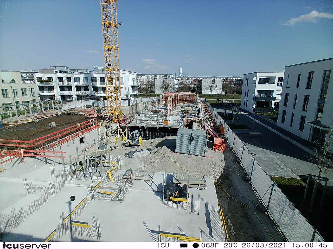 Die Kamera steht am westlichen Ende der Baustelle. Sie blickt nach Osten. Bilder: 26. Februar - 13. August 2021.
