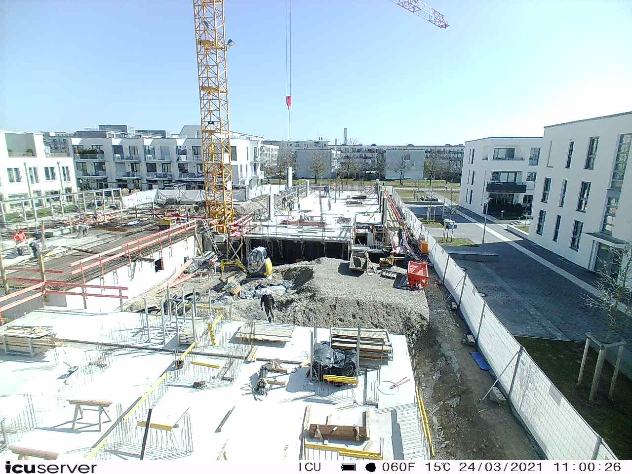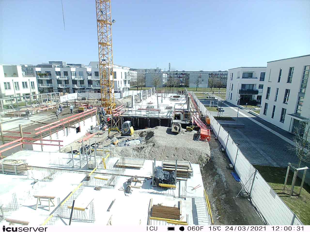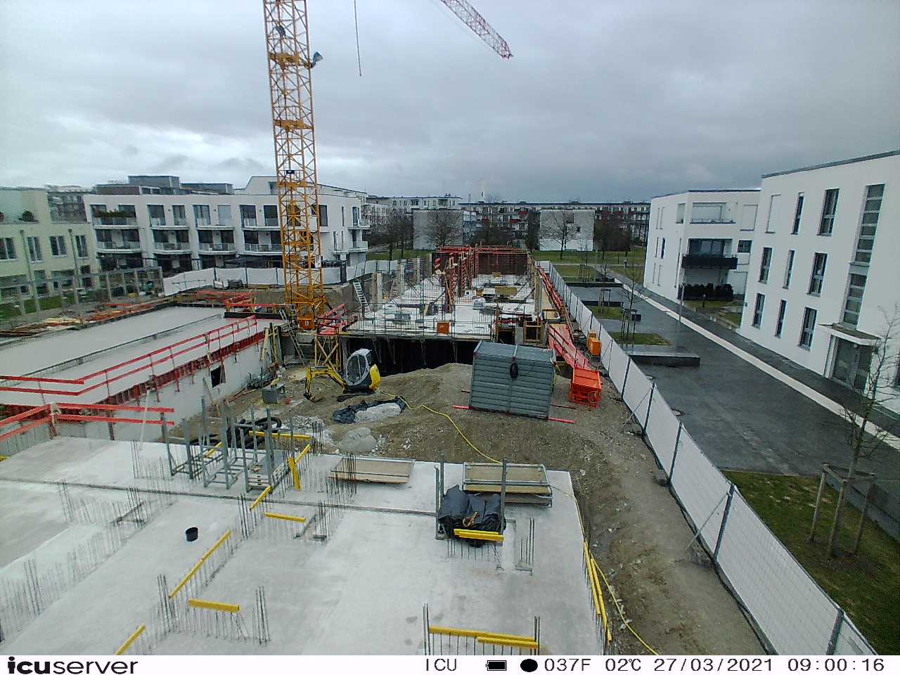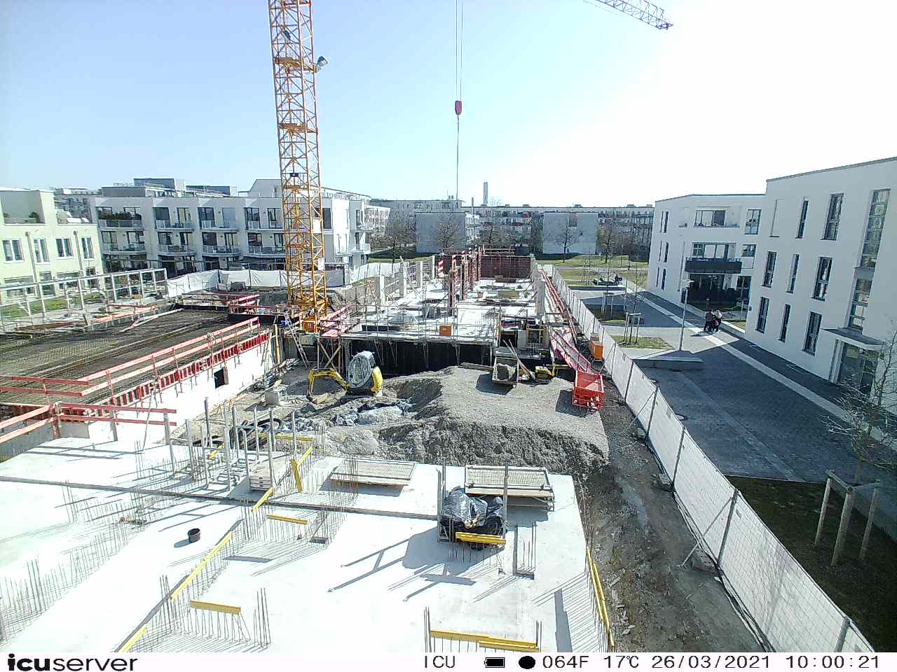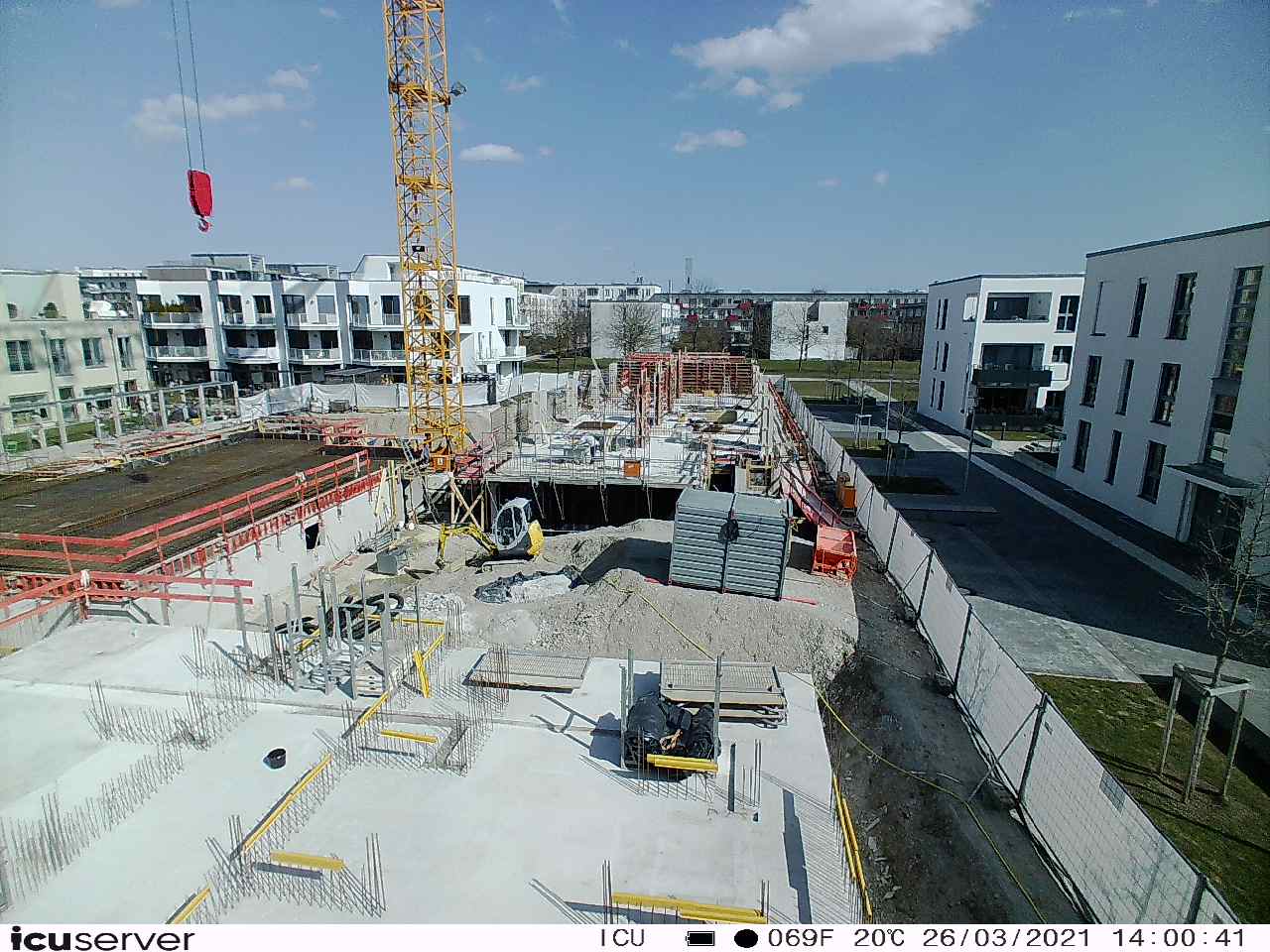 Die Kamera steht am westlichen Ende der Baustelle. Sie blickt nach Osten. Bilder: 26. Februar - 13. August 2021.