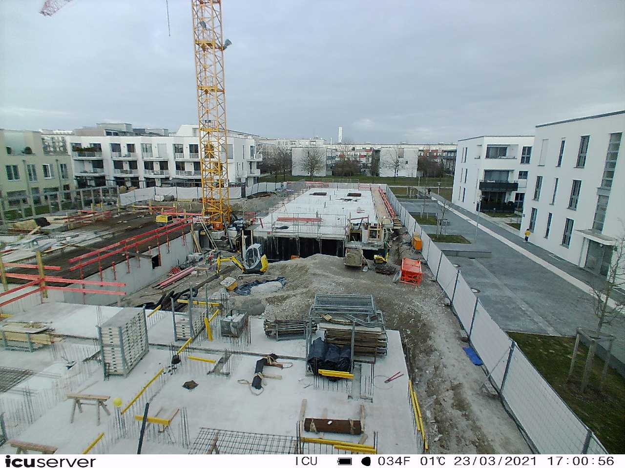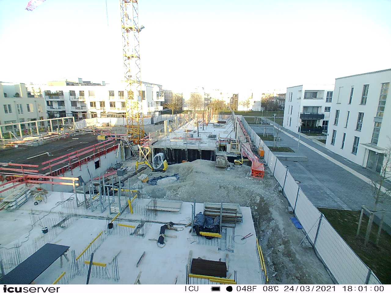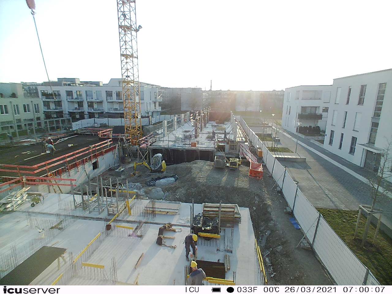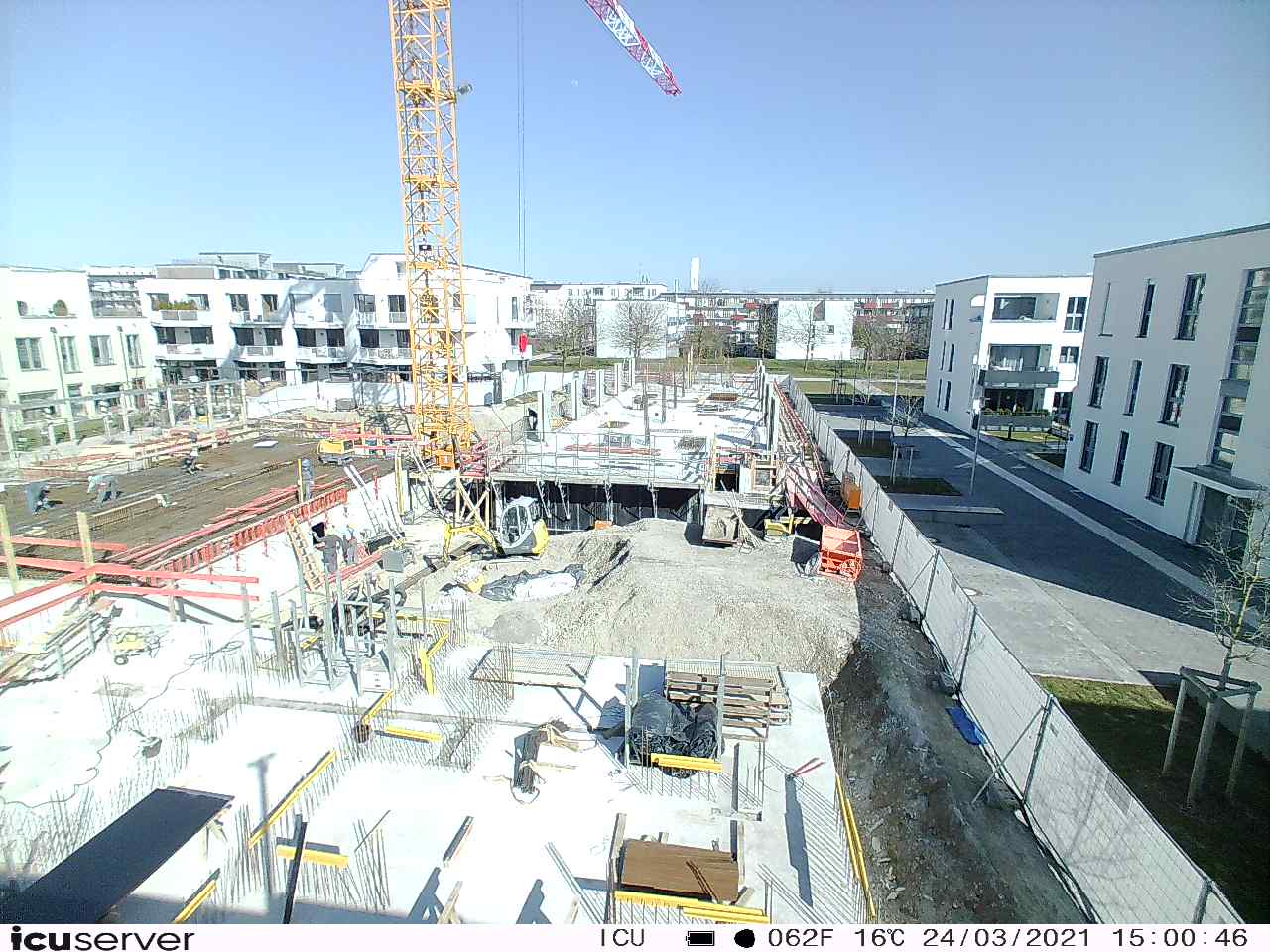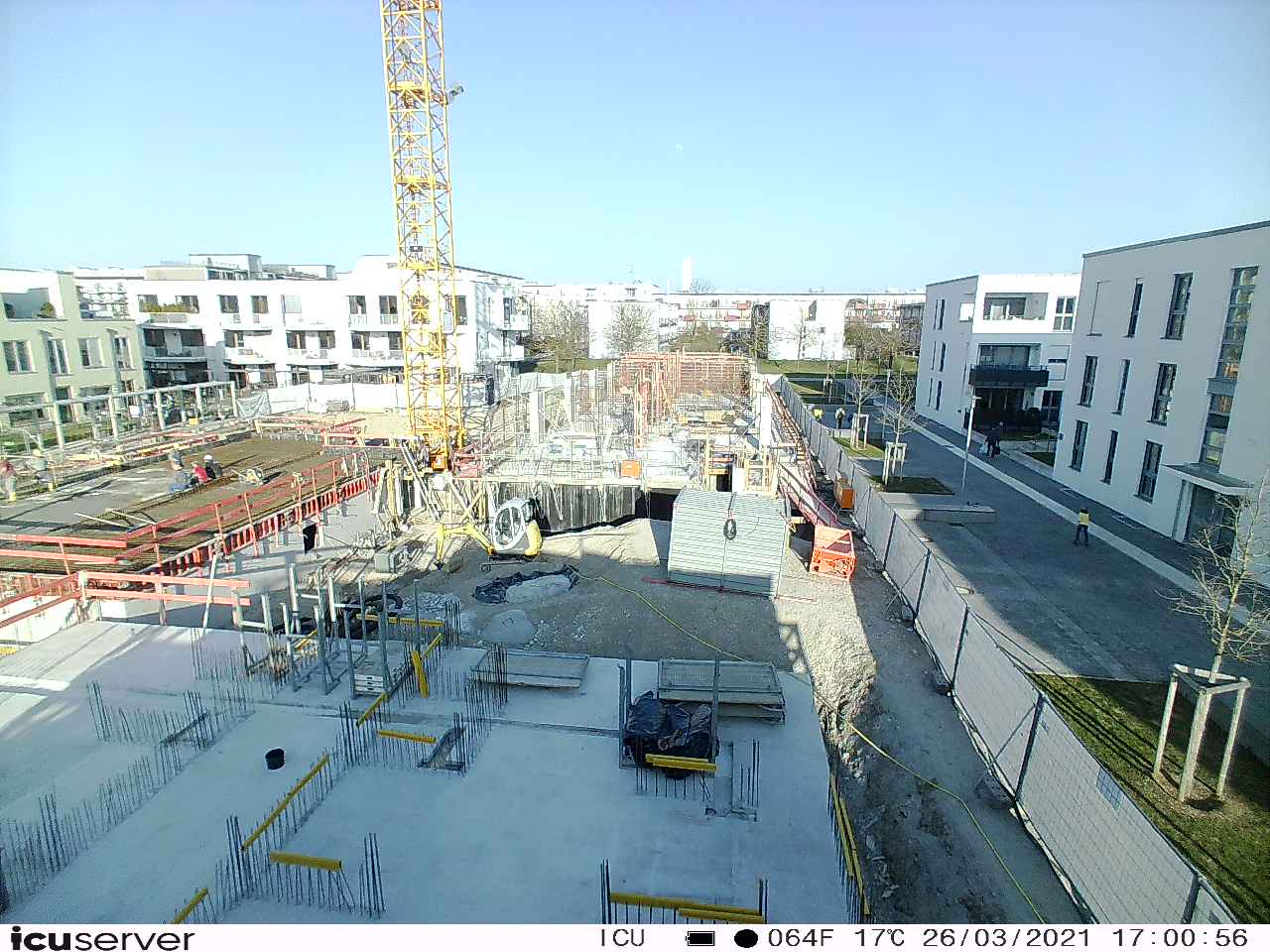 Die Kamera steht am westlichen Ende der Baustelle. Sie blickt nach Osten. Bilder: 26. Februar - 13. August 2021.