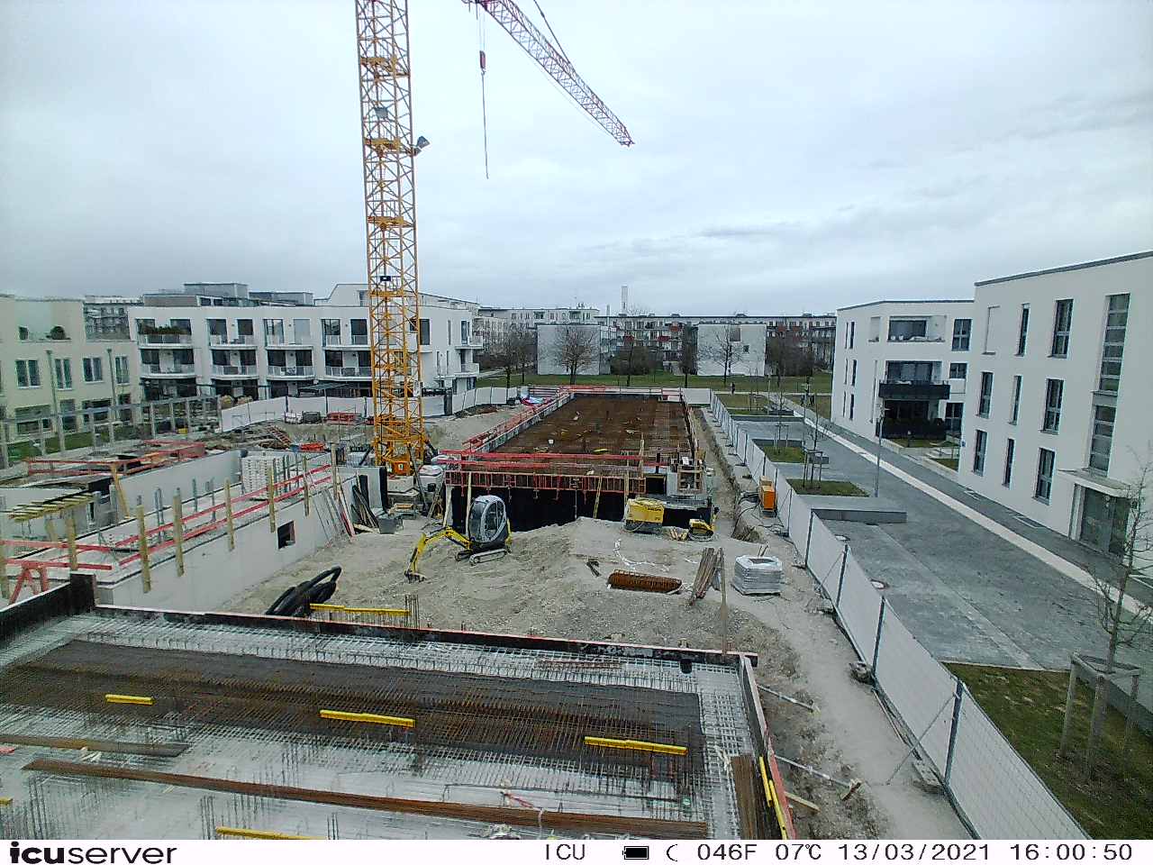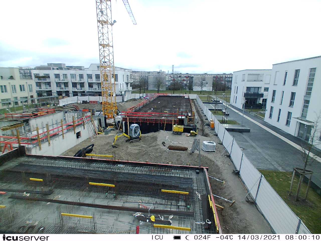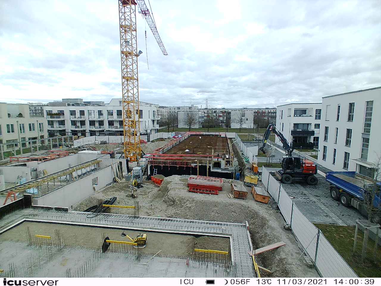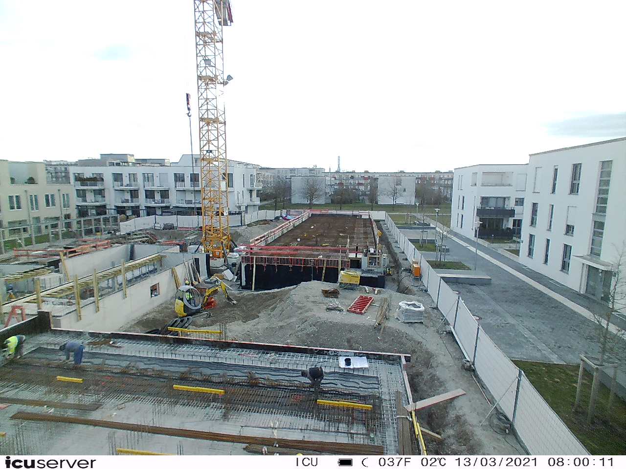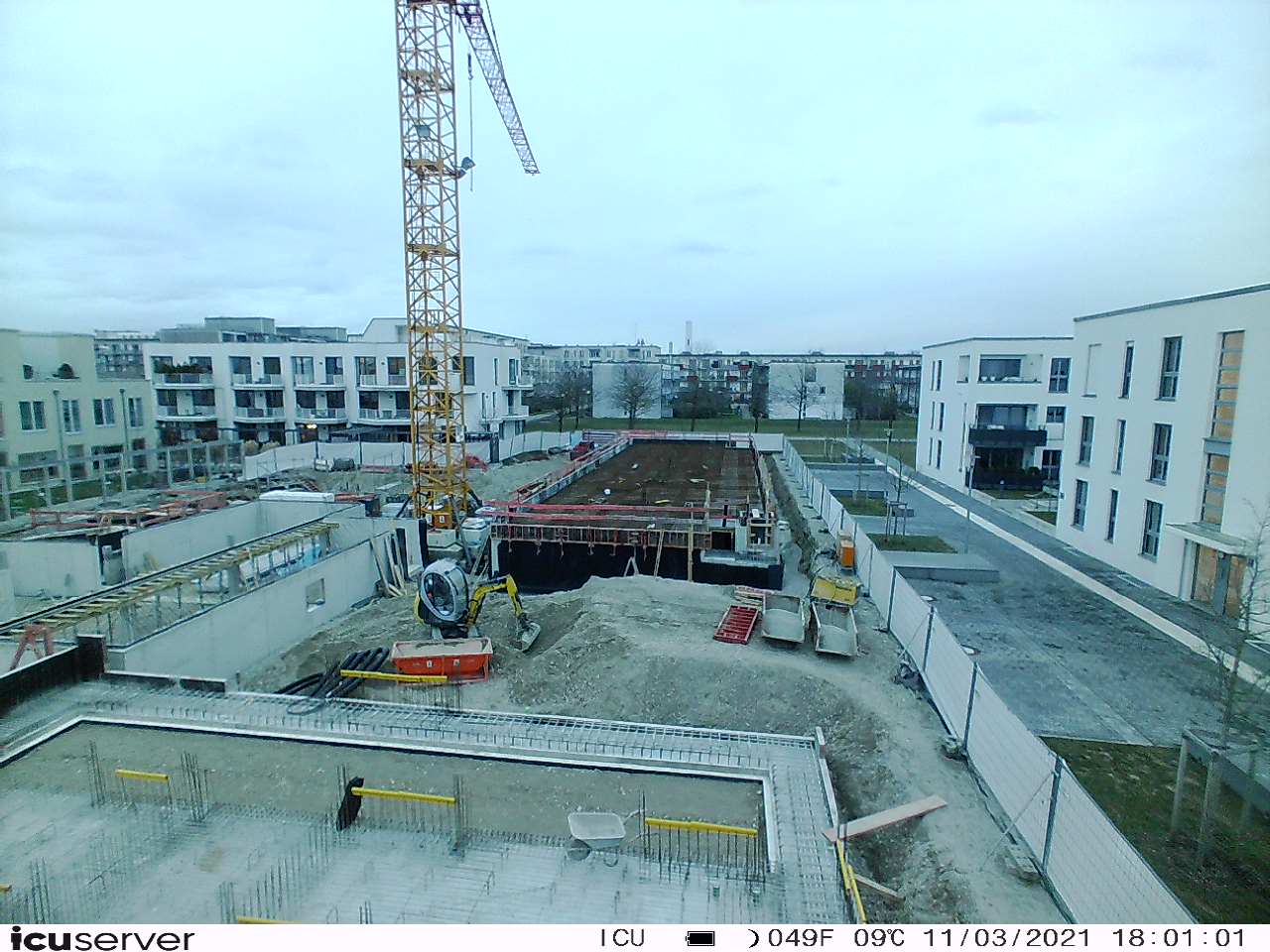 Die Kamera steht am westlichen Ende der Baustelle. Sie blickt nach Osten. Bilder: 26. Februar - 13. August 2021.