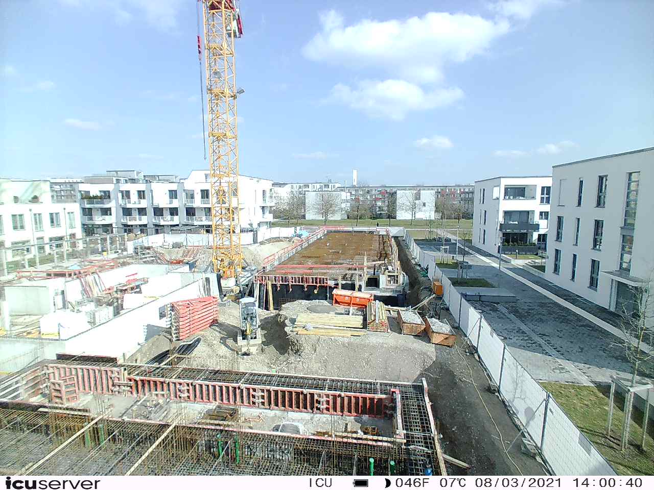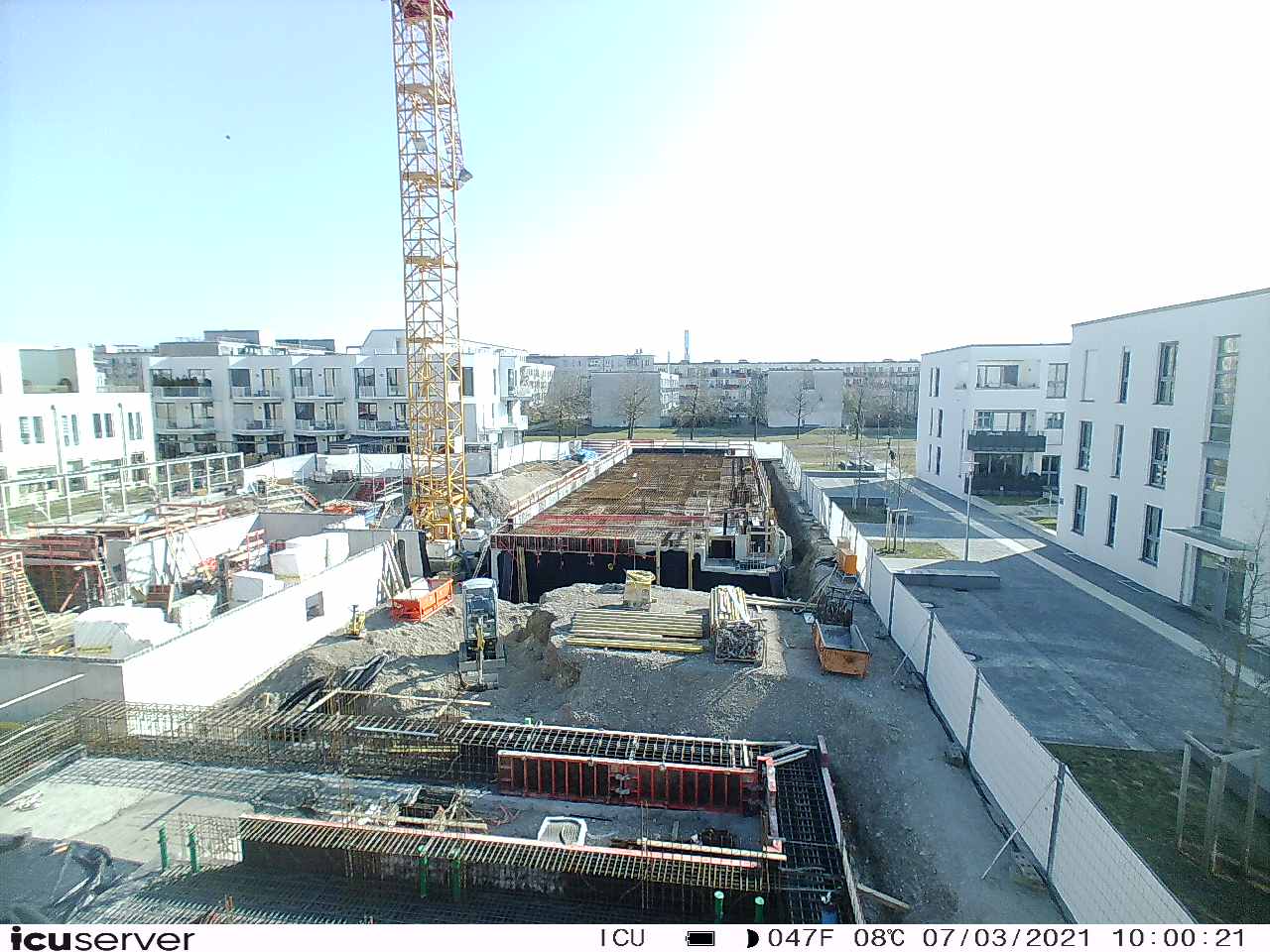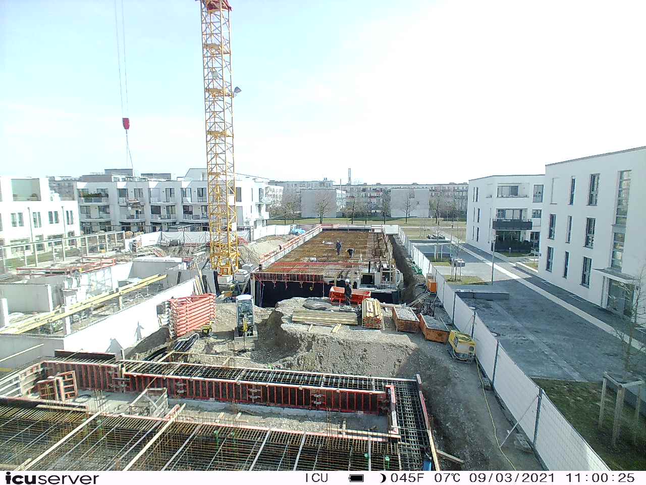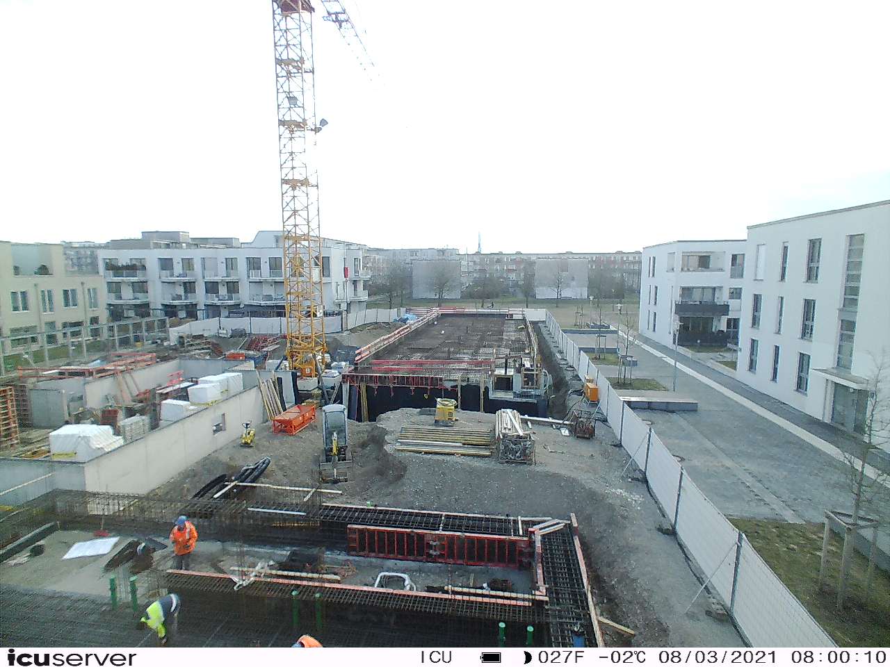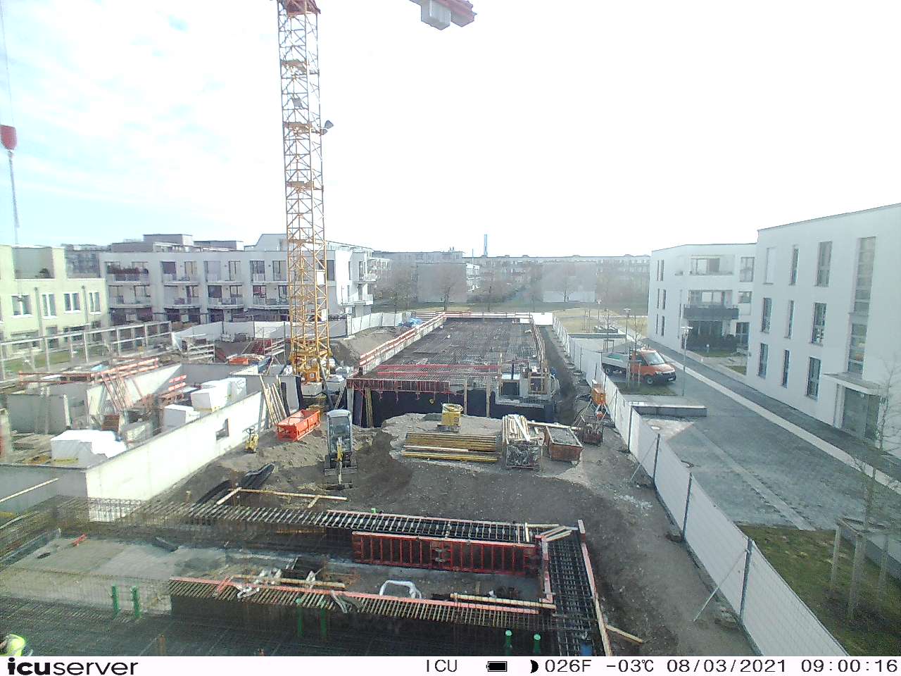 Die Kamera steht am westlichen Ende der Baustelle. Sie blickt nach Osten. Bilder: 26. Februar - 13. August 2021.