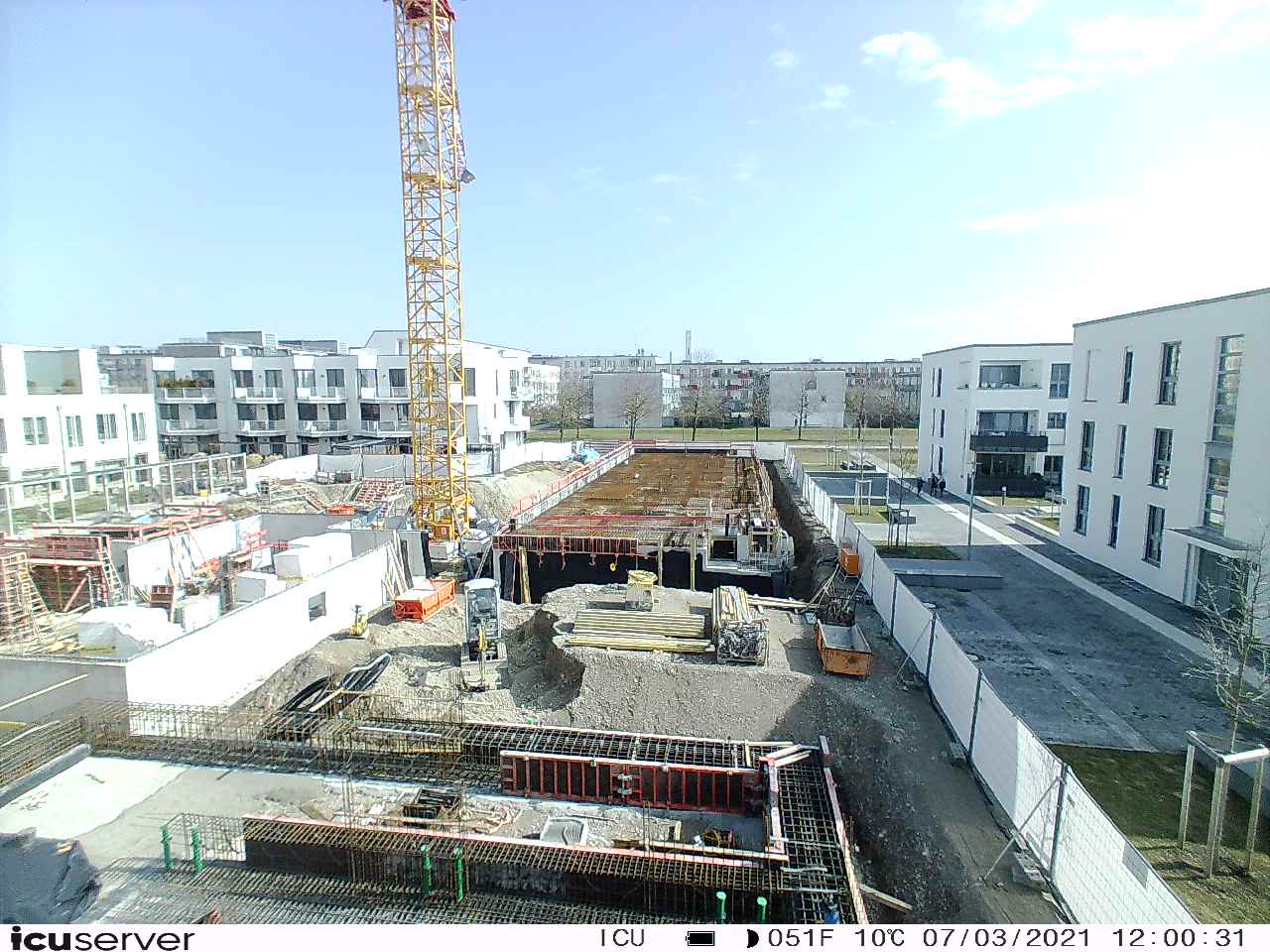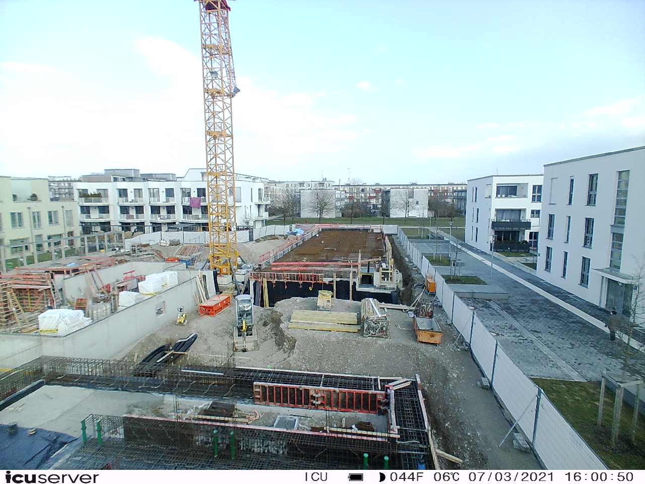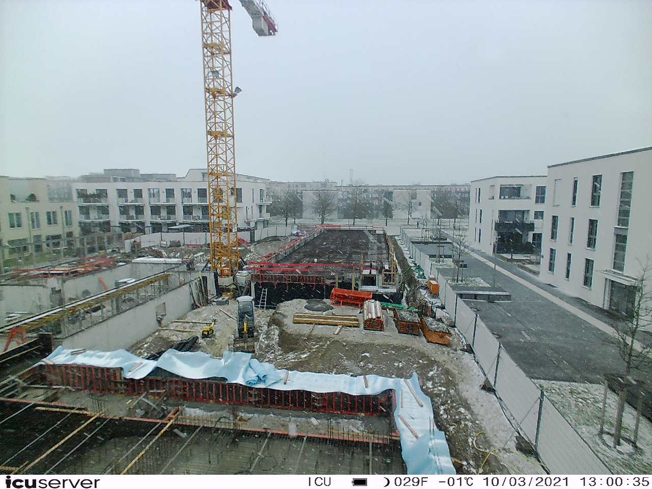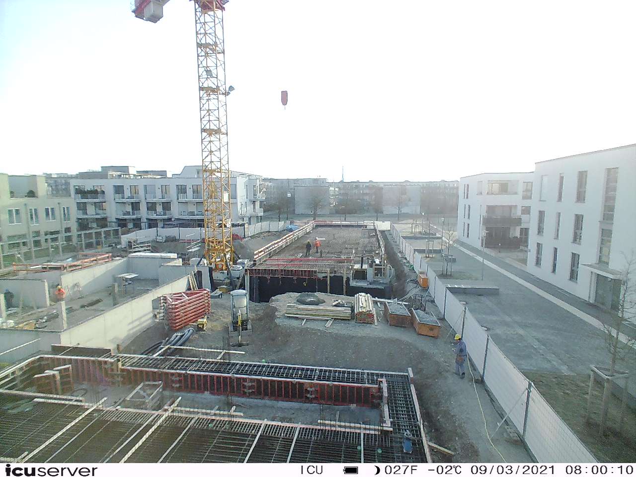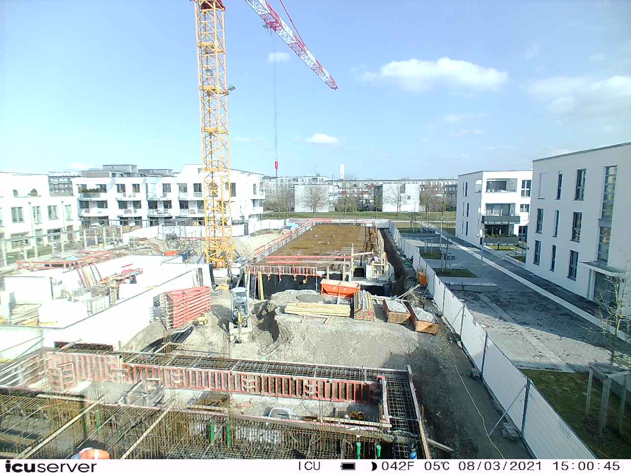 Die Kamera steht am westlichen Ende der Baustelle. Sie blickt nach Osten. Bilder: 26. Februar - 13. August 2021.