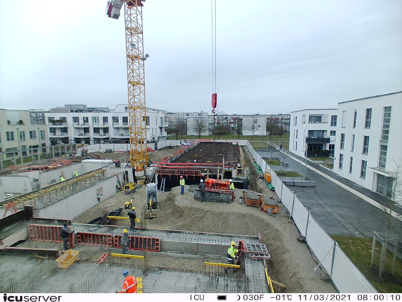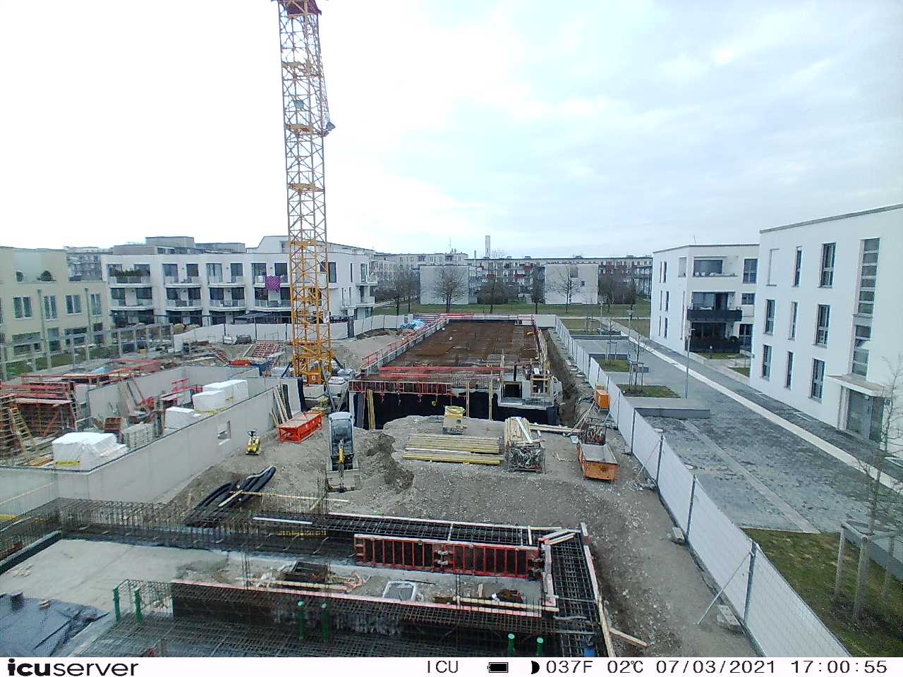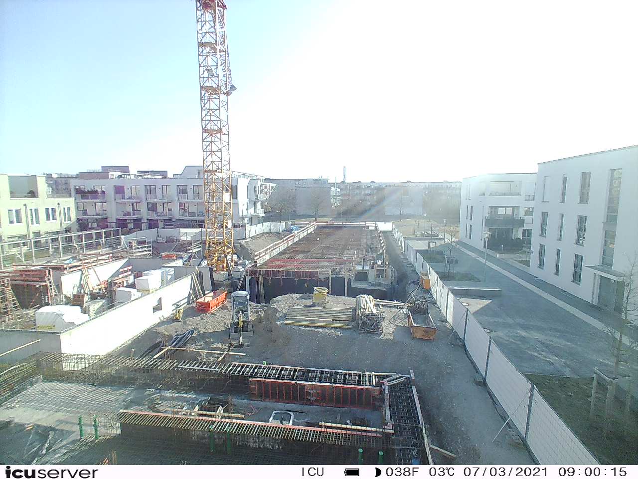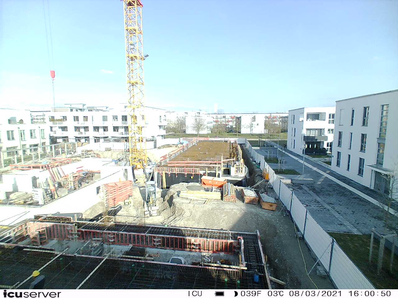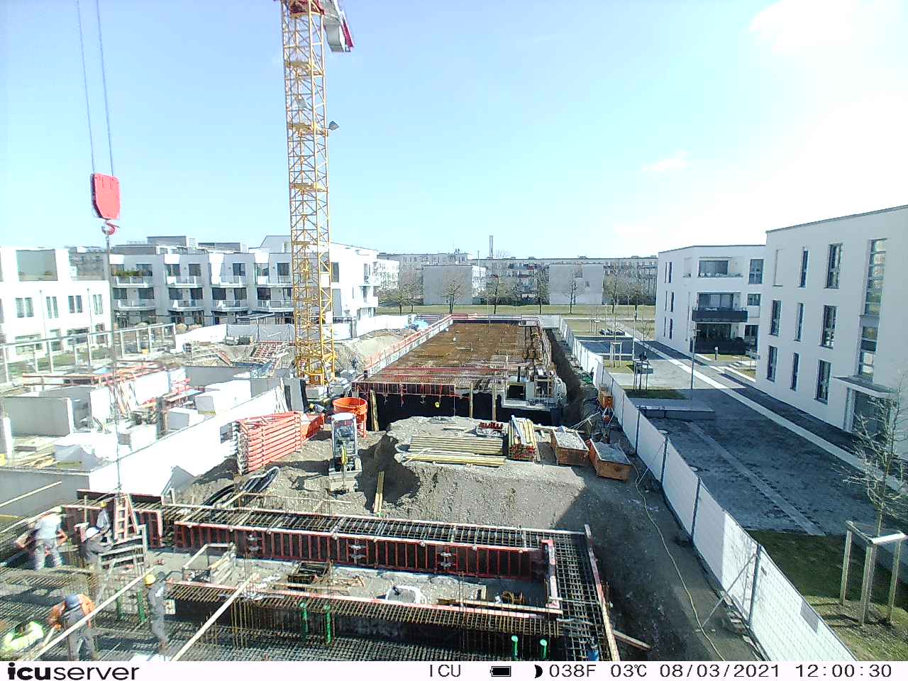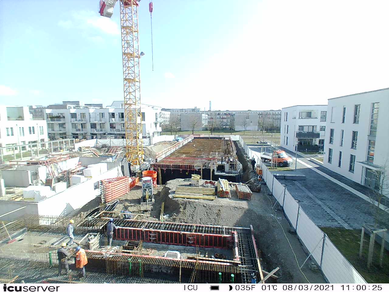 Die Kamera steht am westlichen Ende der Baustelle. Sie blickt nach Osten. Bilder: 26. Februar - 13. August 2021.