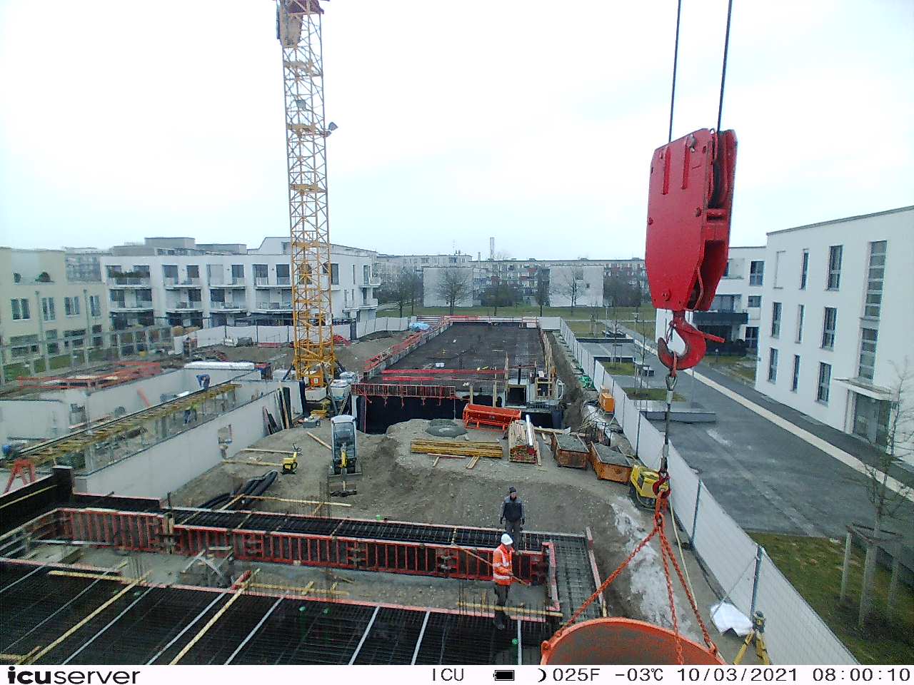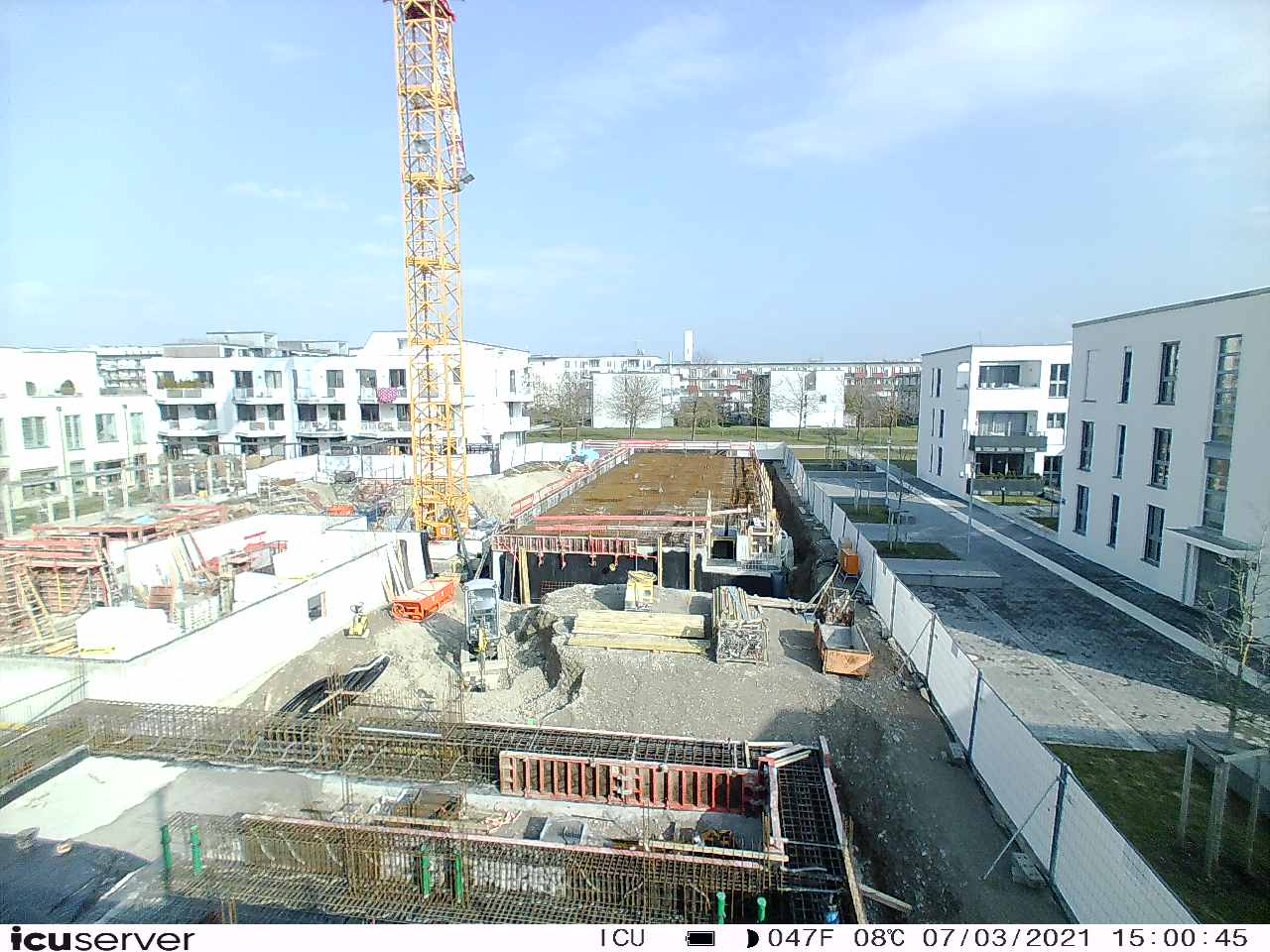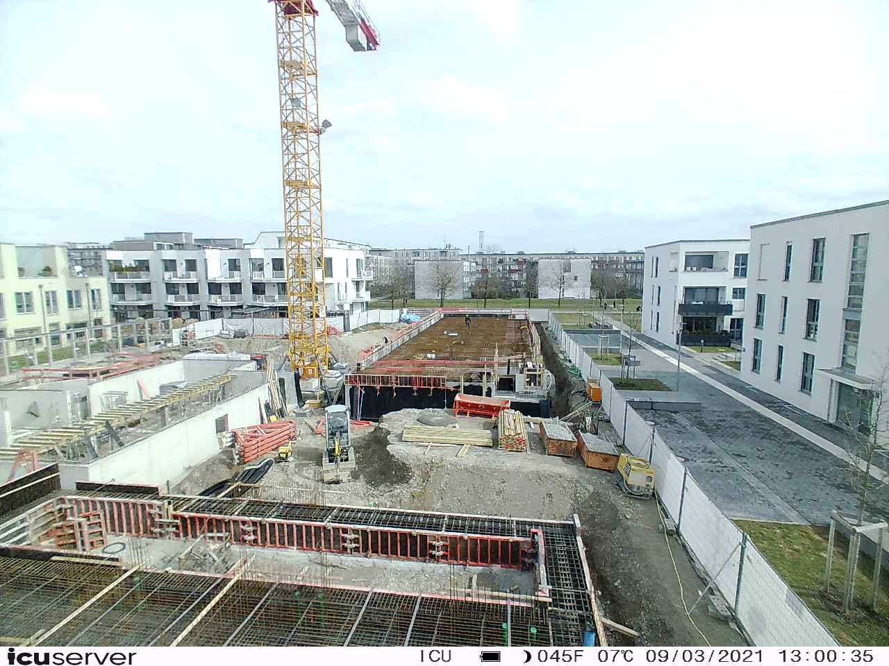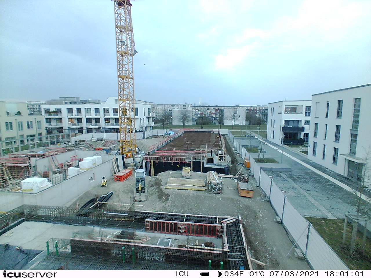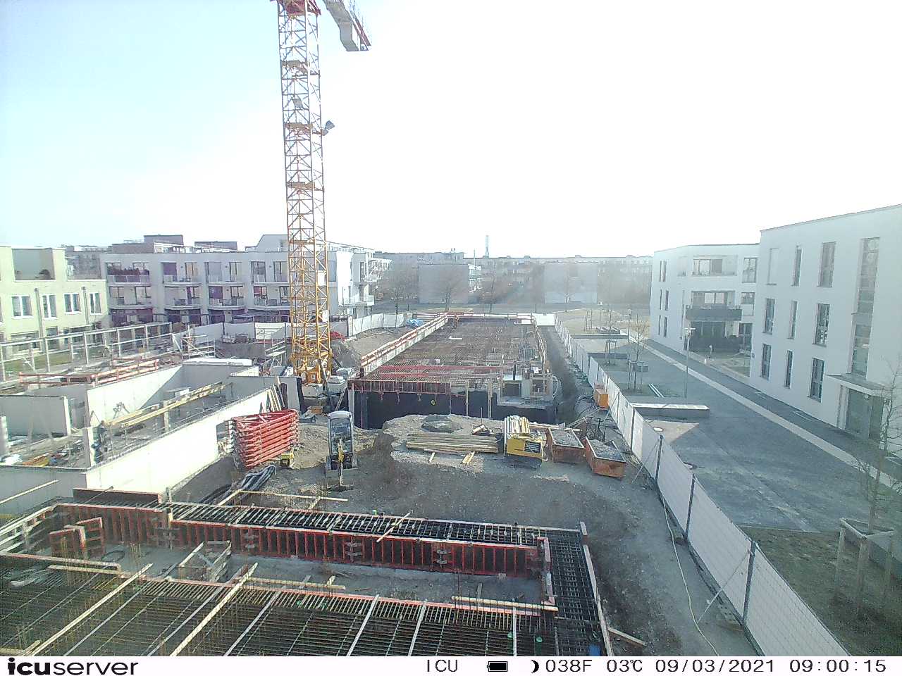 Die Kamera steht am westlichen Ende der Baustelle. Sie blickt nach Osten. Bilder: 26. Februar - 13. August 2021.