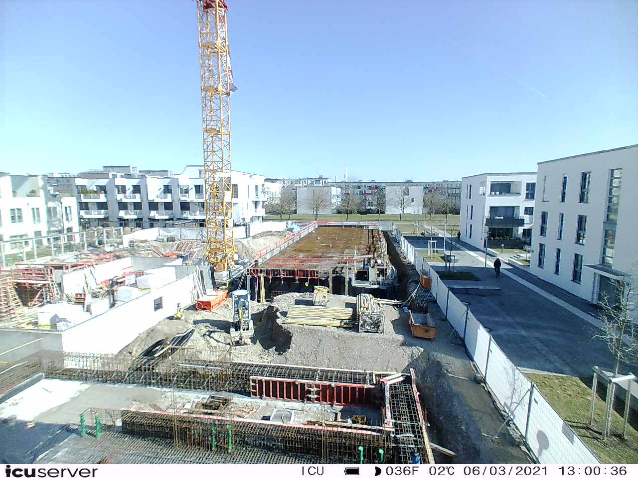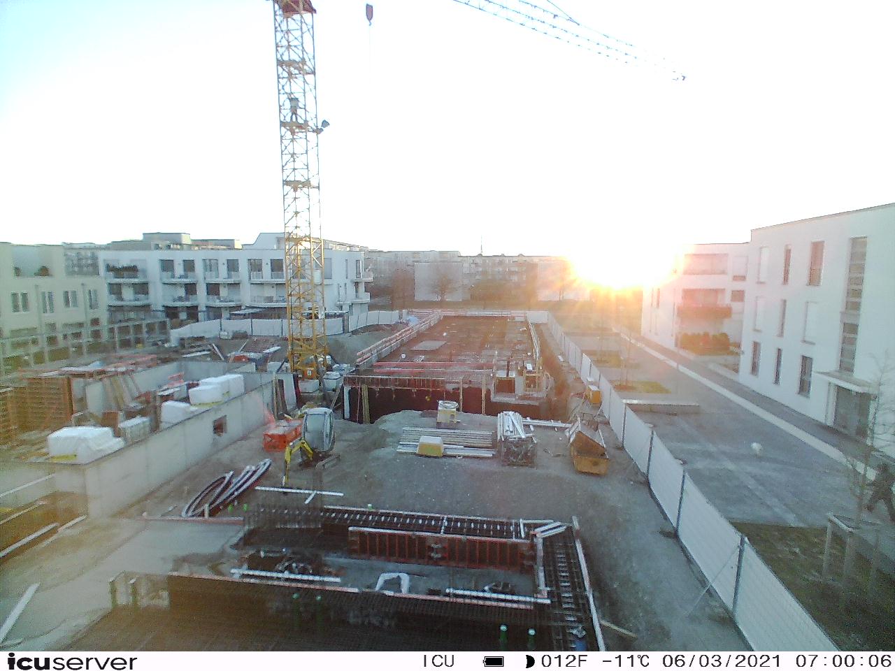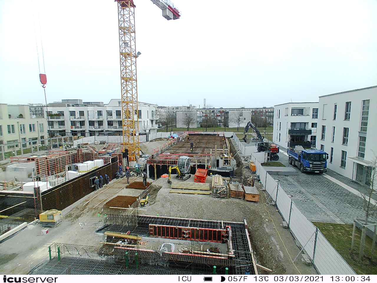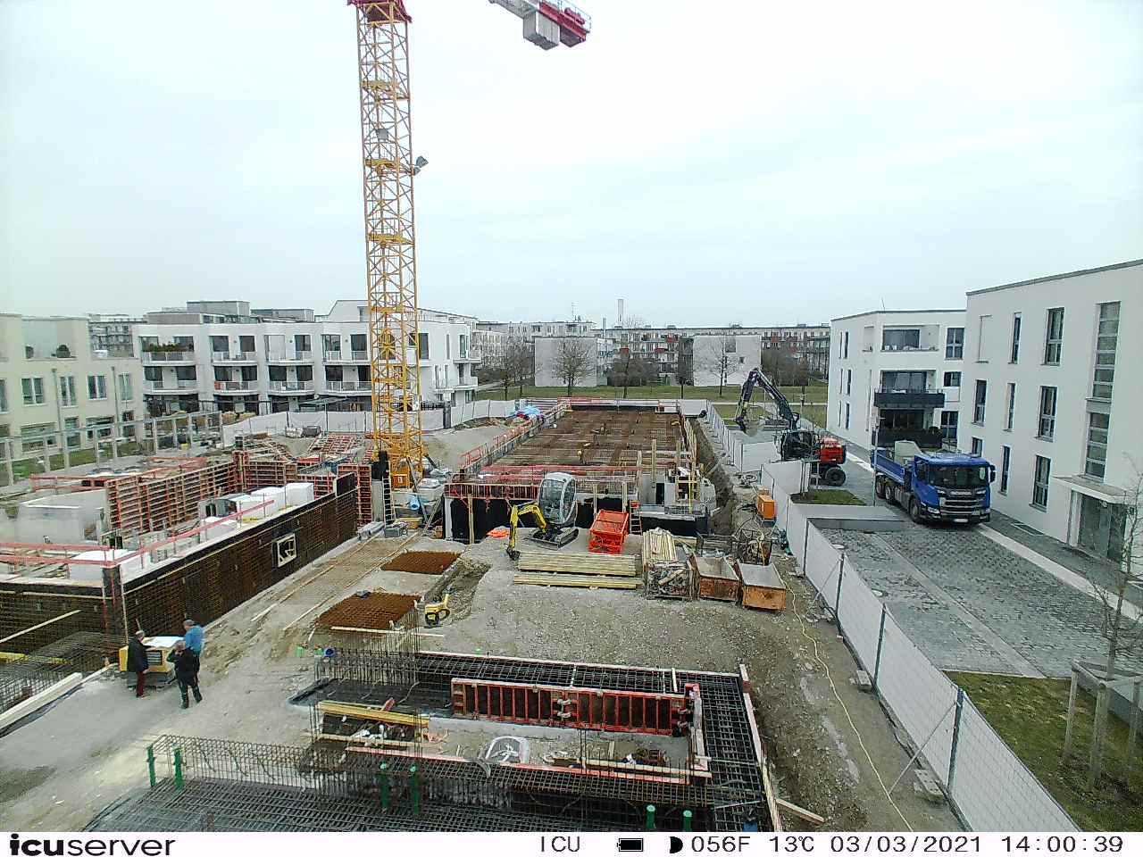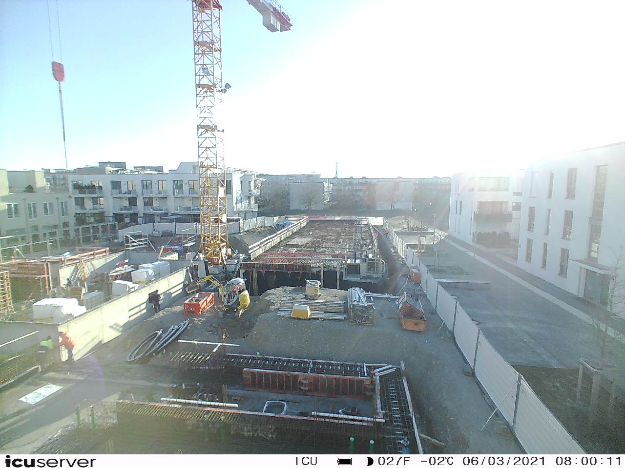 Die Kamera steht am westlichen Ende der Baustelle. Sie blickt nach Osten. Bilder: 26. Februar - 13. August 2021.