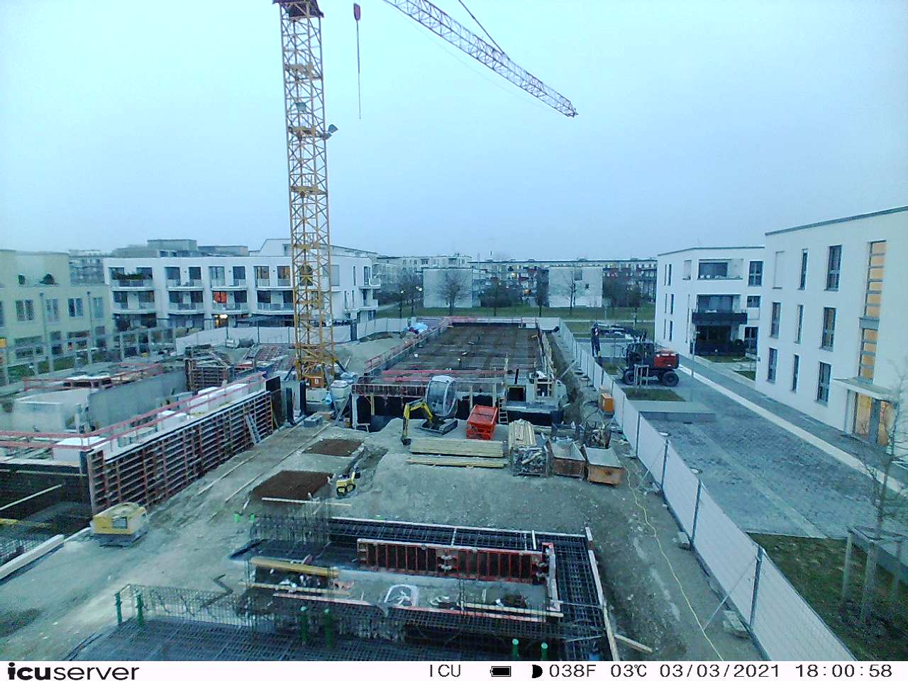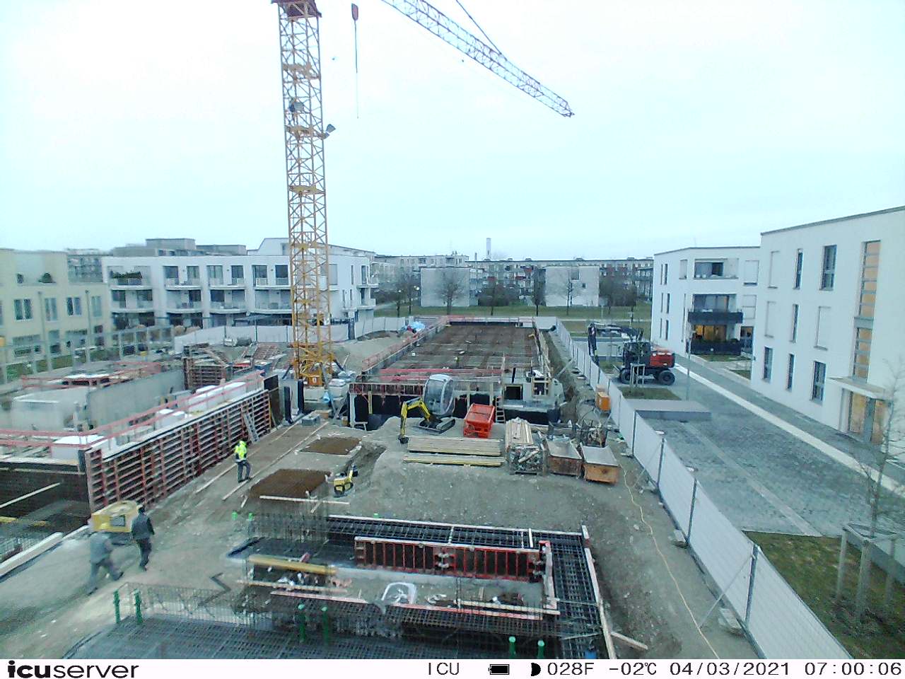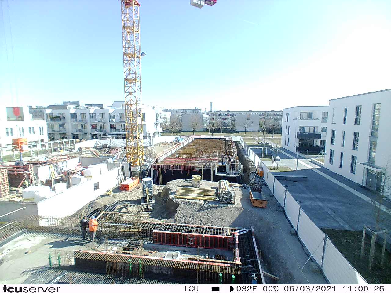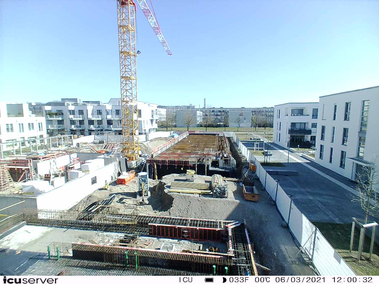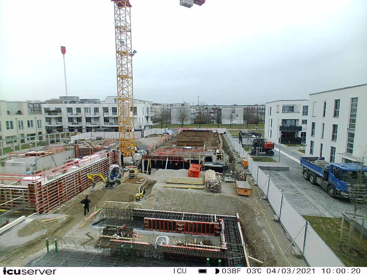 Die Kamera steht am westlichen Ende der Baustelle. Sie blickt nach Osten. Bilder: 26. Februar - 13. August 2021.