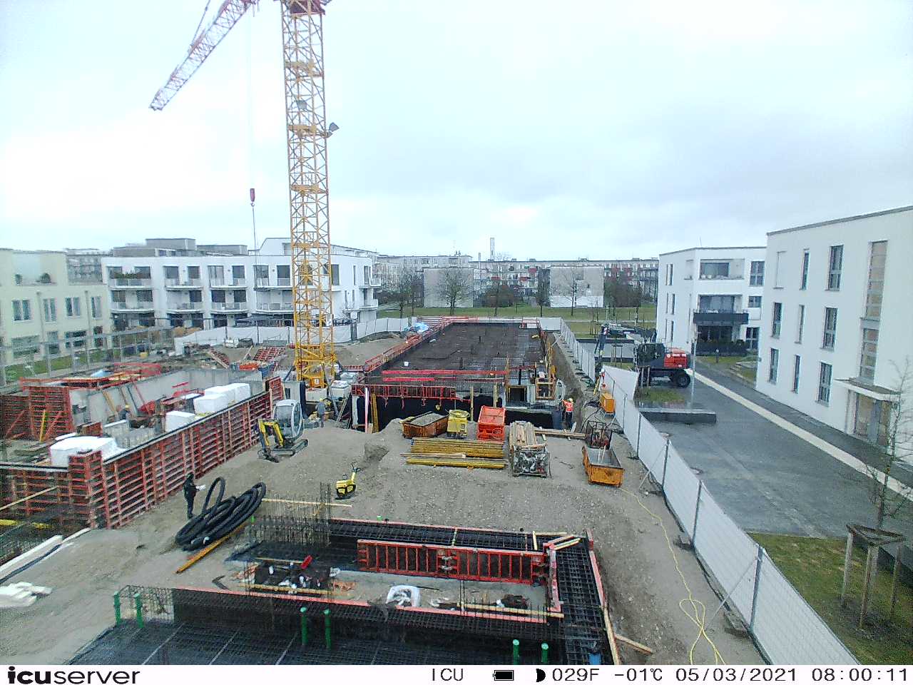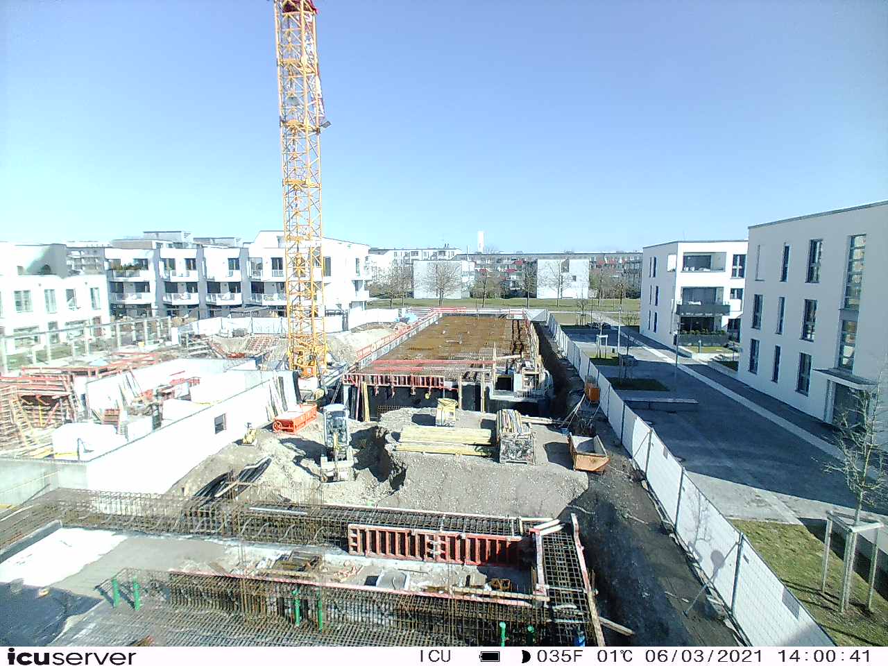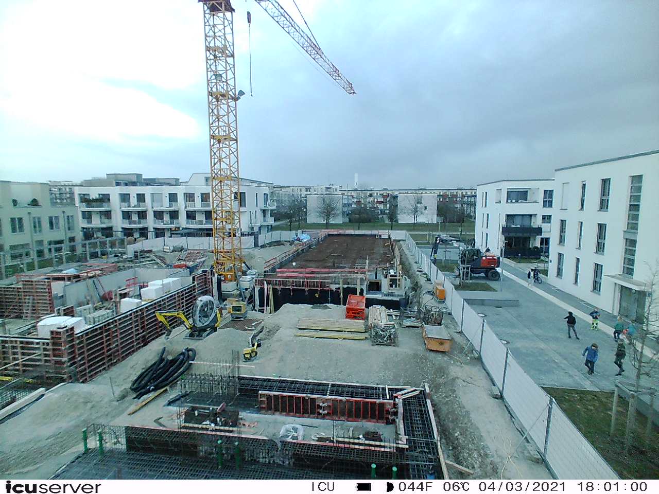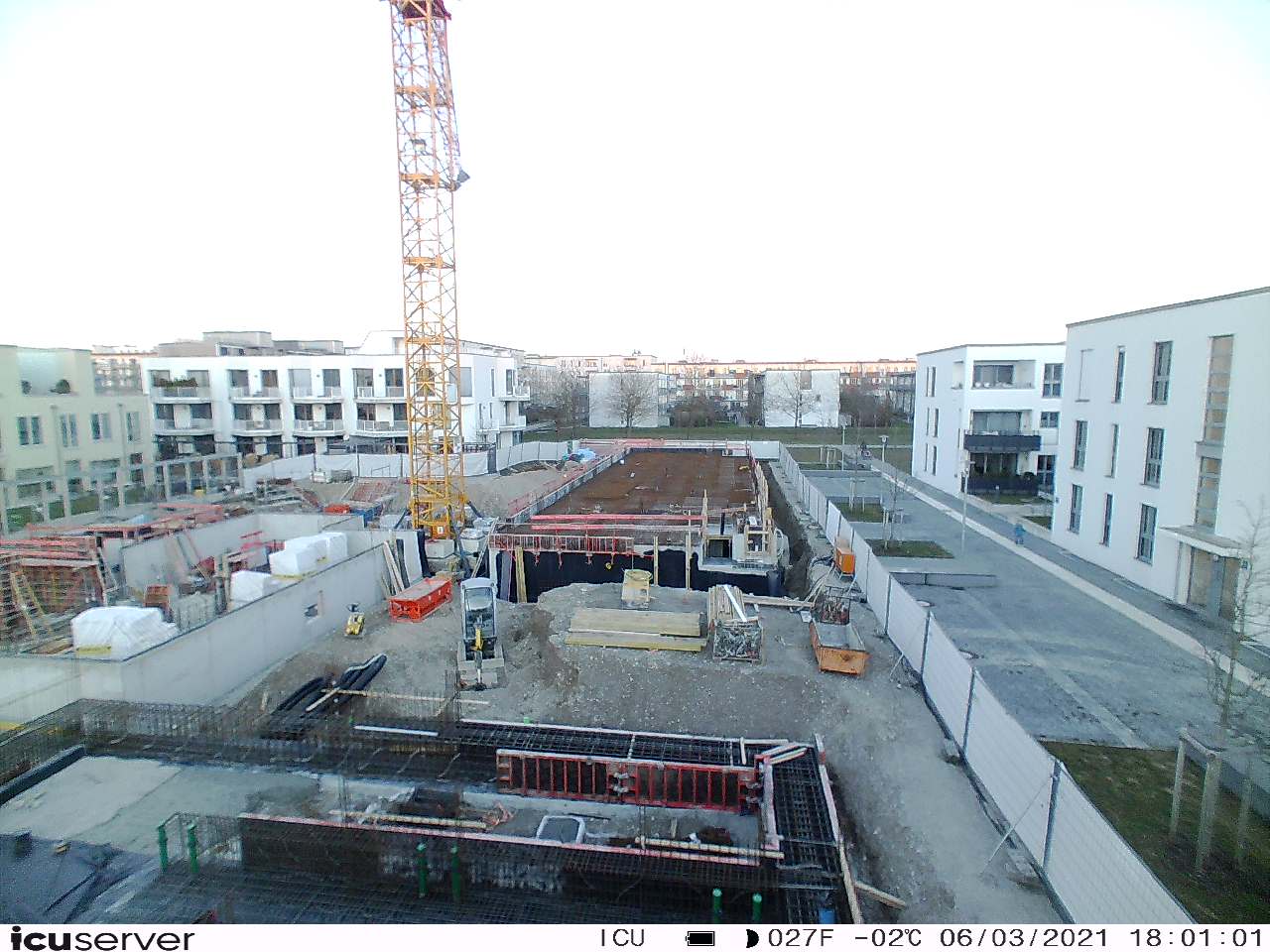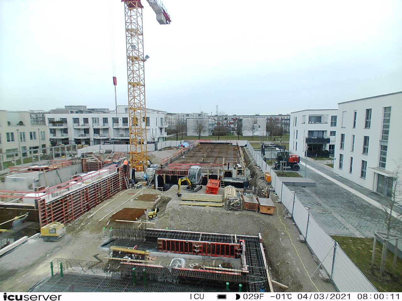Die Kamera steht am westlichen Ende der Baustelle. Sie blickt nach Osten. Bilder: 26. Februar - 13. August 2021.