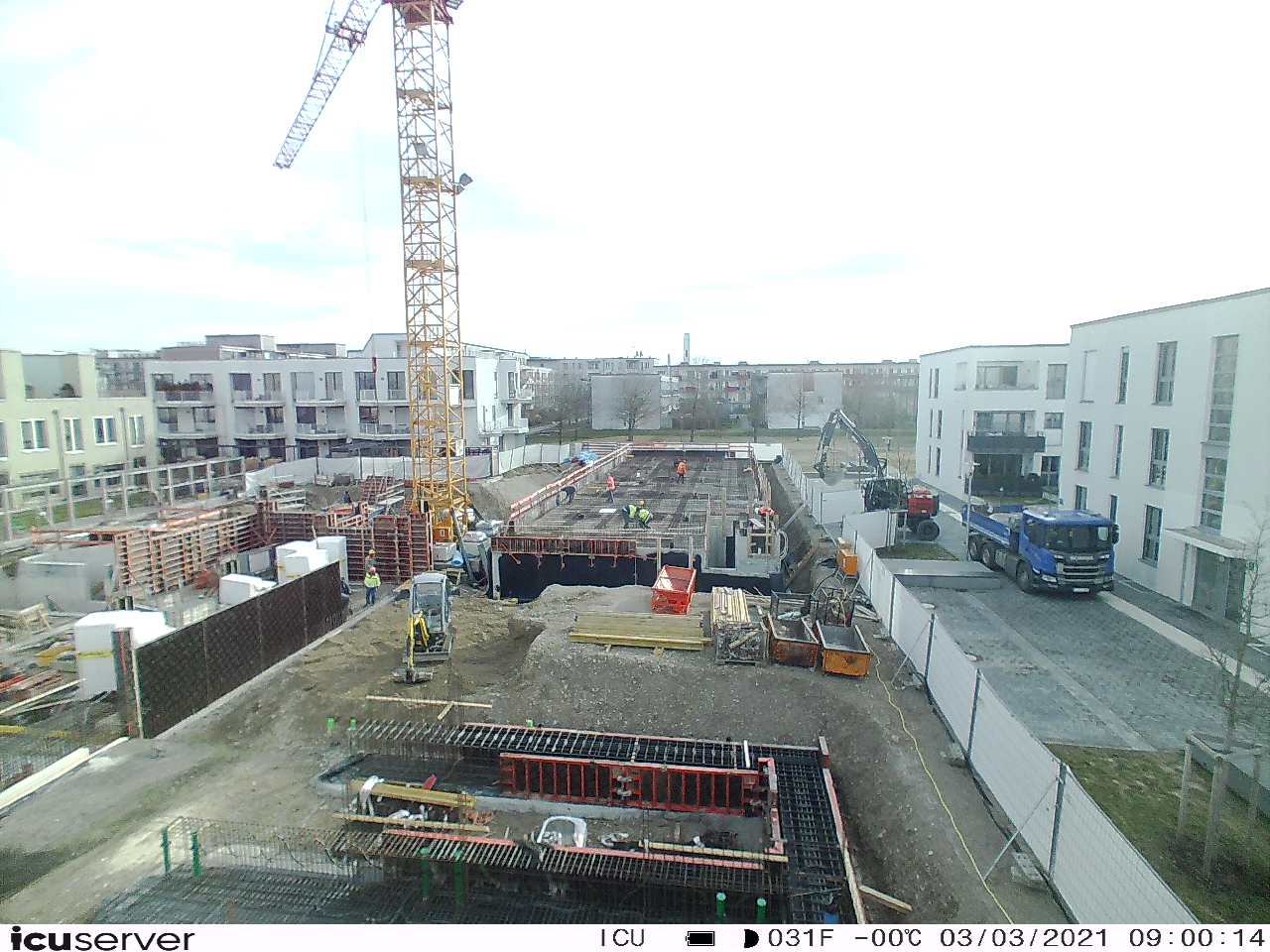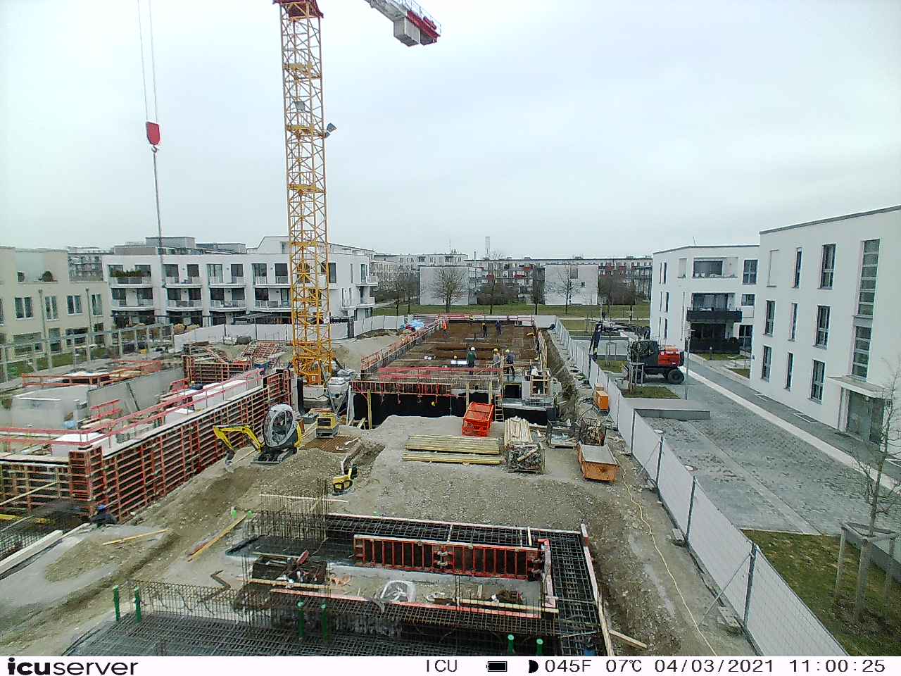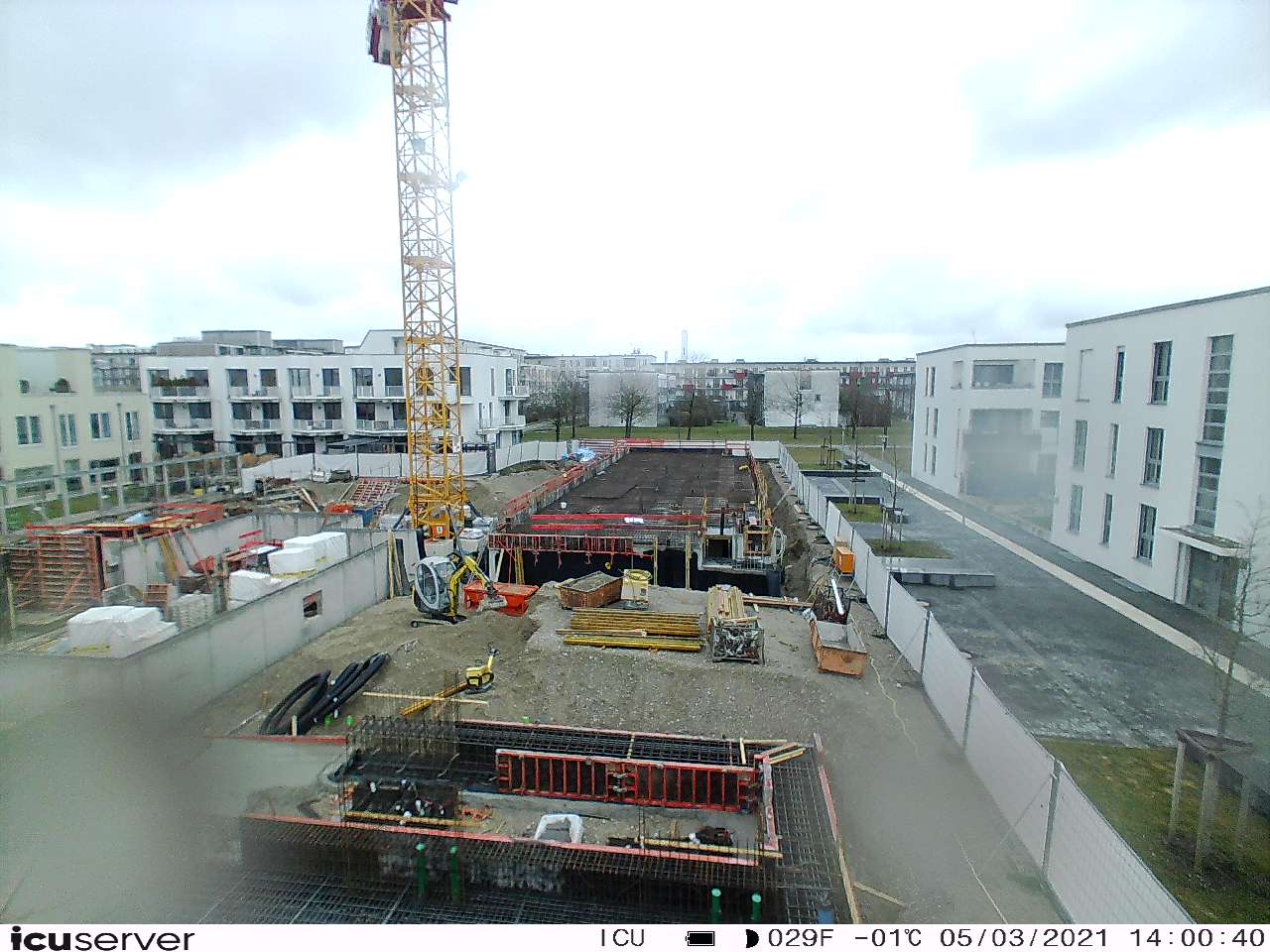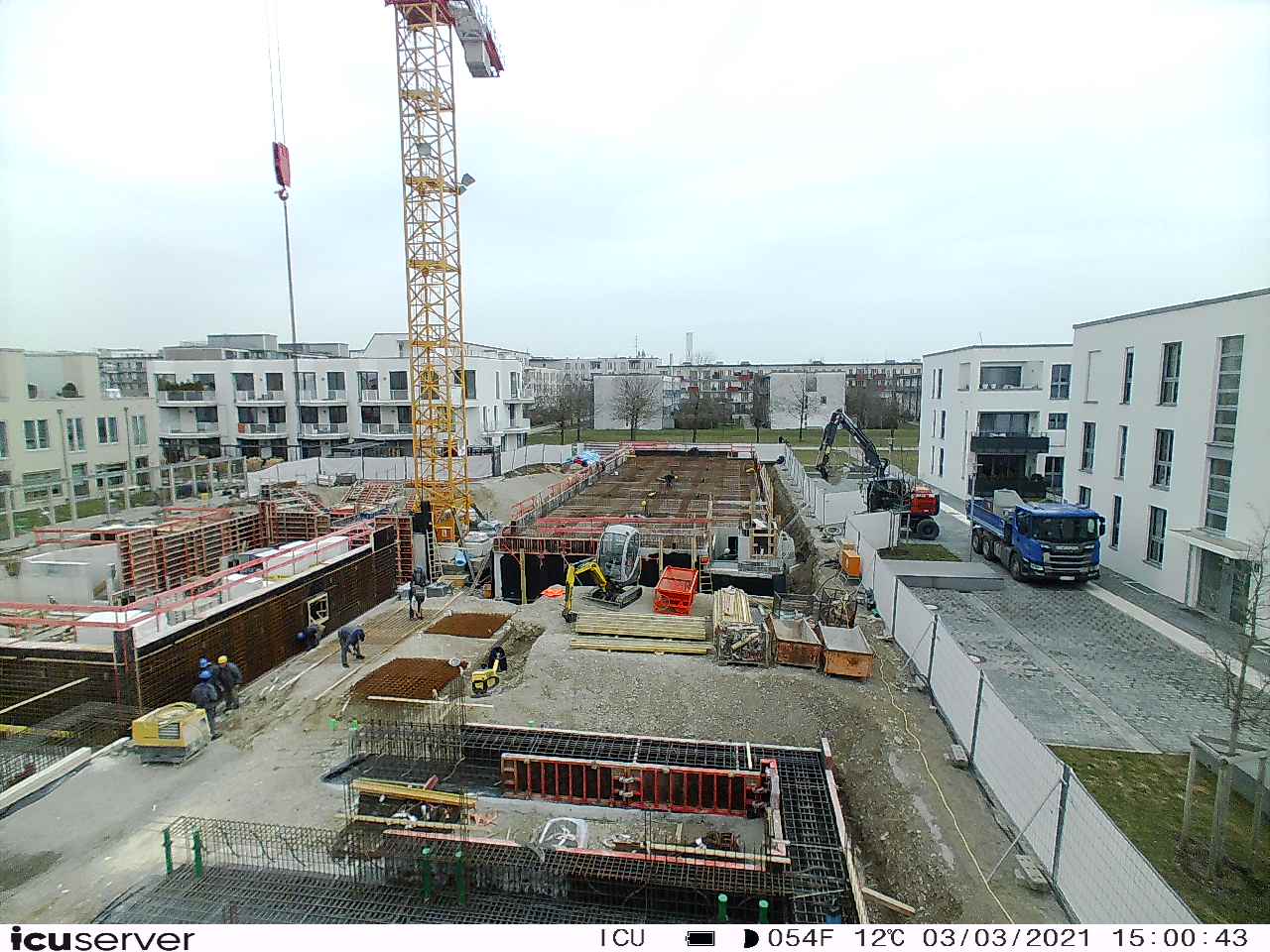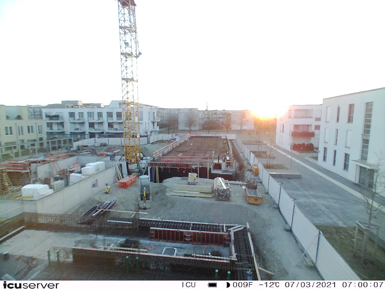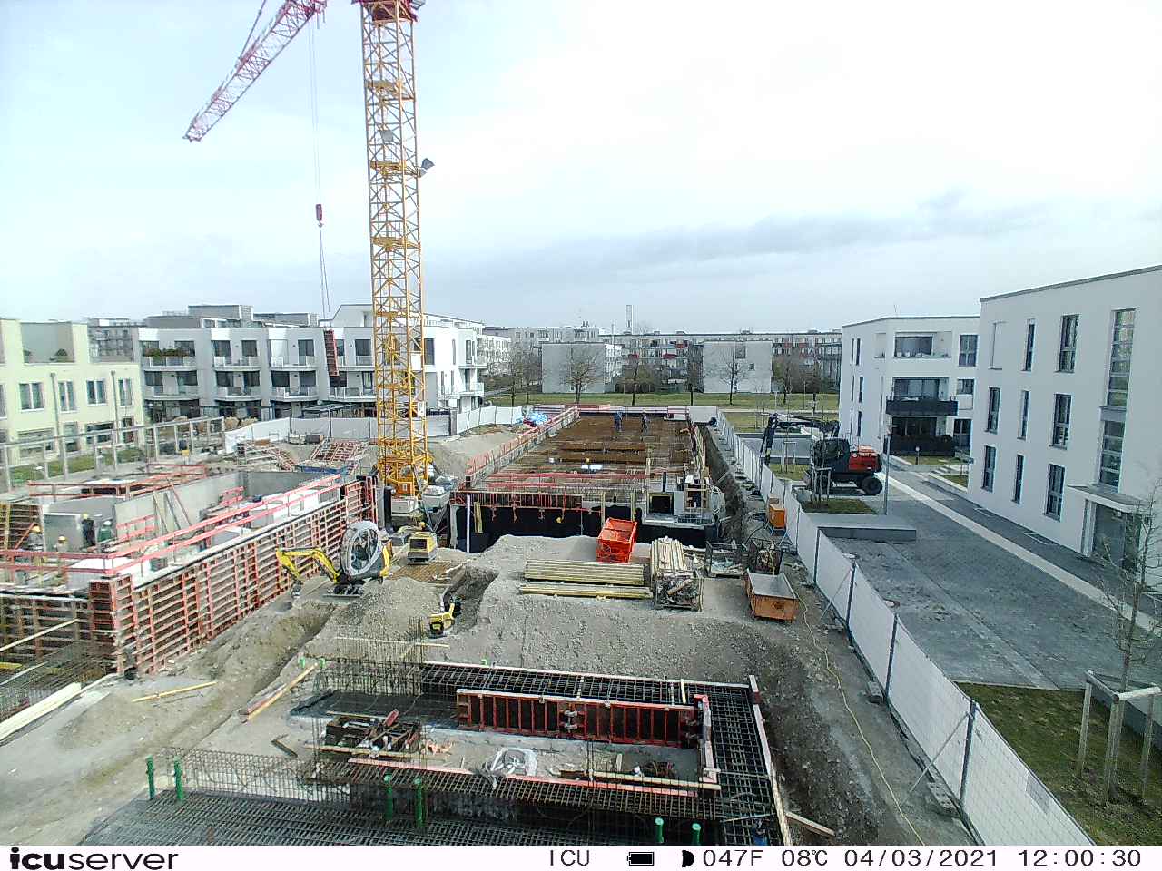 Die Kamera steht am westlichen Ende der Baustelle. Sie blickt nach Osten. Bilder: 26. Februar - 13. August 2021.