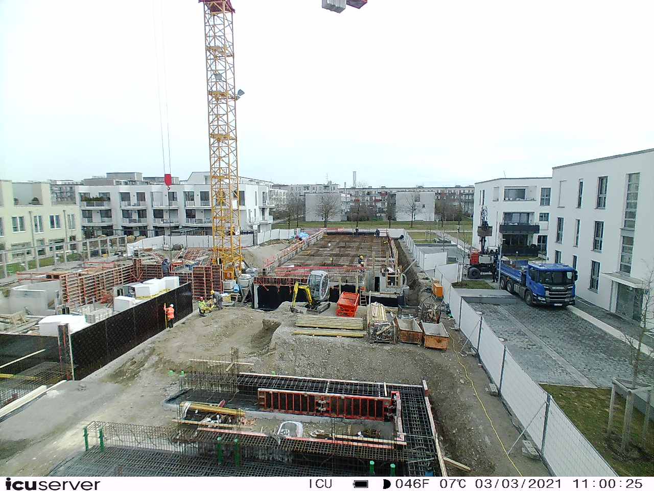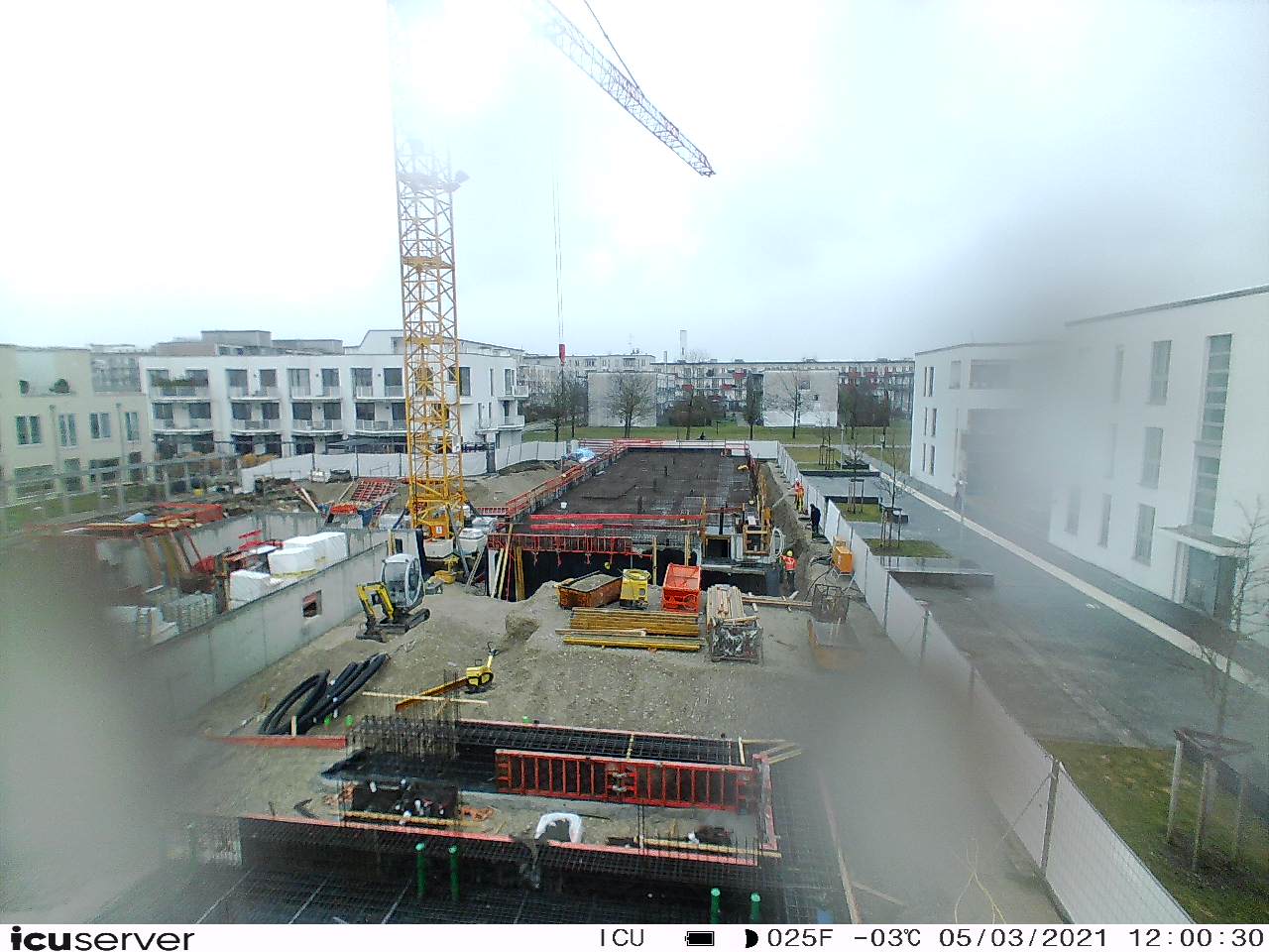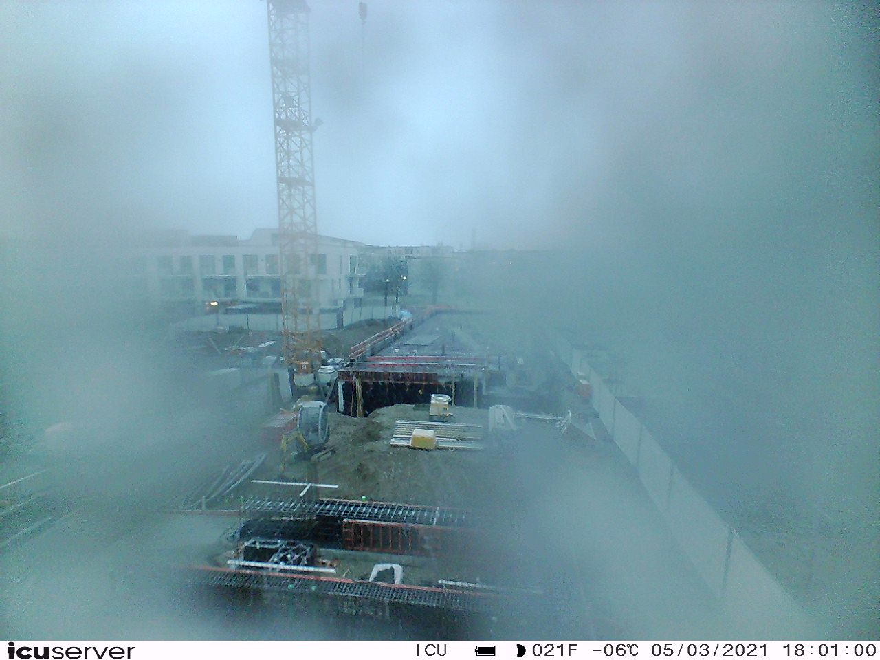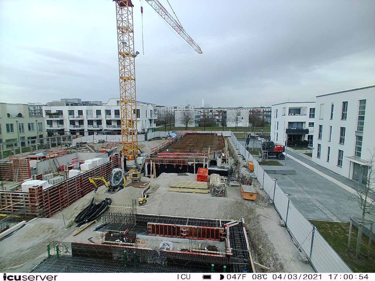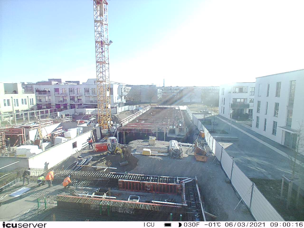 Die Kamera steht am westlichen Ende der Baustelle. Sie blickt nach Osten. Bilder: 26. Februar - 13. August 2021.