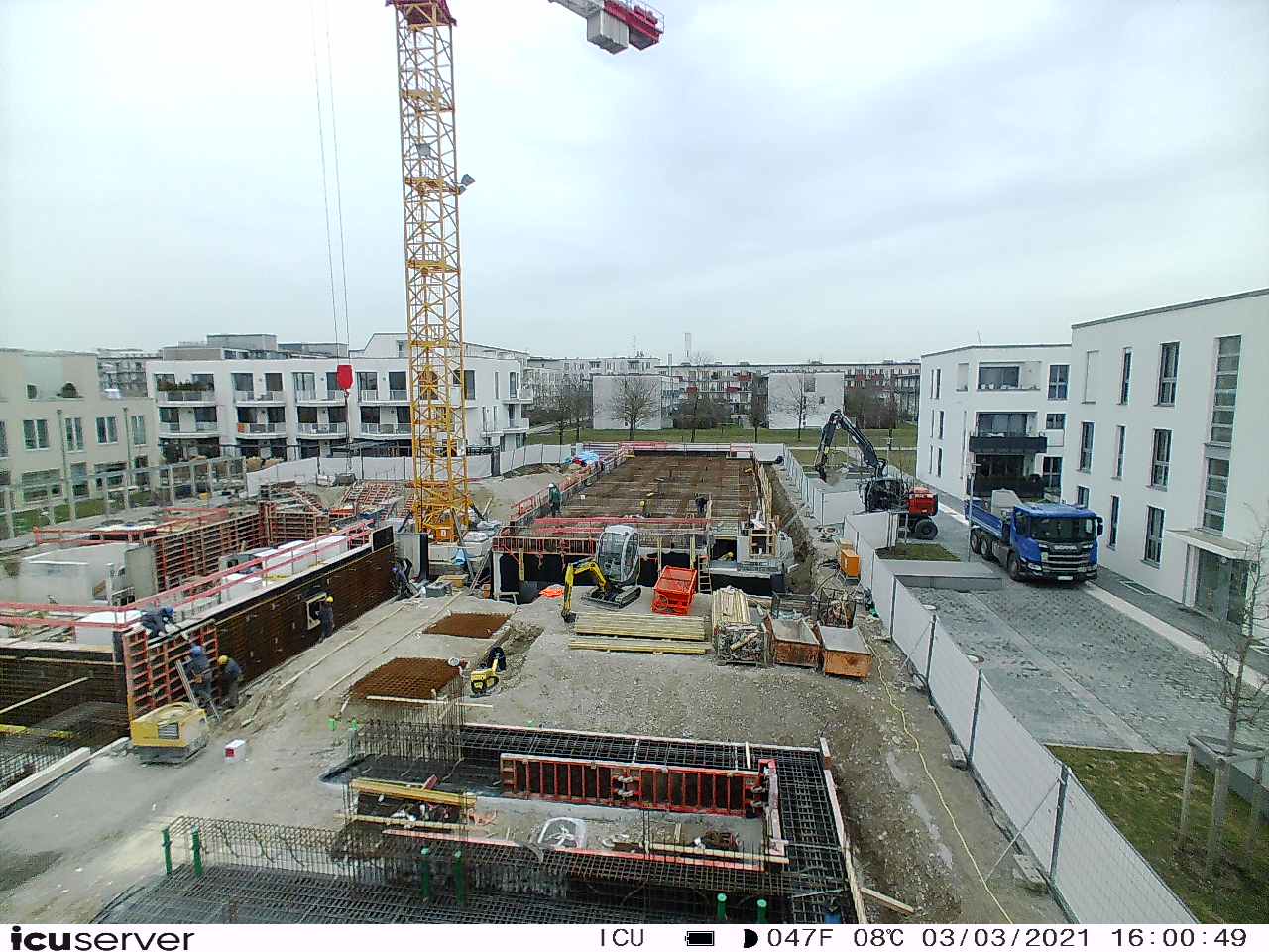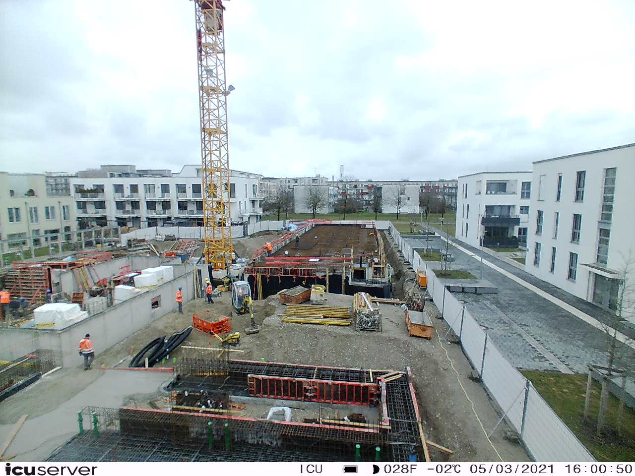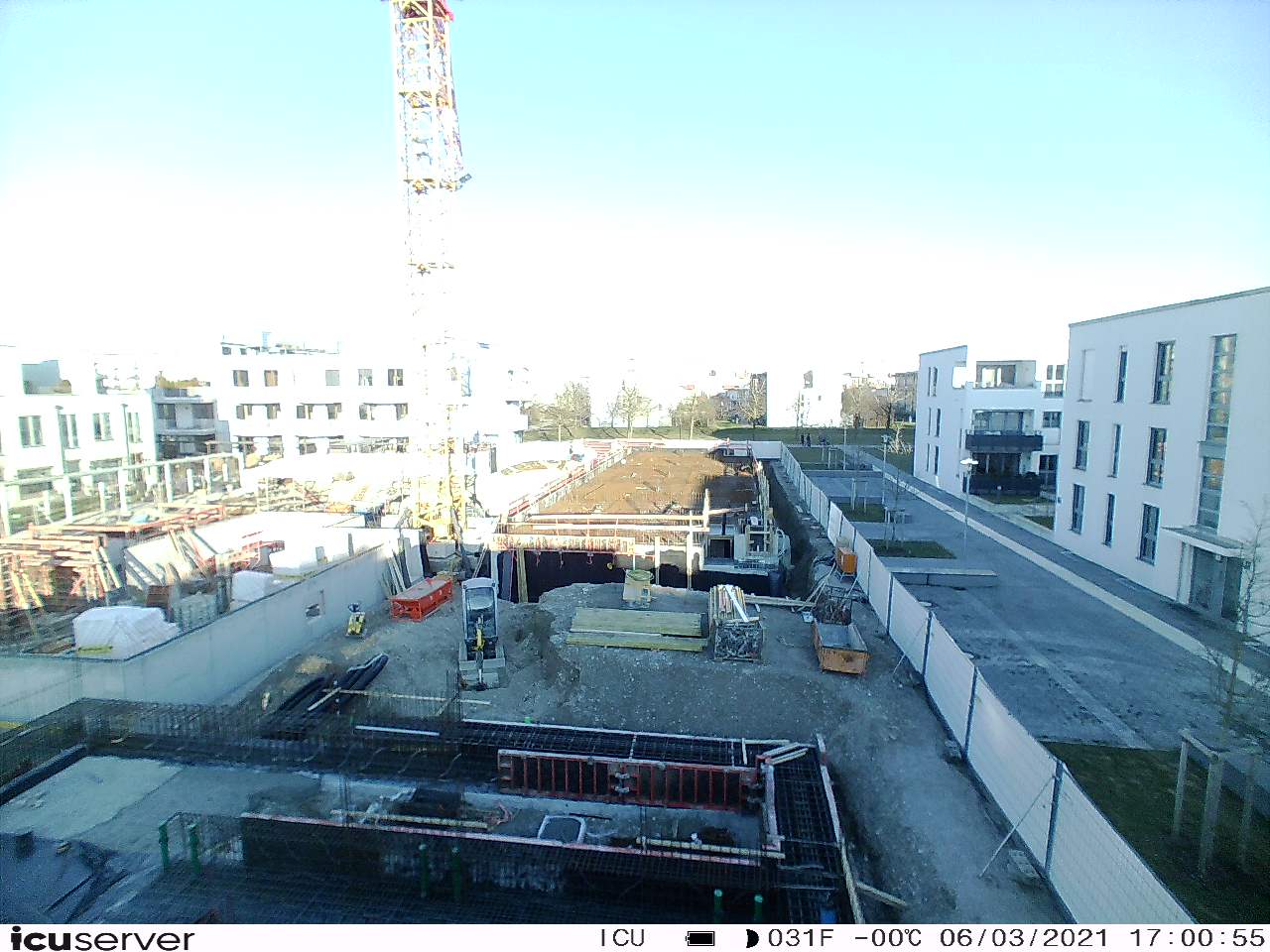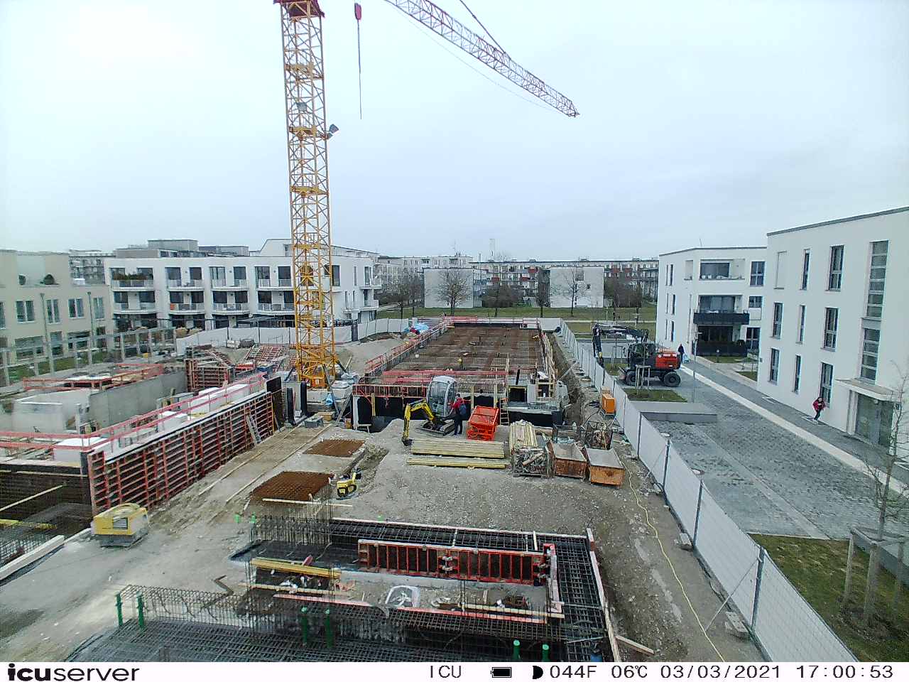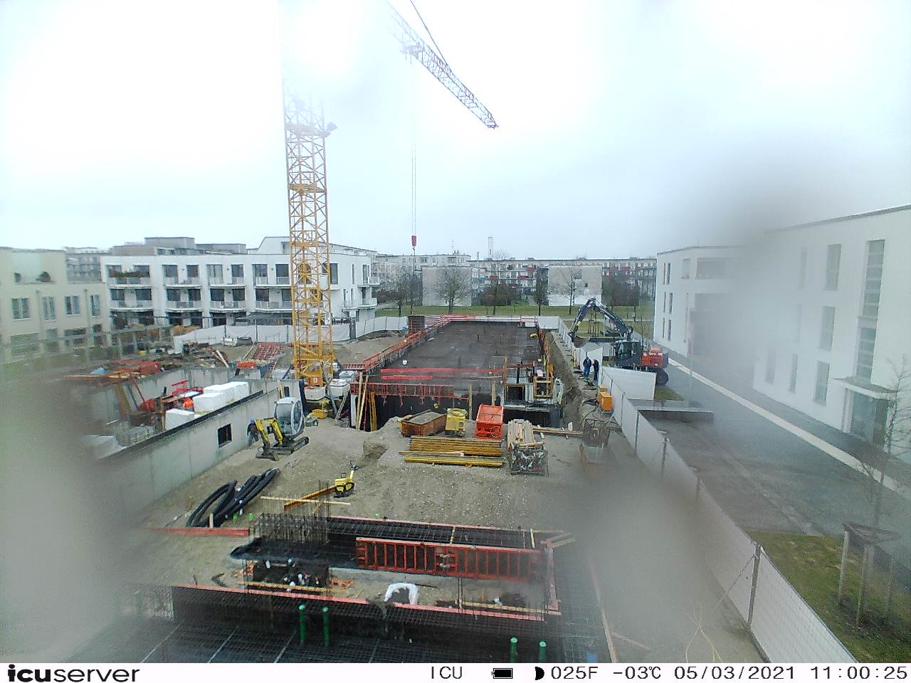 Die Kamera steht am westlichen Ende der Baustelle. Sie blickt nach Osten. Bilder: 26. Februar - 13. August 2021.