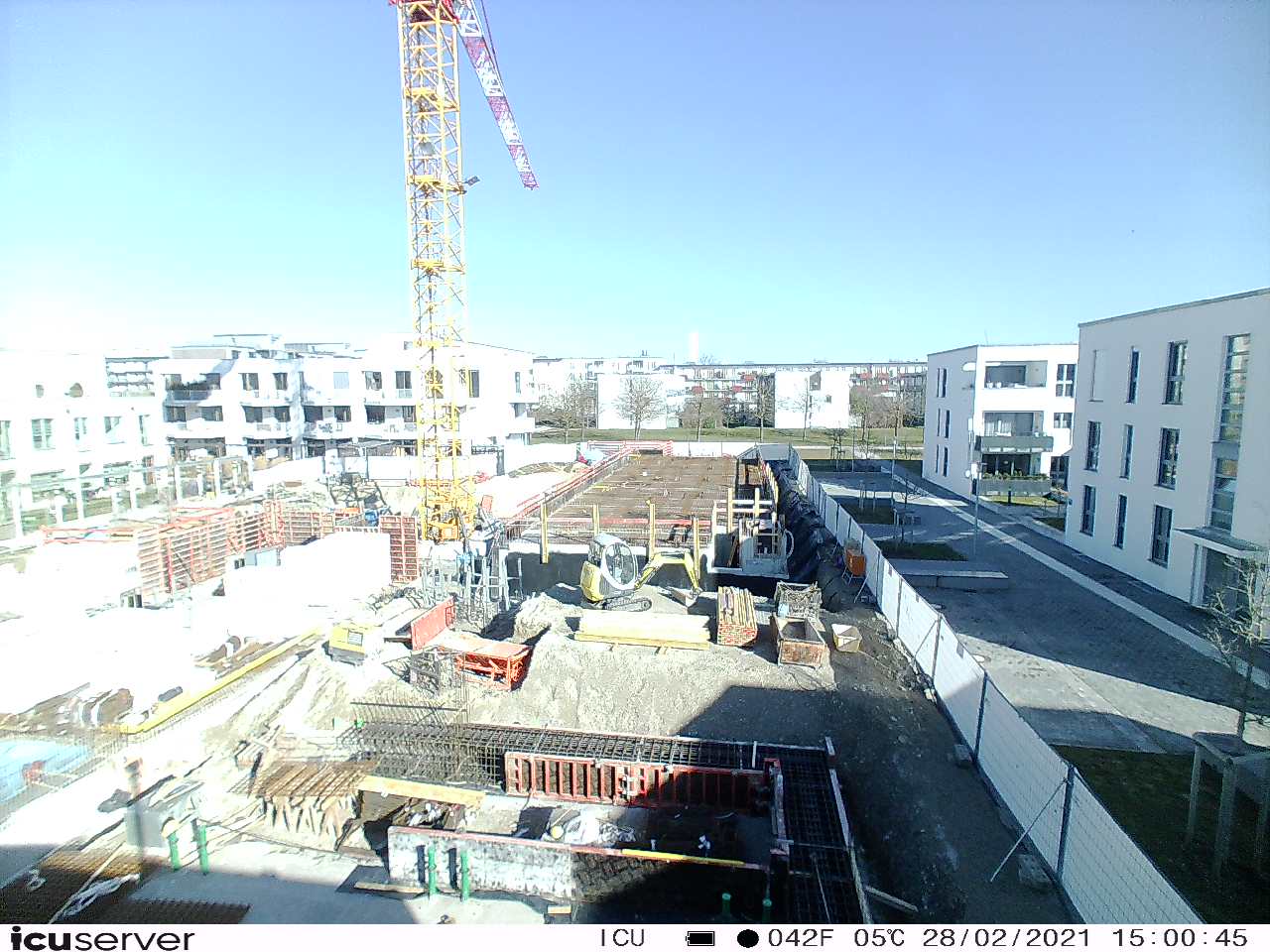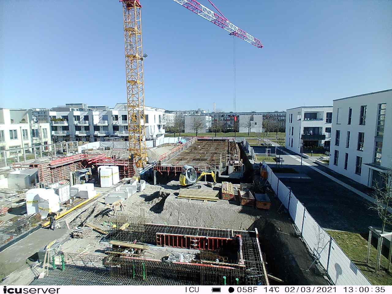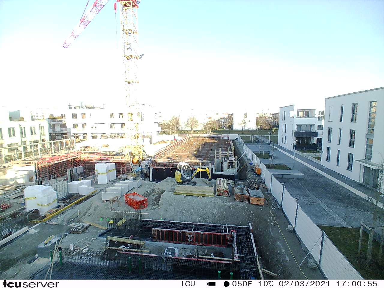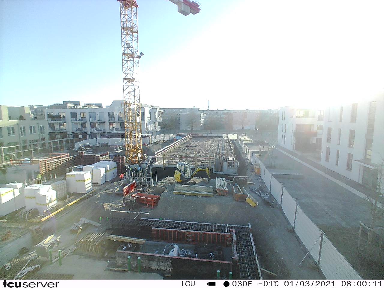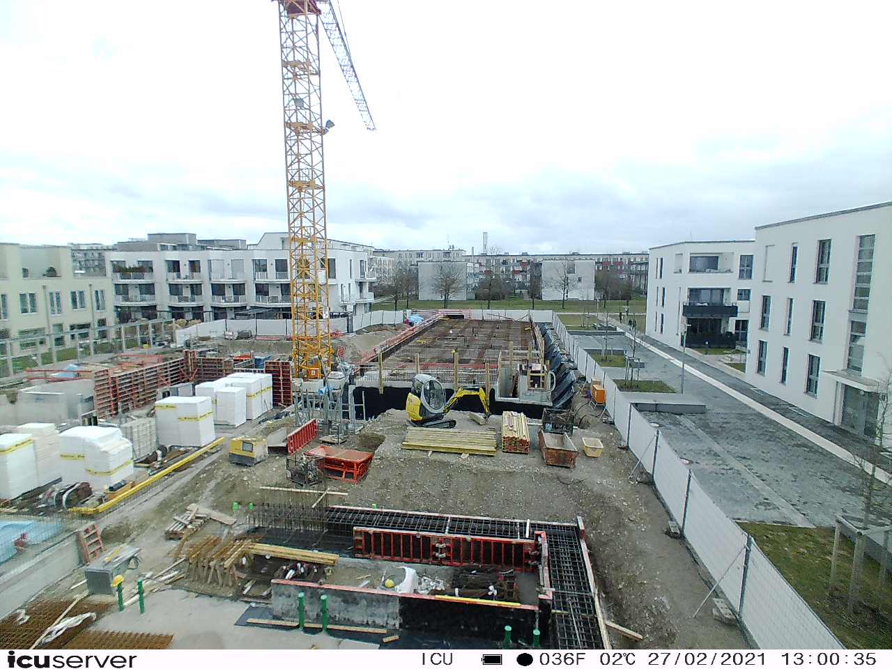 Die Kamera steht am westlichen Ende der Baustelle. Sie blickt nach Osten. Bilder: 26. Februar - 13. August 2021.