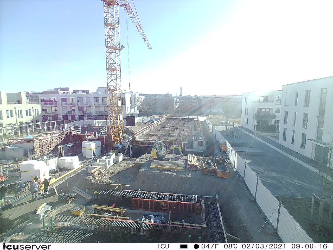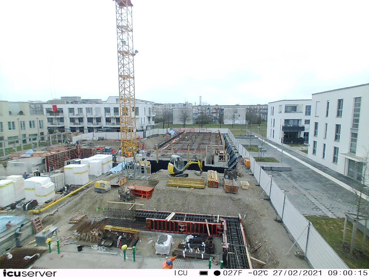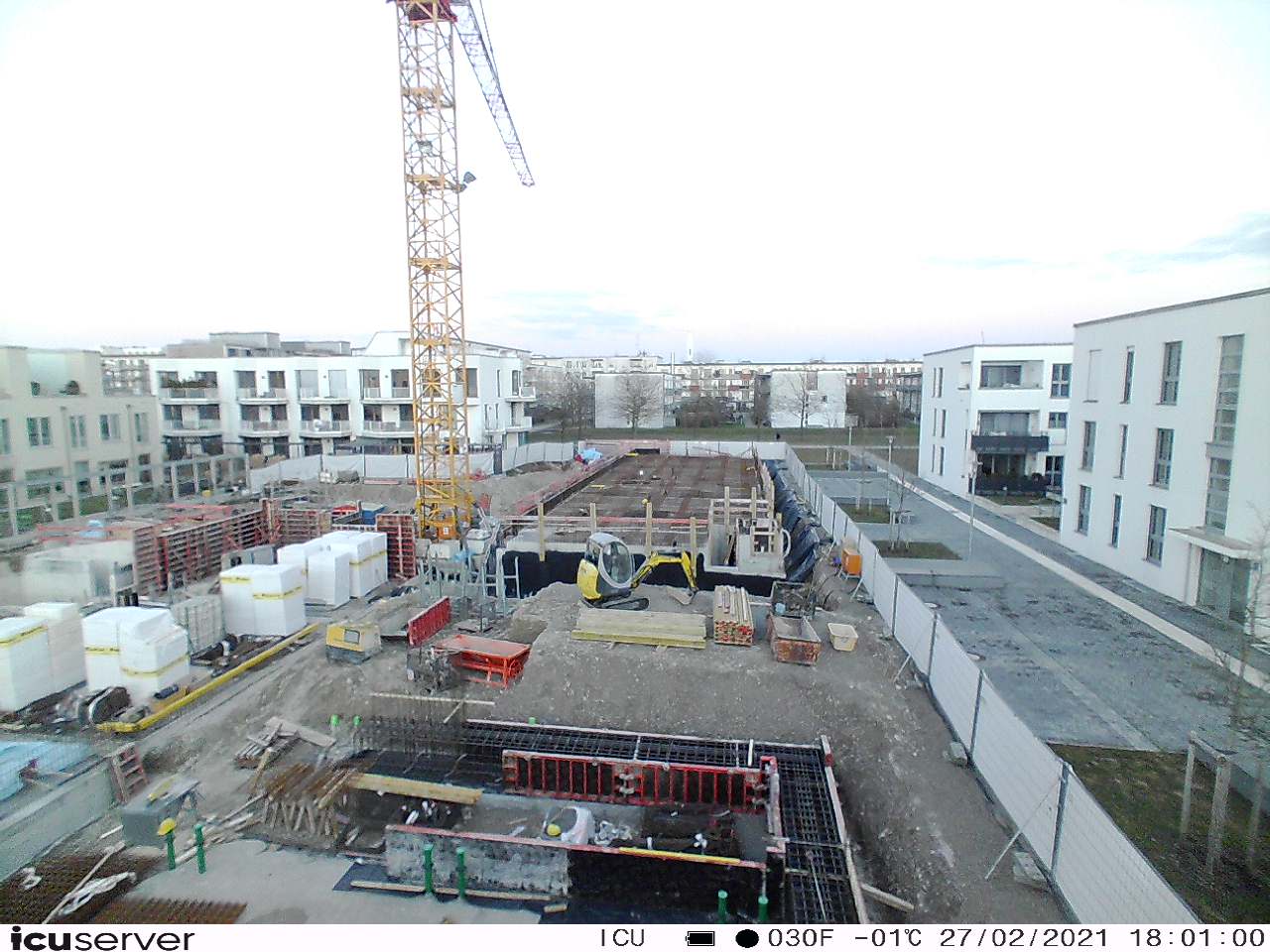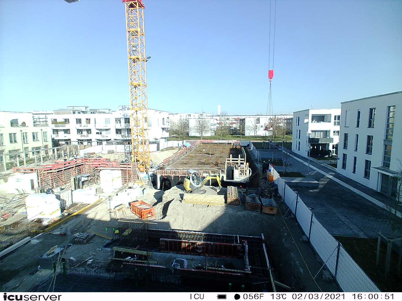Die Kamera steht am westlichen Ende der Baustelle. Sie blickt nach Osten. Bilder: 26. Februar - 13. August 2021.