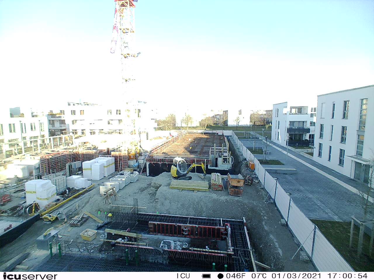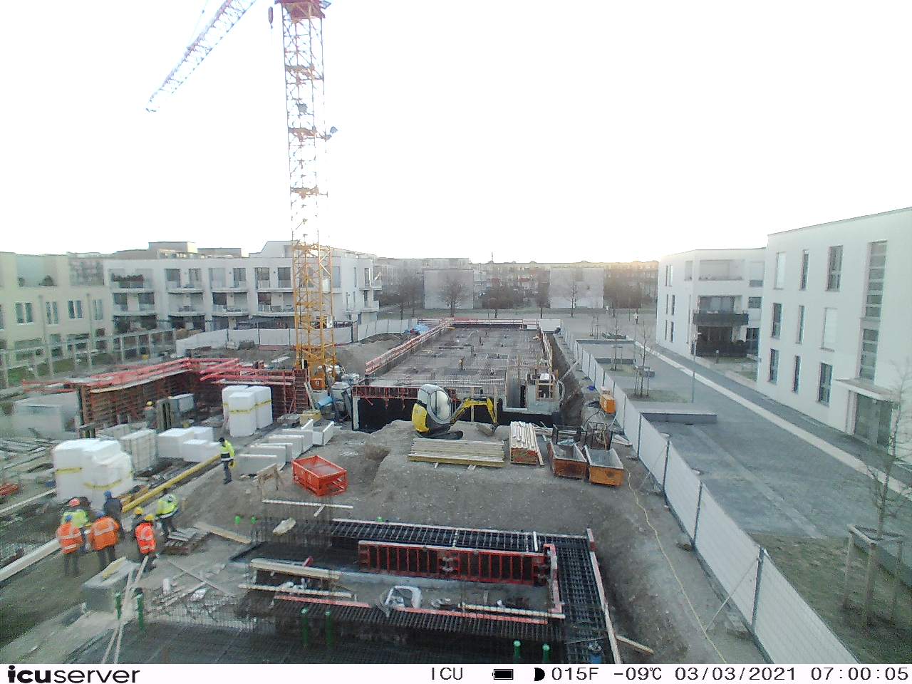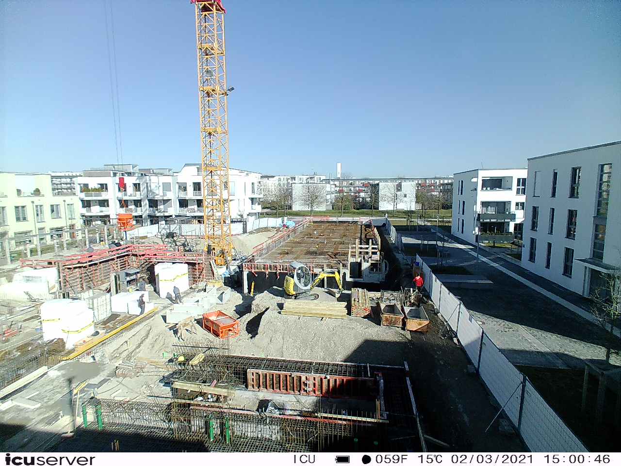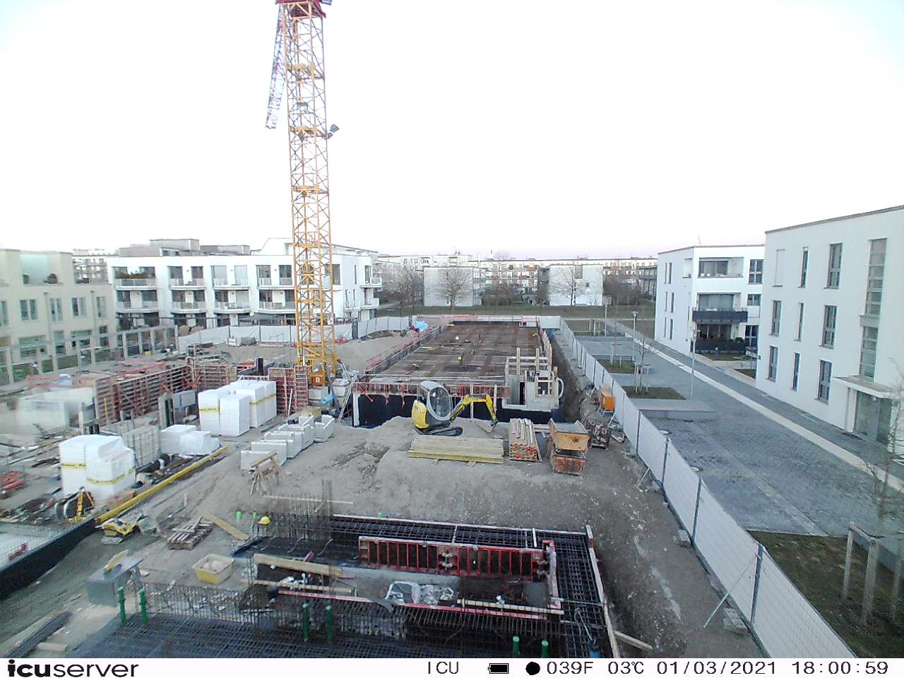 Die Kamera steht am westlichen Ende der Baustelle. Sie blickt nach Osten. Bilder: 26. Februar - 13. August 2021.
