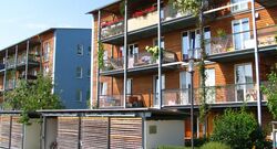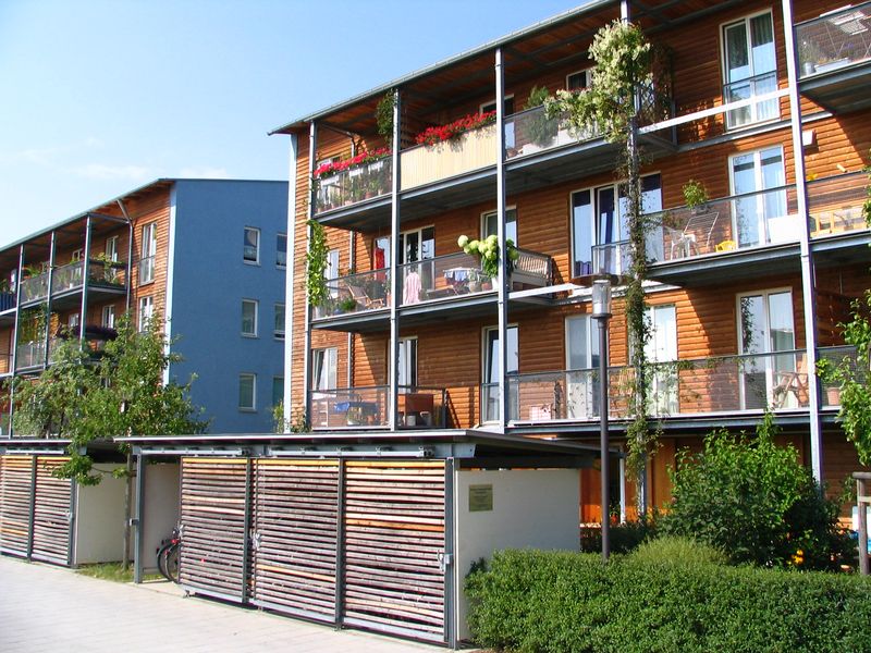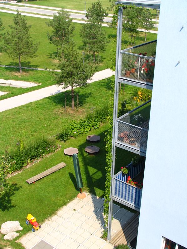 Das Neubauprojekt in der Messestadt Riem verfolgt von Anfang an das Ziel, ökologisches, kosten- und flächensparendes Bauen sowie autoreduziertes Wohnen zu verknüpfen. Für 28 Wohnungen stehen sechs Stellplätze zur Verfügung.