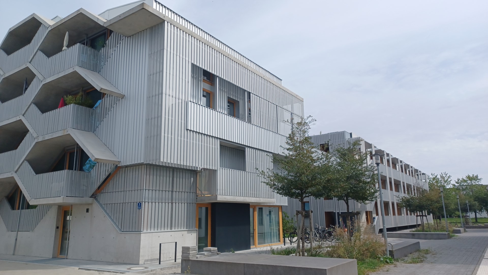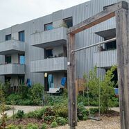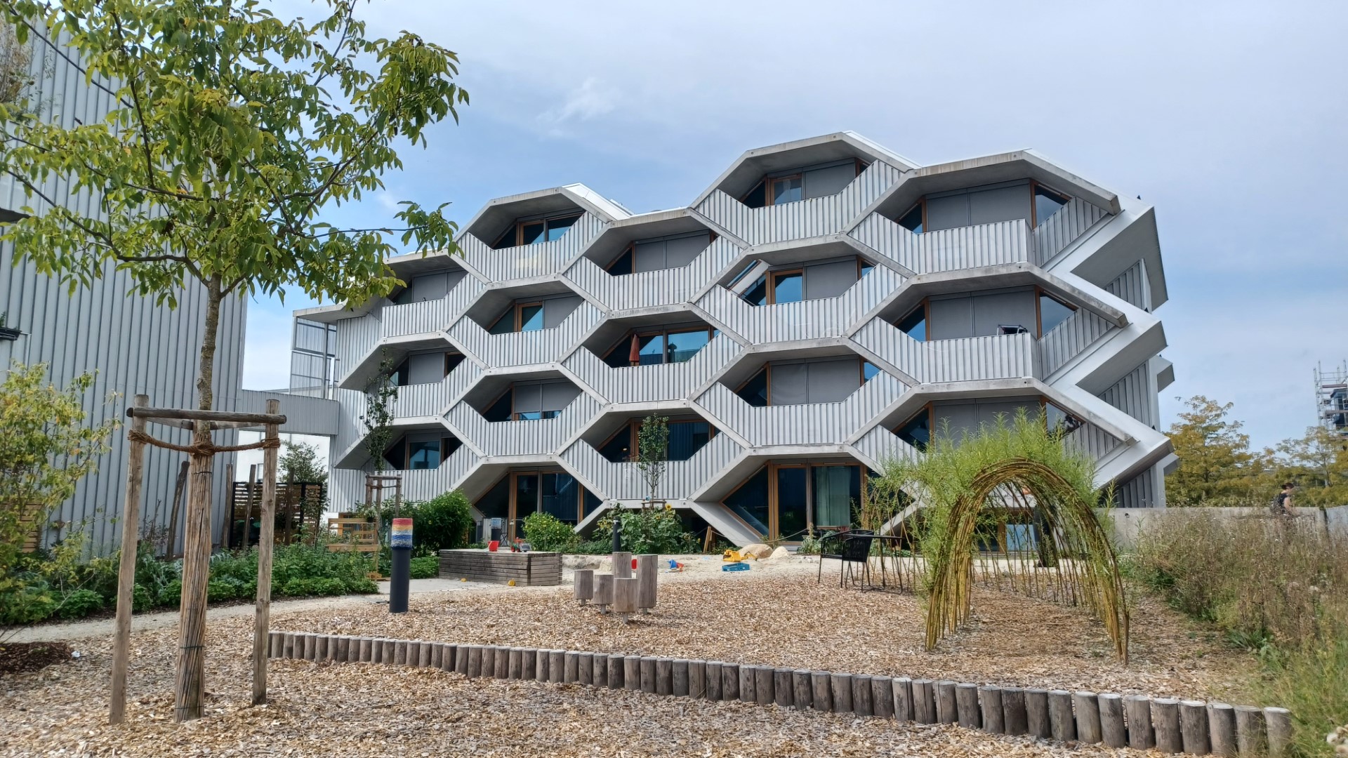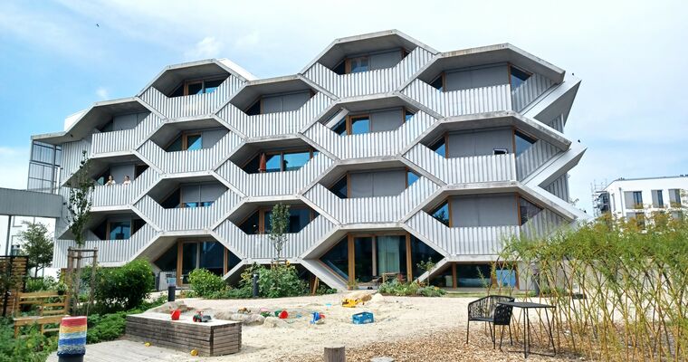 Da ist zum einen das sogenannte "Gartenhaus" mit seinen 4-5 Zimmer Familienwohnungen, zum anderen, direkt am baumbestandenen Quartiersplatz gelegen, das architektonisch innovative und ungewöhnliche "Wabenhaus" mit meist kleineren und in der Mehrzahl wabenförmigen, also sechs-eckigen Wohneinheiten. Aber auch ganz normale 1-4 Zimmerwohnungen, so man bei einer Wabenform von "ganz normal" sprechen kann, gibt es im "Wabenhaus".