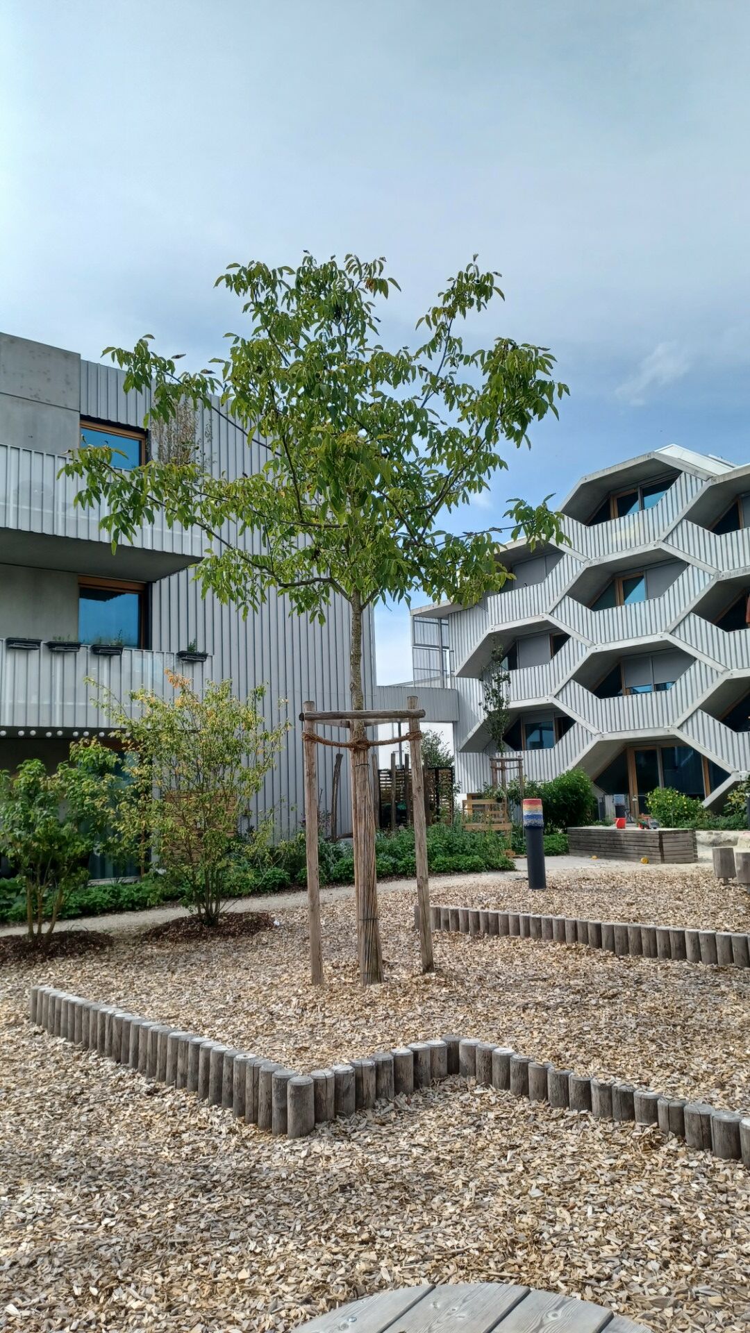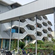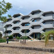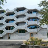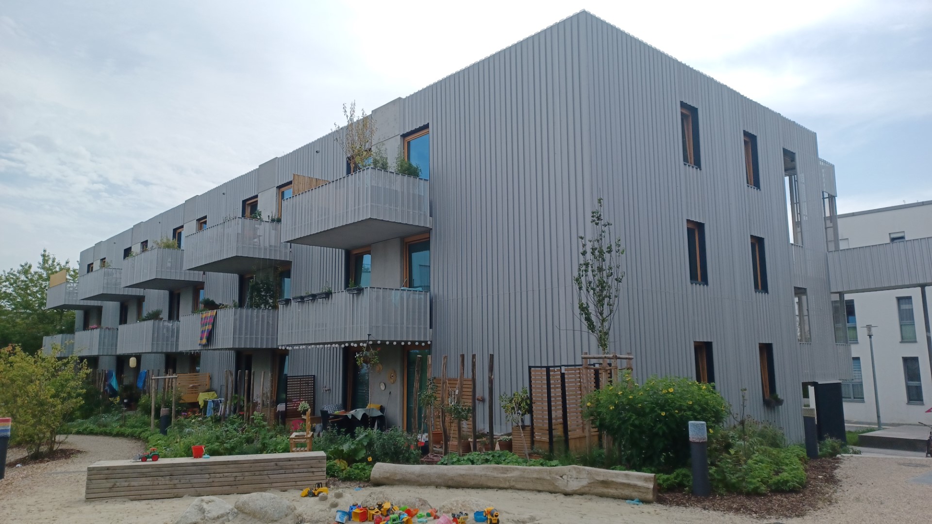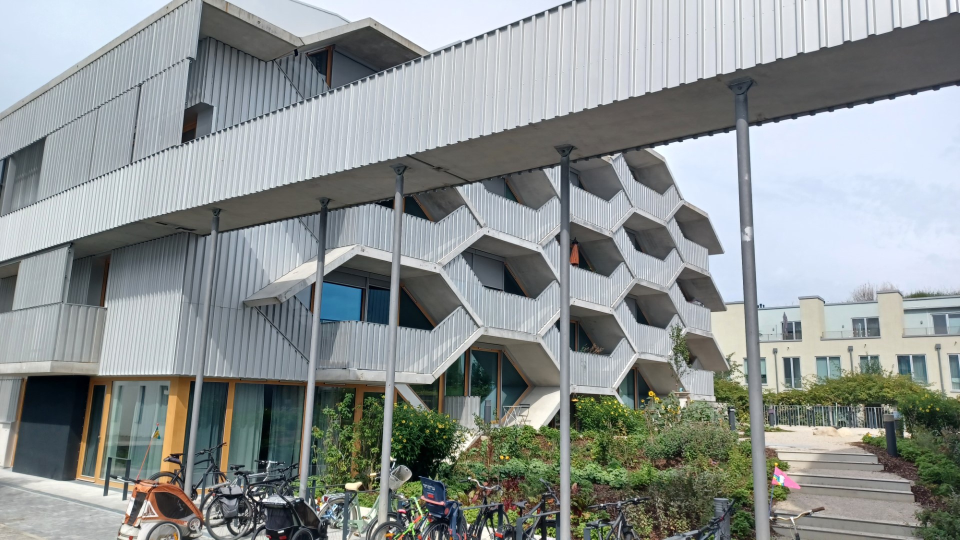 Da ist zum einen das sogenannte "Gartenhaus" mit seinen 4-5 Zimmer Familienwohnungen, zum anderen, direkt am baumbestandenen Quartiersplatz gelegen, das architektonisch innovative und ungewöhnliche "Wabenhaus" mit meist kleineren und in der Mehrzahl wabenförmigen, also sechs-eckigen Wohneinheiten. Aber auch ganz normale 1-4 Zimmerwohnungen, so man bei einer Wabenform von "ganz normal" sprechen kann, gibt es im "Wabenhaus".