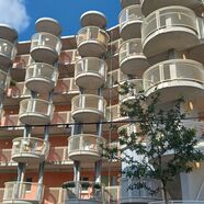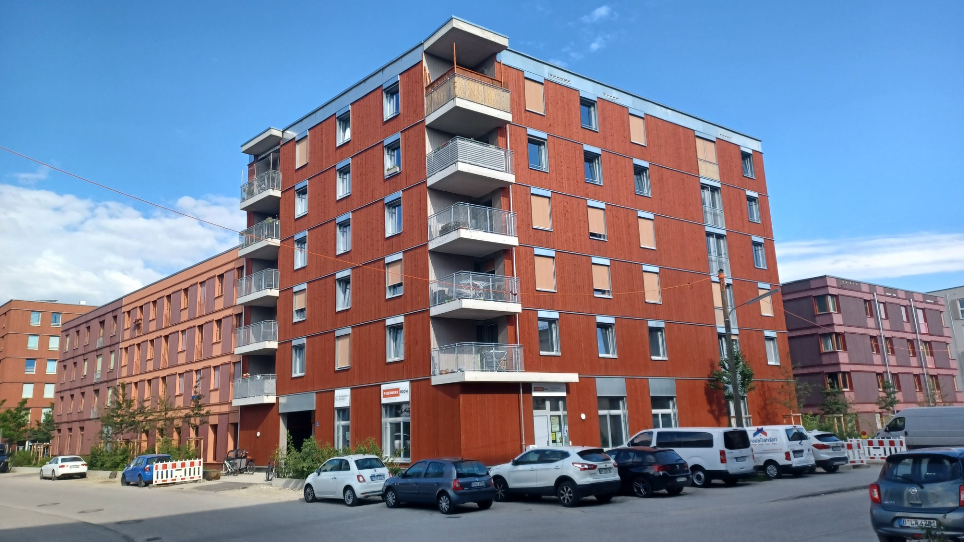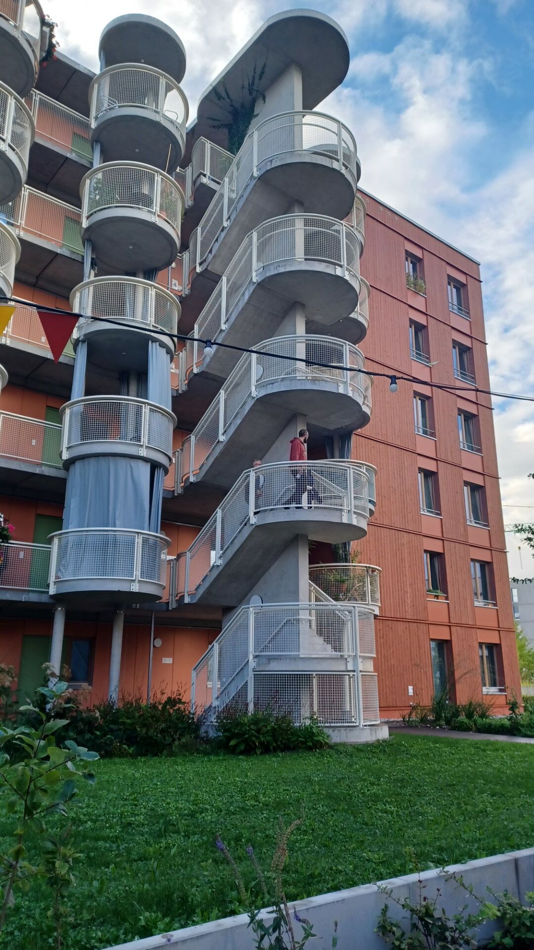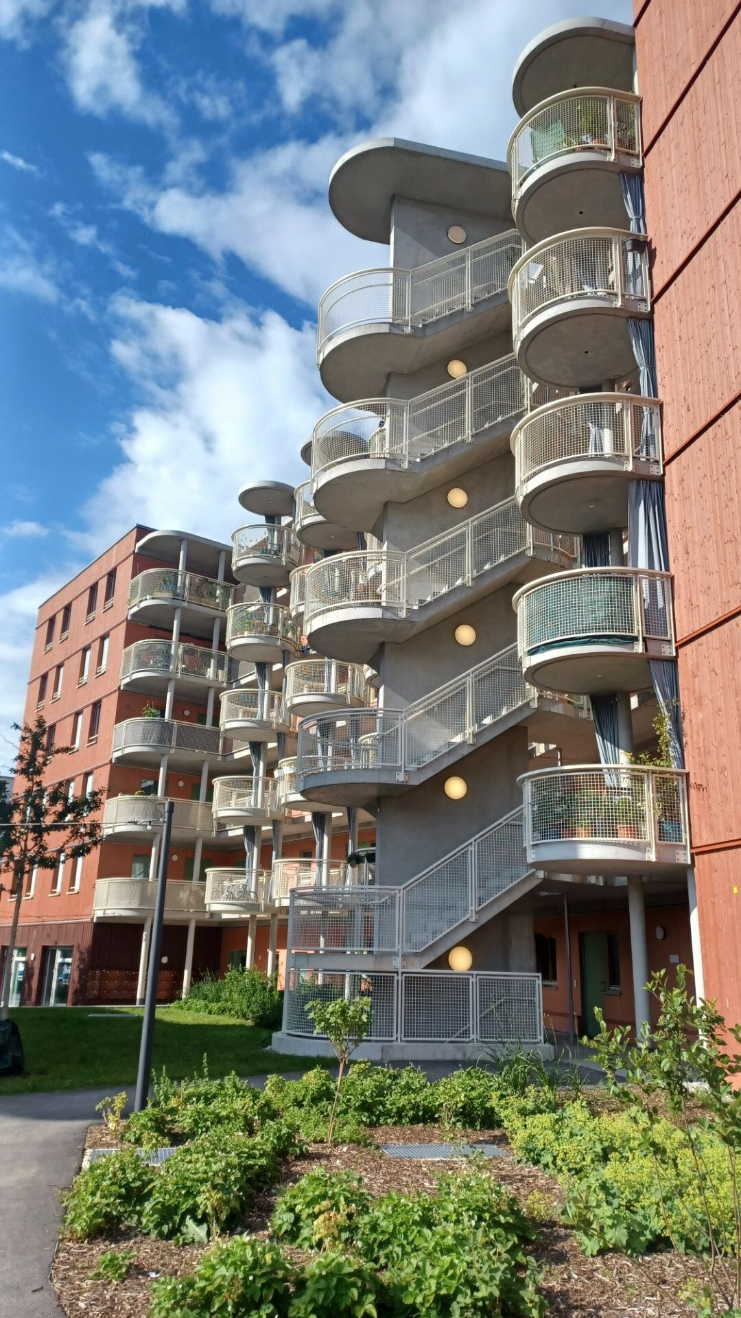 Die Holzfassaden der Häuser sind bewusst farbenfroh gehalten. Ihren besonderen optischen Charakter erhalten diese Häuser aber durch ungewöhnliche, runde Balkone, die in Form und Ausführung an Calypso-Karusselle erinnern.